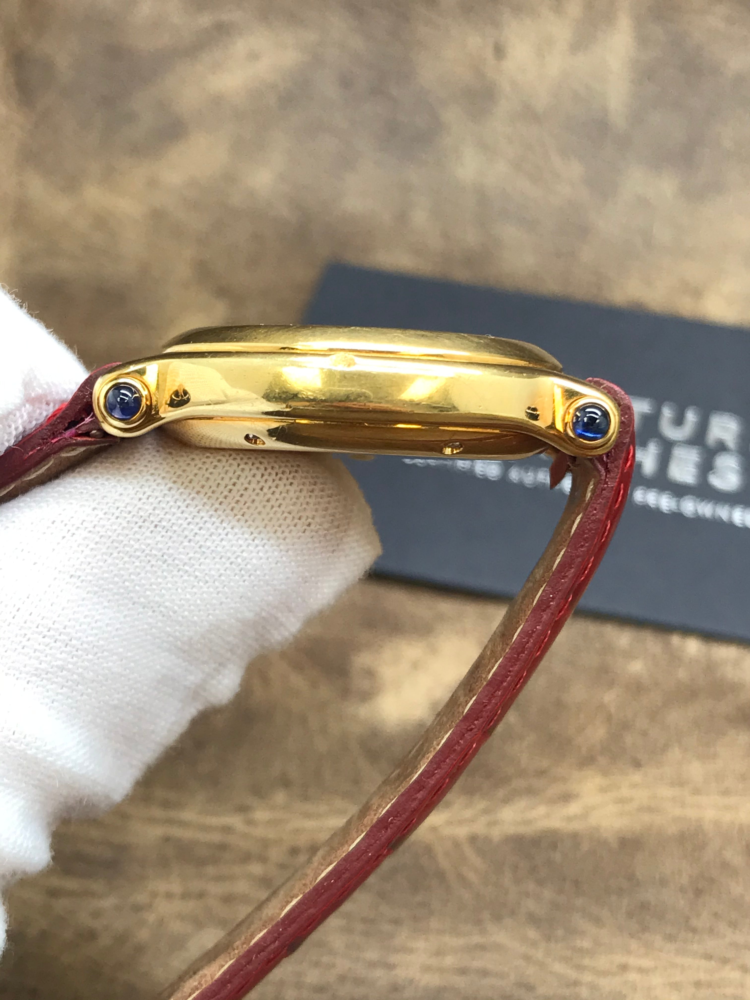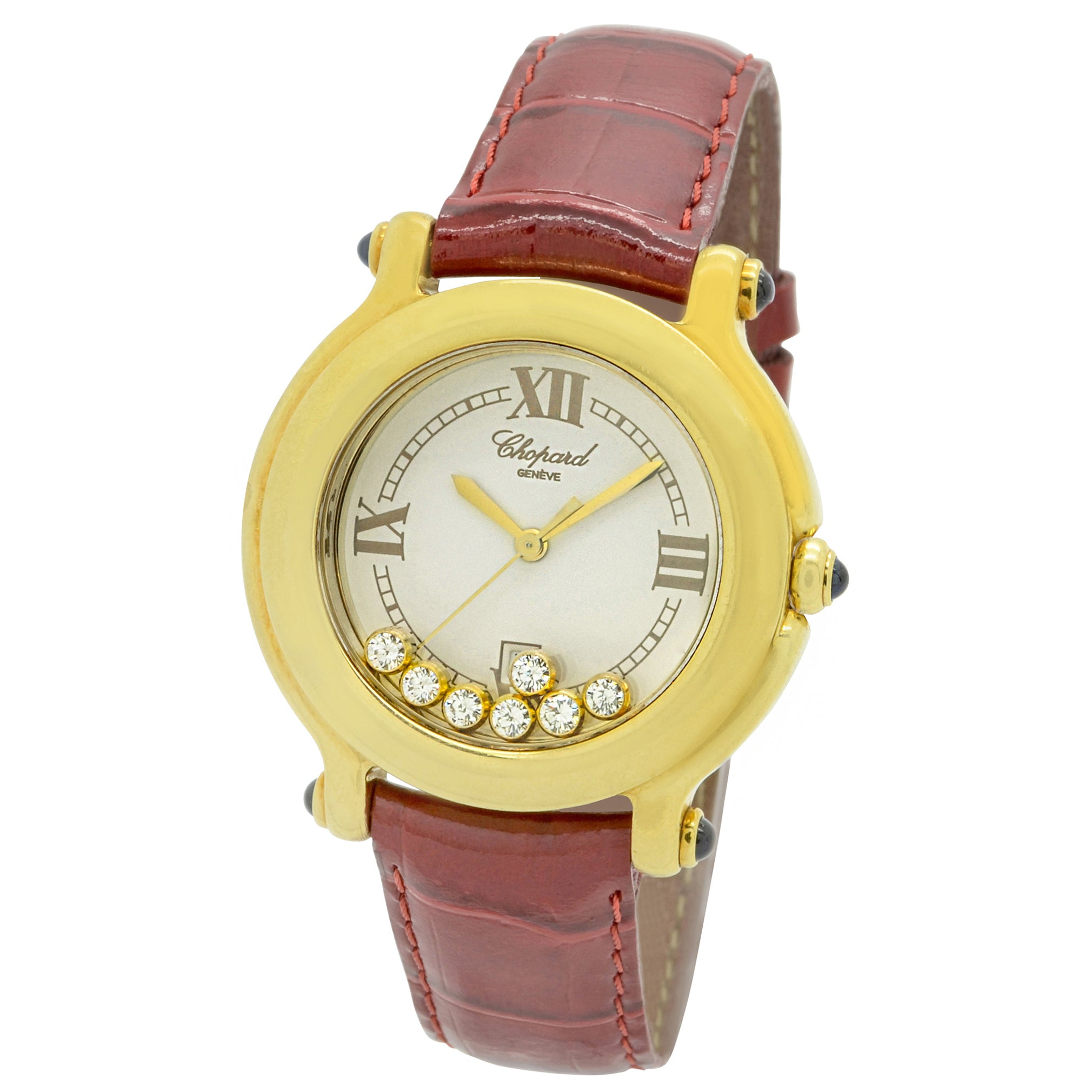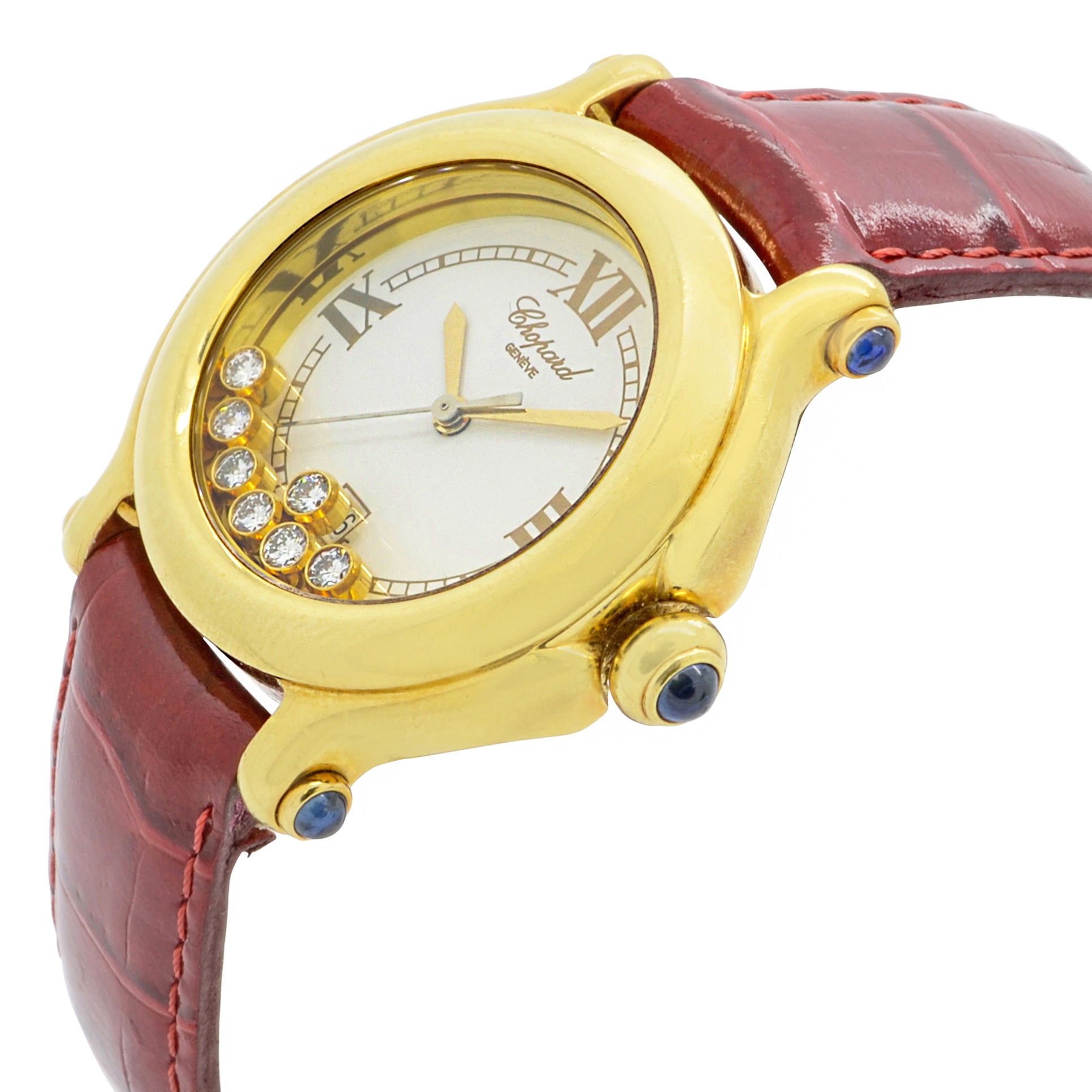 18k yellow gold case with a leather strap. Fixed 18k yellow gold bezel. White dial with gold tone hands and Roman numerals hour markers. Dial type: analog. Quartz movement with about of power reserve. Sapphire crystal. Crown. Solid case back. Case size: 32 mm. Case thickness: mm. Round case shape. Band width: mm. 18k yellow gold tang clasp. Functions: date, hour, minute, seconds. Chopard Happy Sport 27/6144-23 White Dial Quartz Women's Watch.