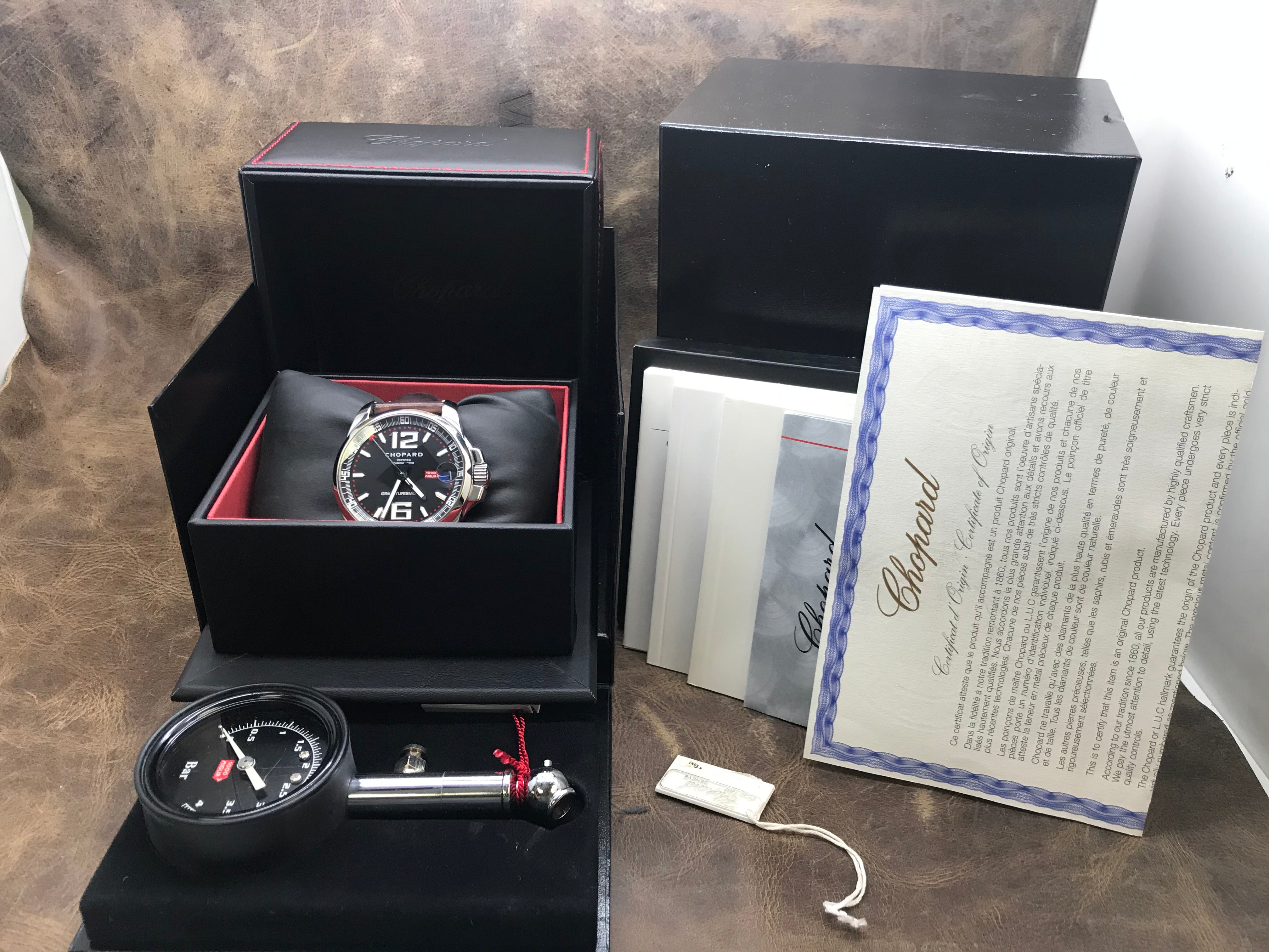 This pre-owned Chopard Mille Miglia 1000 Gran Turismo 16/8997 is in excellent condition and comes with: original Chopard double box, booklets, tag, gauge & warranty papers. Max wrist size: 7.75 in.