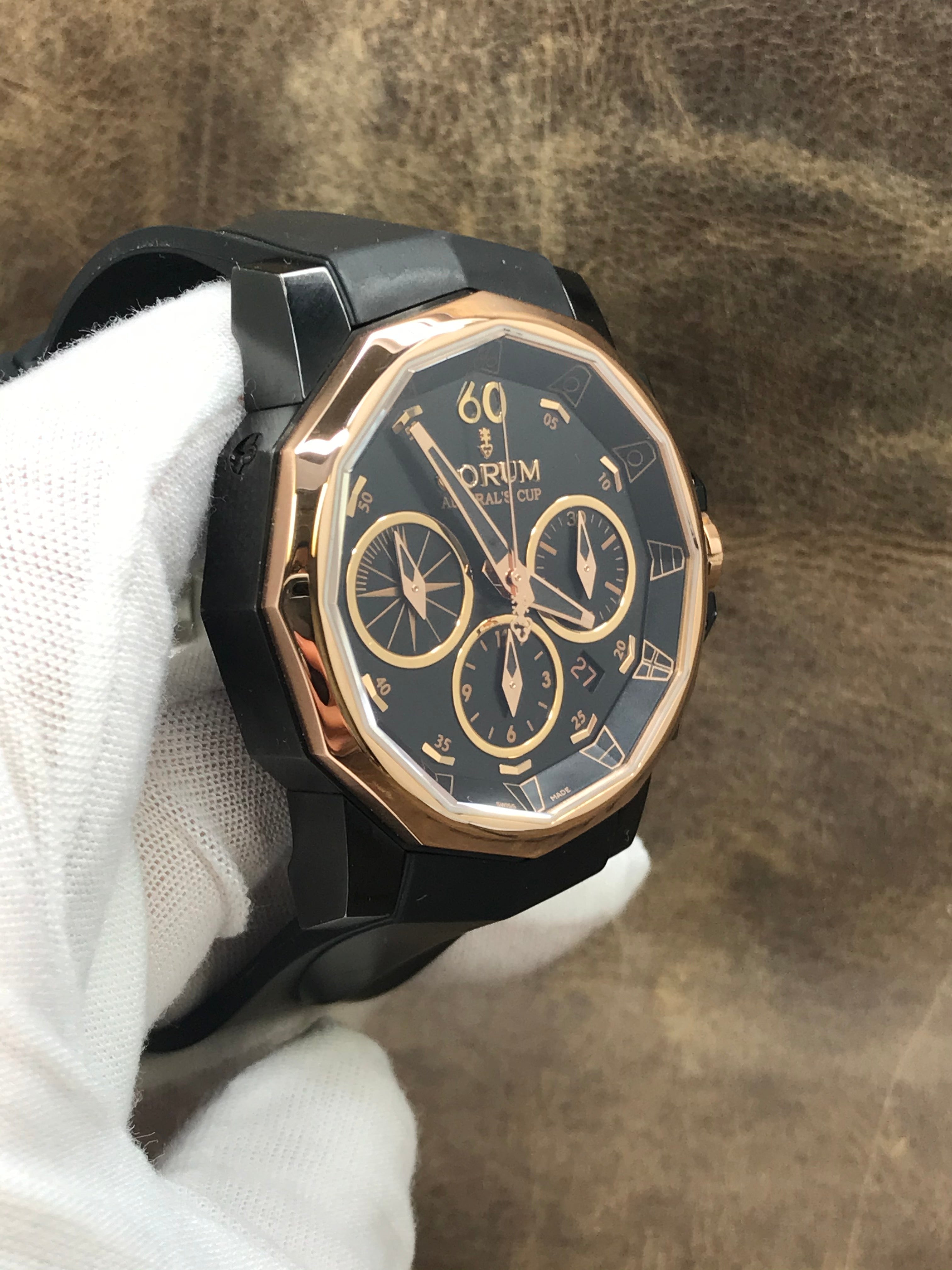 Stainless steel coated pvd case with a rubber strap. Fixed 18k rose gold bezel. Black dial with gold & black hands and index hour markers. Dial type: analog. Automatic movement with about of power reserve. Scratch resistant sapphire crystal. Gold screwdown crown. Transparent case back. Case size: 45 mm. Case thickness: mm. Round case shape. Band width: mm. Stainless steel deployment clasp. Functions: date, chronograph, hour, minutes, seconds. Corum Admirals Cup 01.0064 Black Dial Automatic Men's Watch.