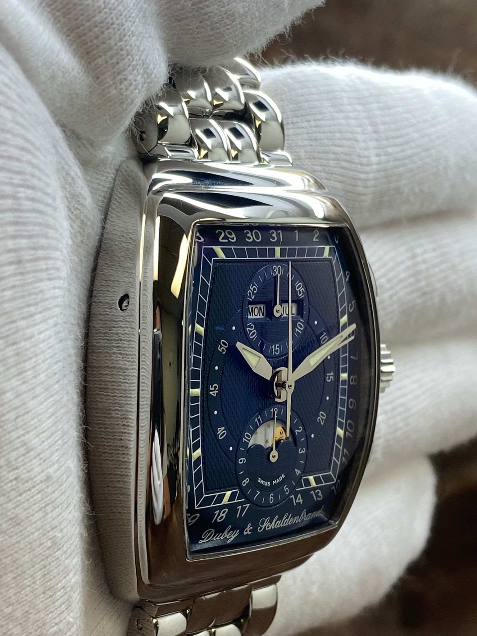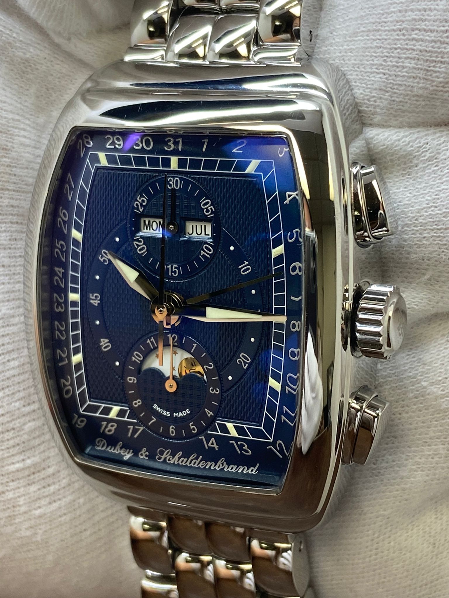 Stainless steel case with a stainless steel bracelet. Fixed stainless steel bezel. Blue dial with luminous silver-tone hands and index hour markers. Dial type: analog. Eta caliber 7751 automatic movement with about of power reserve. Sapphire crystal. Crown. Transparent case back. Case size: 38 x 48 mm. Case thickness: 15 mm. Tonneau case shape. Band width: mm. Double fold-over with push button release clasp. Water resistant at 30 meters / 100 feet. Functions: chronograph, moonphase, day, month, date, . Dubey & Schaldenbrand Triple Calendar Moonphase Gran Chrono Astro Blue Dial Automatic Men's Watch.