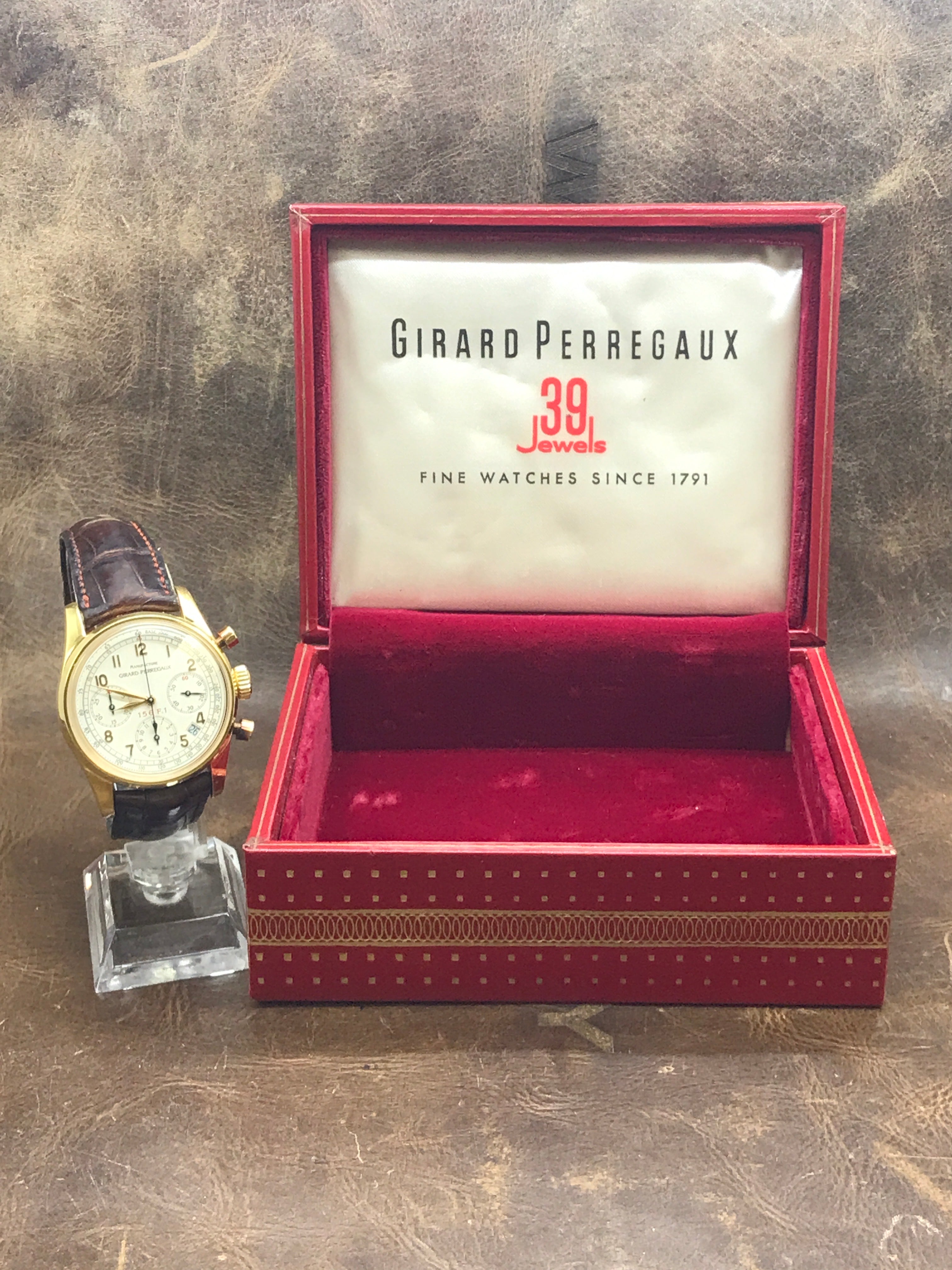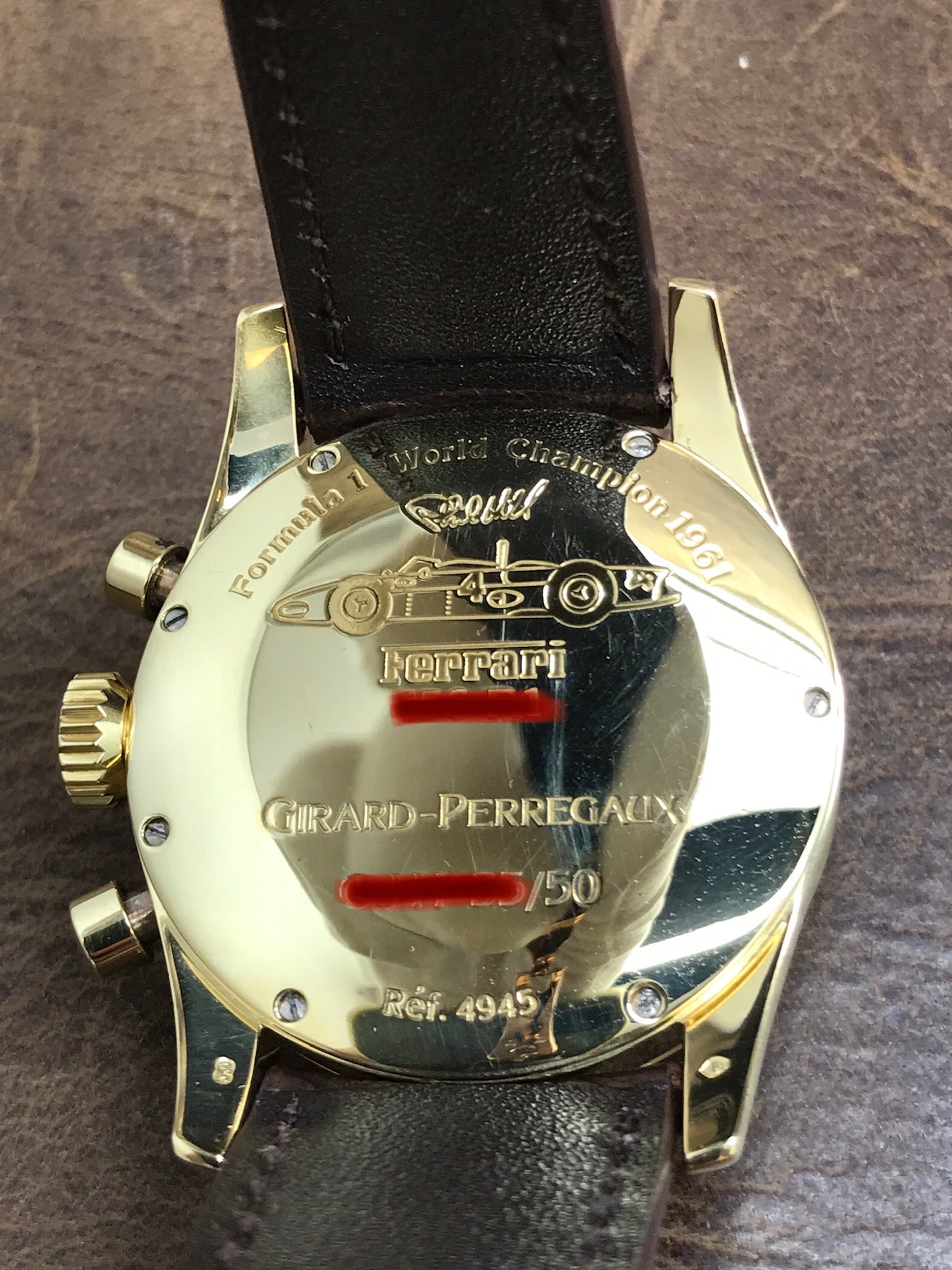 This pre-owned Girard Perregaux Ferrari 156 F.1 L.E 50pcs Chronograph 4945 is in excellent condition and comes with: original Girard Perregaux box only. Max wrist size: 7.5 in.