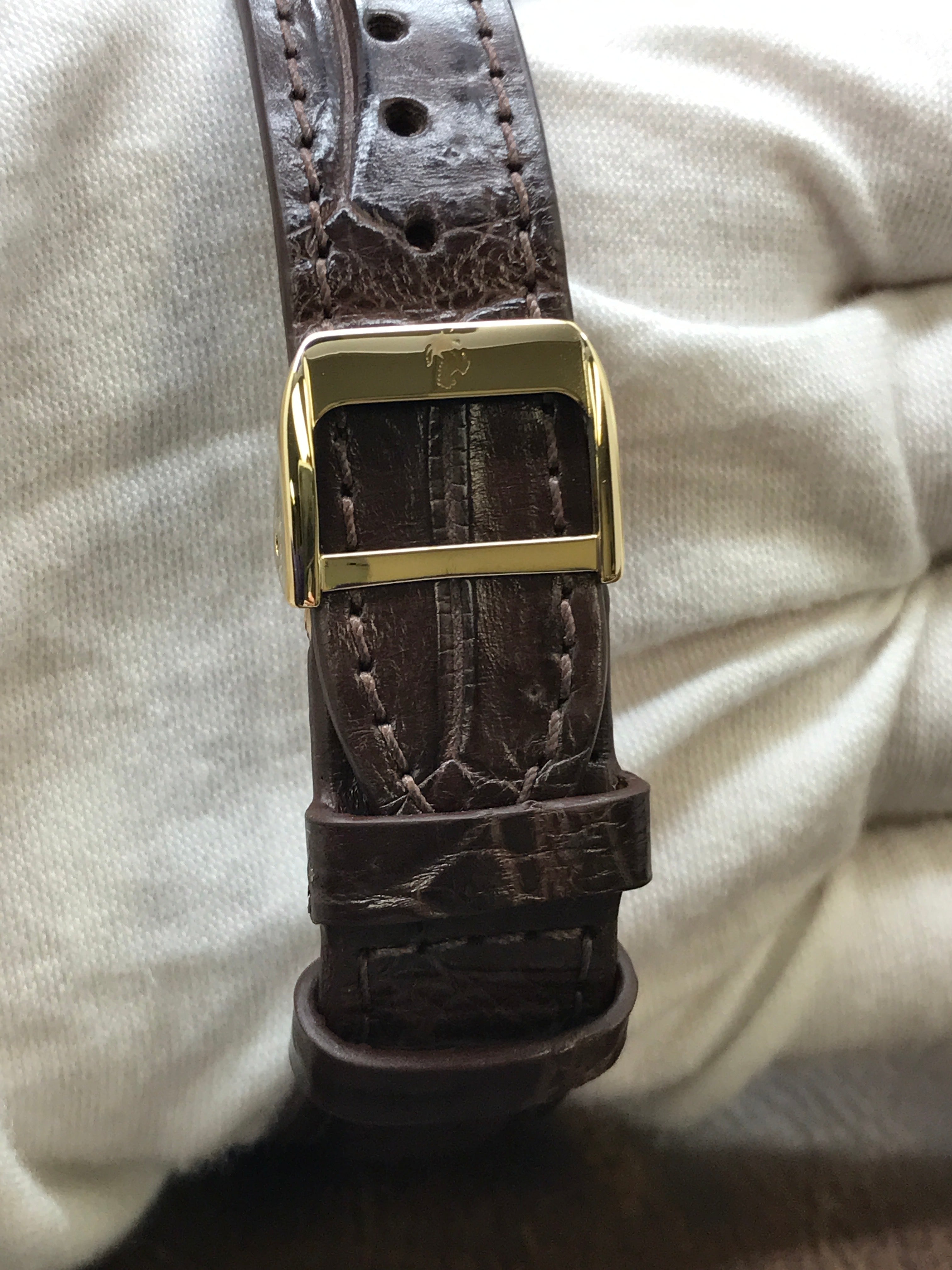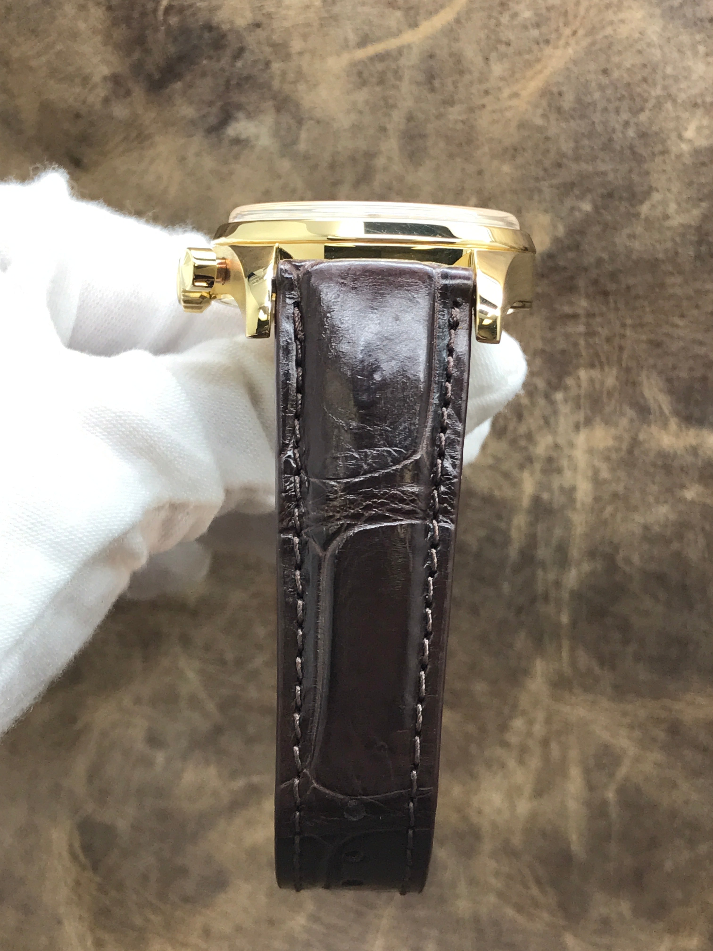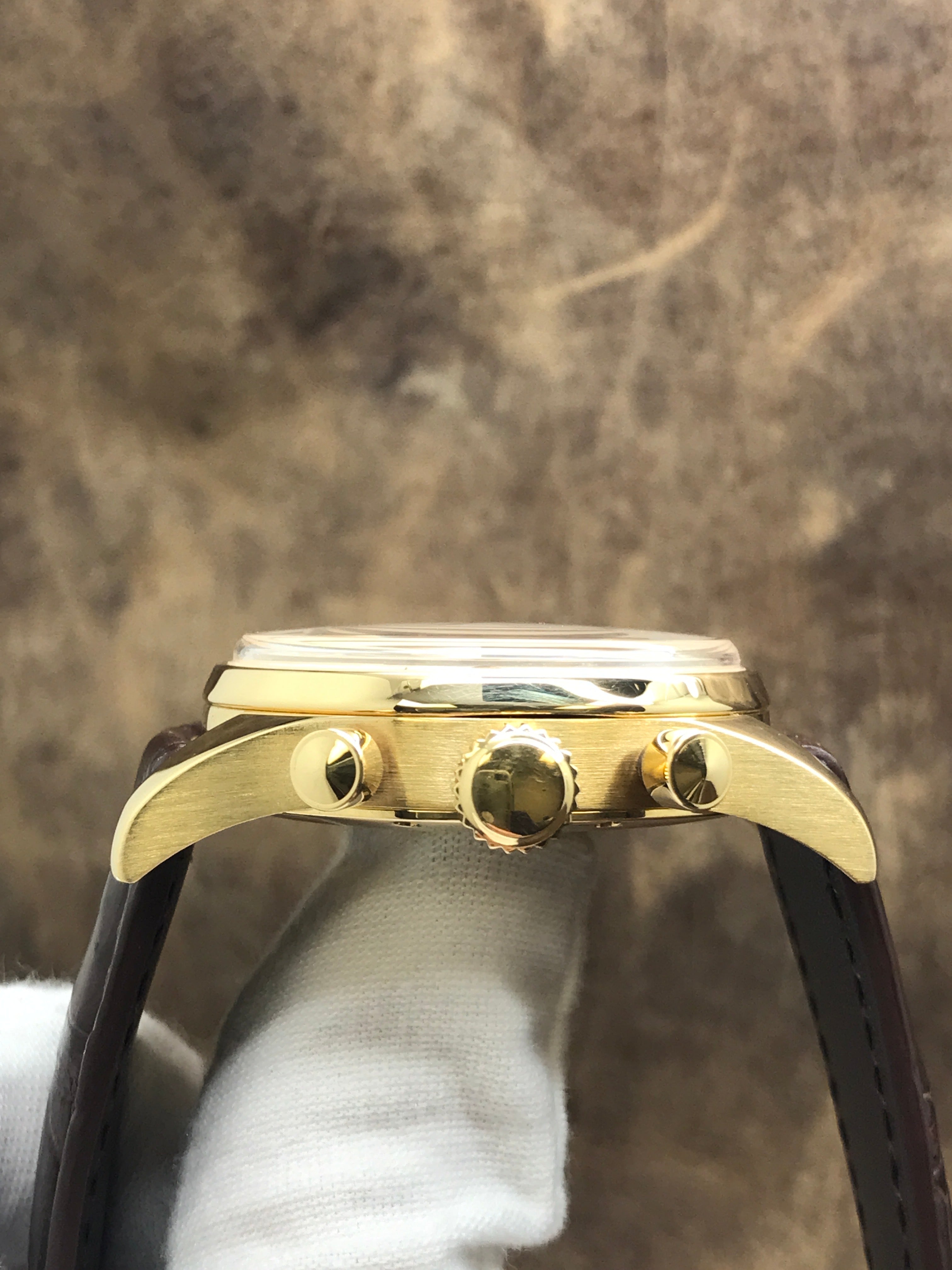 - Features Date; hour; minute; seconds; tachymeter; chronograph; gold; leather; strap