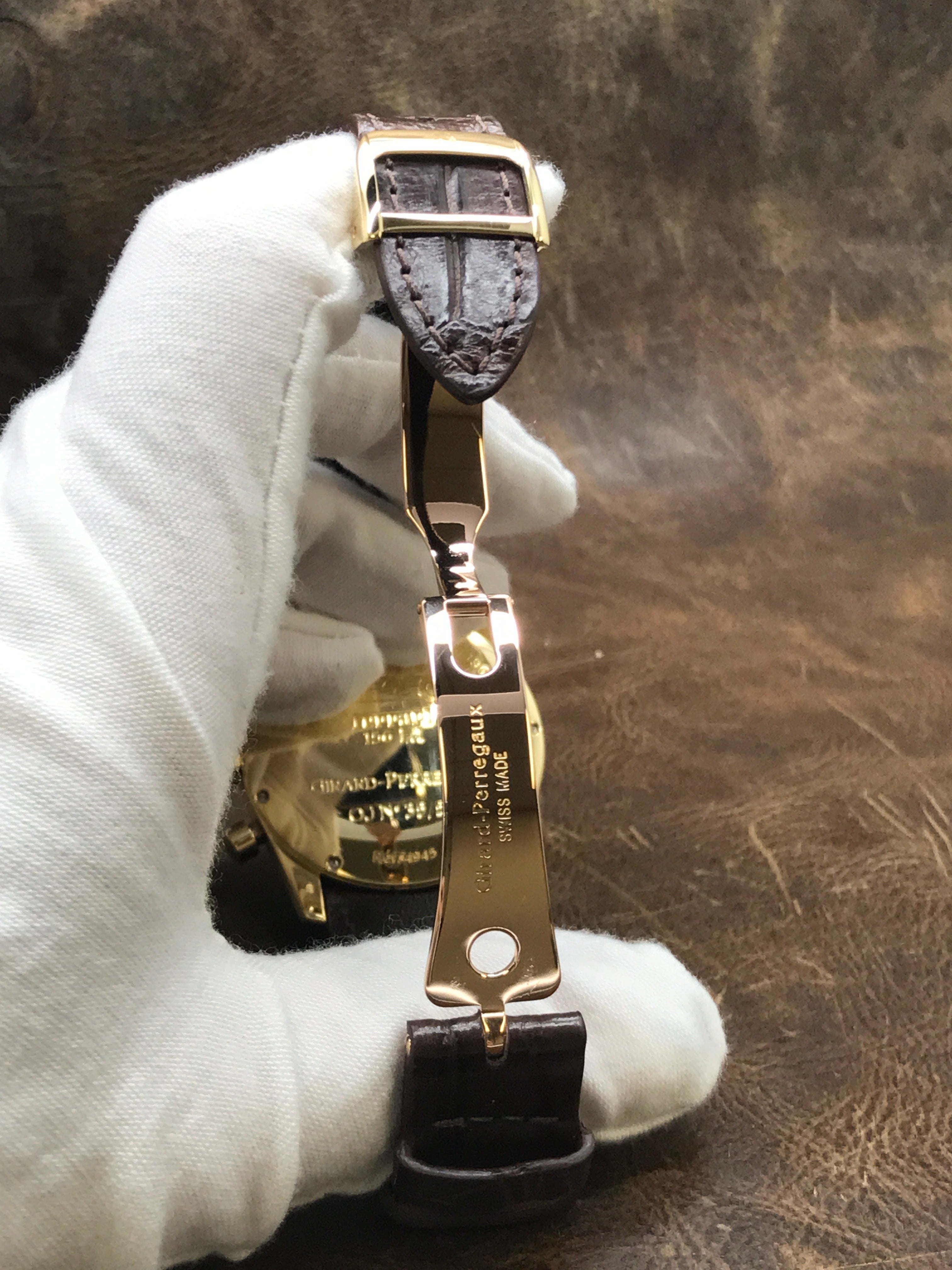 18k yellow gold case with a custom leather strap custom leather. Fixed 18k yellow gold bezel. Ivory dial with gold-tone hands and Arabic numeral hour markers. Dial type: analog. Girard Perregaux 3080 automatic movement with about 42 of power reserve. Sapphire crystal. Crown. Solid case back. Case size: 38 mm. Case thickness: 13 mm. Round case shape. Band width: mm. 18k yellow gold deployment clasp. Water resistant at none. Functions: date, hour, minute, seconds, tachymeter, chronograph. Girard Perregaux Ferrari 156 F.1 L.E 50pcs Chronograph 4945 Ivory Dial Automatic Men's Watch.