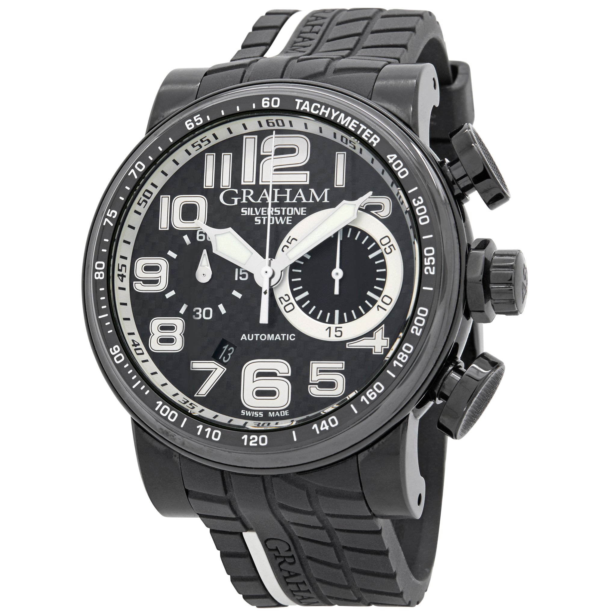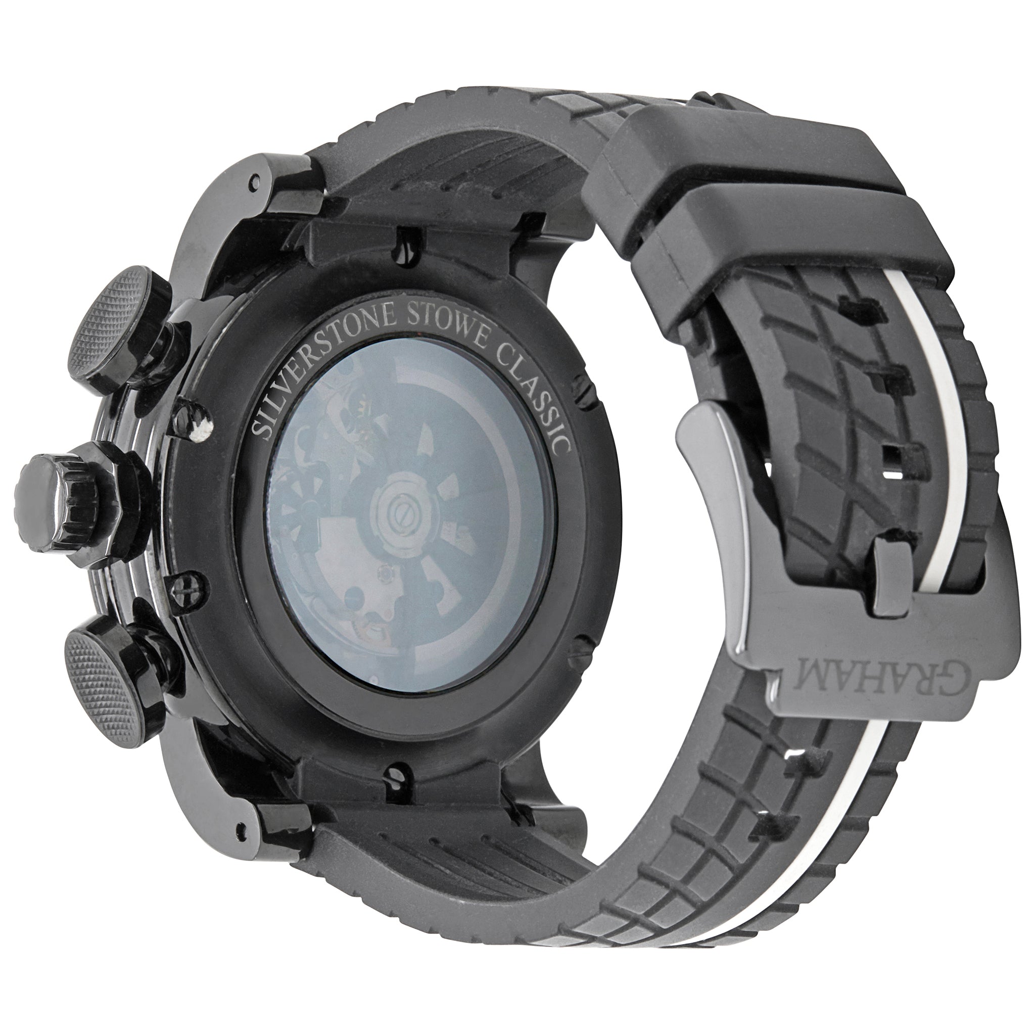 Stainless steel with pvd coating case with a rubber strap. Fixed - tachymeter ceramic bezel. Black dial with silver tone luminous hands and luminous Arabic numerals hour markers. Dial type: analog. Graham g1742 automatic movement with about 48 hours of power reserve. Scratch resistant sapphire crystal. Screw-down crown. Exhibition case back. Case size: 48 mm. Case thickness: 17 mm. Round case shape. Band width: 21 mm. Buckle clasp. Water resistant at 100m/330ft. Functions: hours, minutes, seconds, date, chronograph. Graham Silverstone Stowe Racing AN.2BLDC.7 Black Dial Automatic Men's Watch.