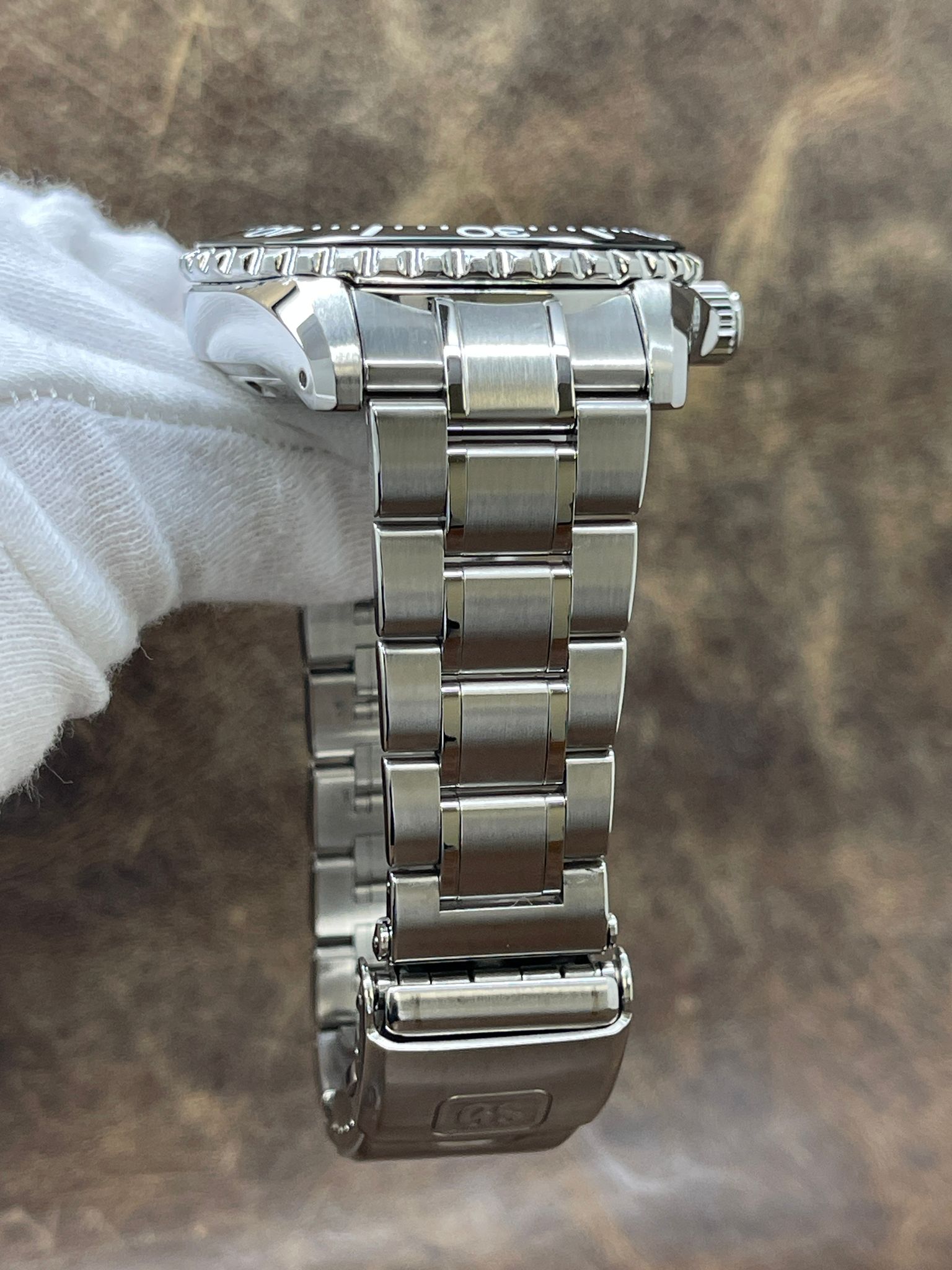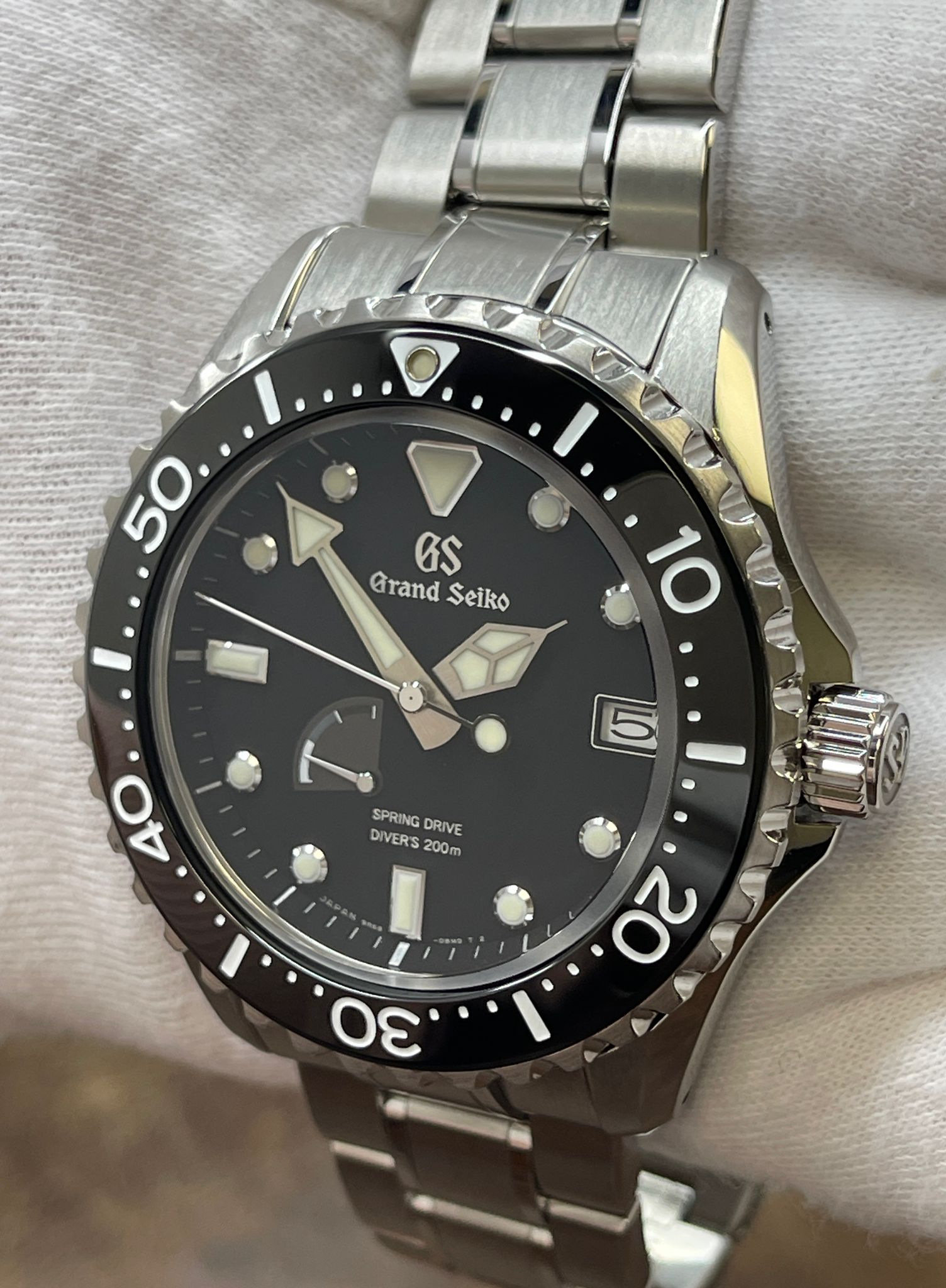 Stainless steel case with a stainless steel bracelet. Uni-directional rotating stainless steel with a titanium carbide ceramic insert bezel. Black dial with luminous silver-tone arrow-shaped hands and luminous dot & index hour markers. Dial type: analog. 9r65 spring drive movement with about 72 of power reserve. Sapphire w/anti-reflective coating on inner surface crystal. Screw down crown. Solid case back. Case size: 44 mm. Case thickness: 14 mm. Round case shape. Band width: mm. Diver expansion clasp. Water resistant at 200 meters / 660 feet. Functions: date, hour, minute, seconds, power reserve. Grand Seiko Spring Drive Diver SBGA229 Black Dial Spring Drive Men's Watch.
