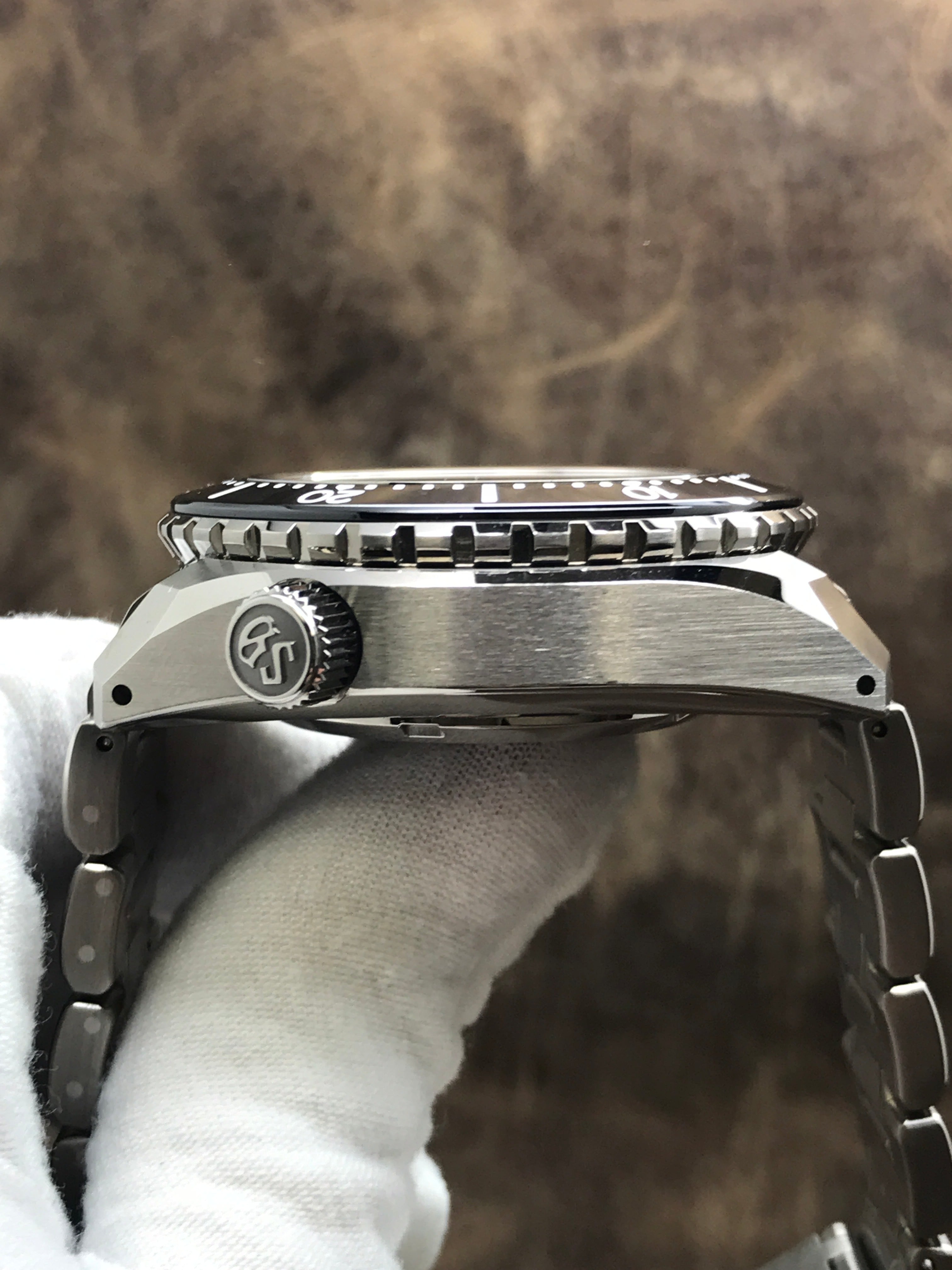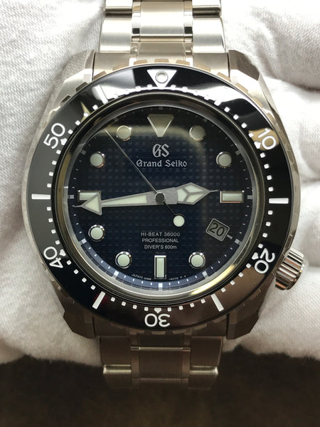 Titanium case with a titanium bracelet. Uni-directional rotating stainless steel bezel with a black ceramic top ring bezel. Blue dial with silver tone luminous hands and dot hour markers. Dial type: analog. Grand Seiko caliber 9s85 automatic movement with about 55 of power reserve. Scratch resistant sapphire crystal. Screw down crown. Solid case back. Case size: 46.9 mm. Case thickness: 17 mm. Round case shape. Band width: mm. Fold over with push button release clasp. Water resistant at 600 meters / 2000 feet. Functions: date, hour, minute, second. Grand Seiko SBGH257 Blue Dial Automatic Men's Watch.