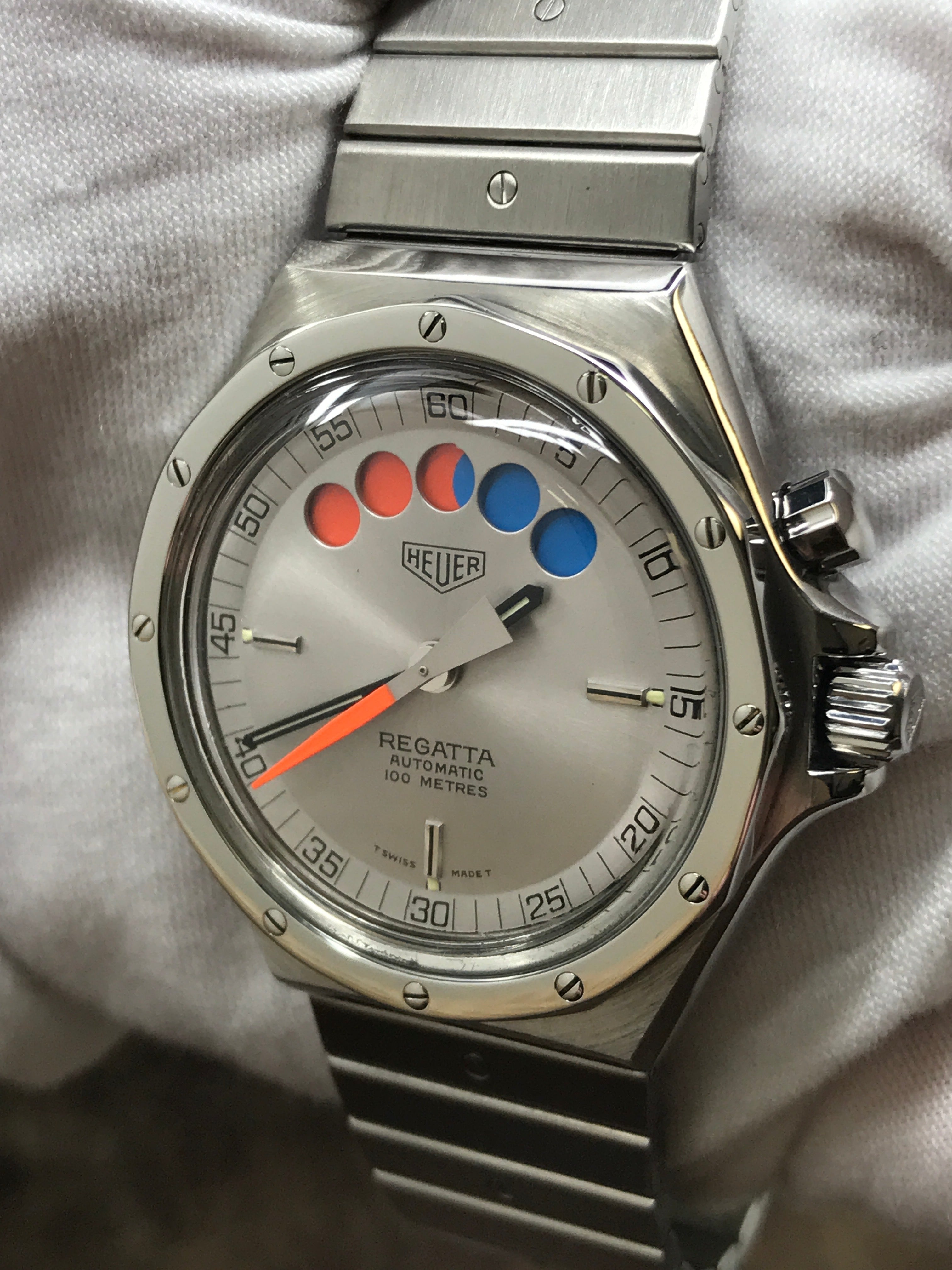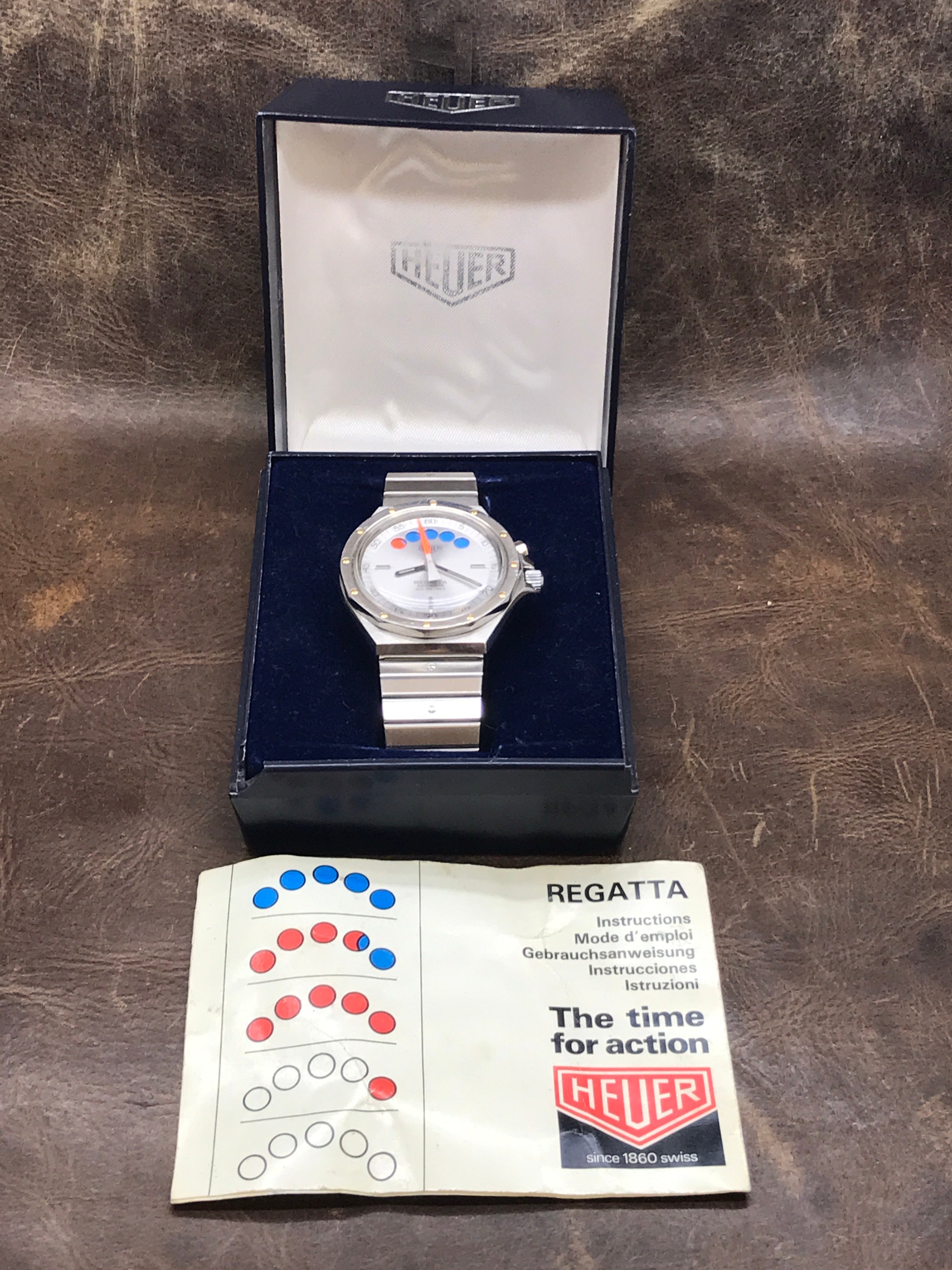 This pre-owned Heuer Regatta Yacht-Timer 134.500 is in excellent condition and comes with: original Heuer box and booklet only. The crystal has a few minor marks on it. Max wrist size: 7.25 in.