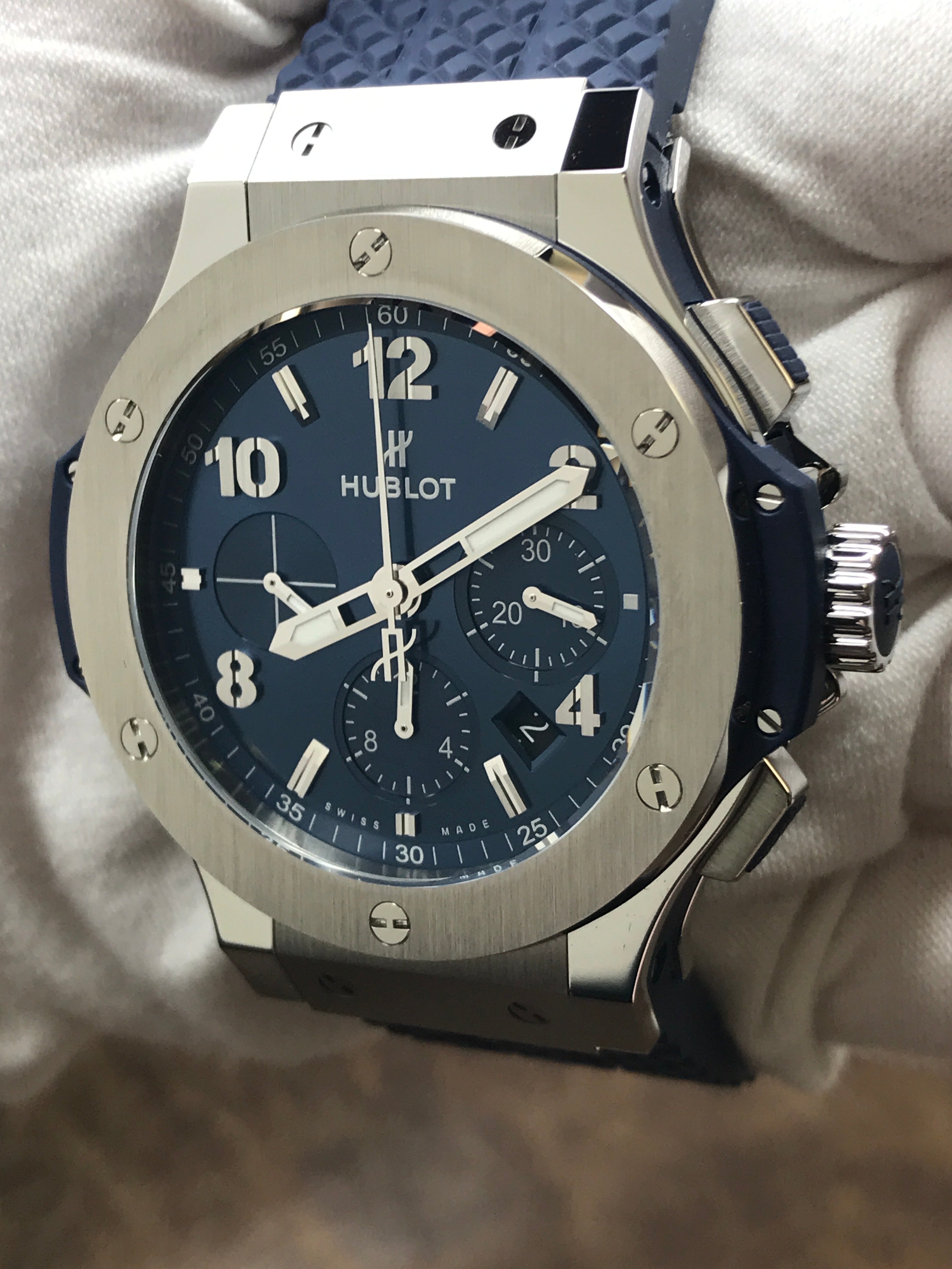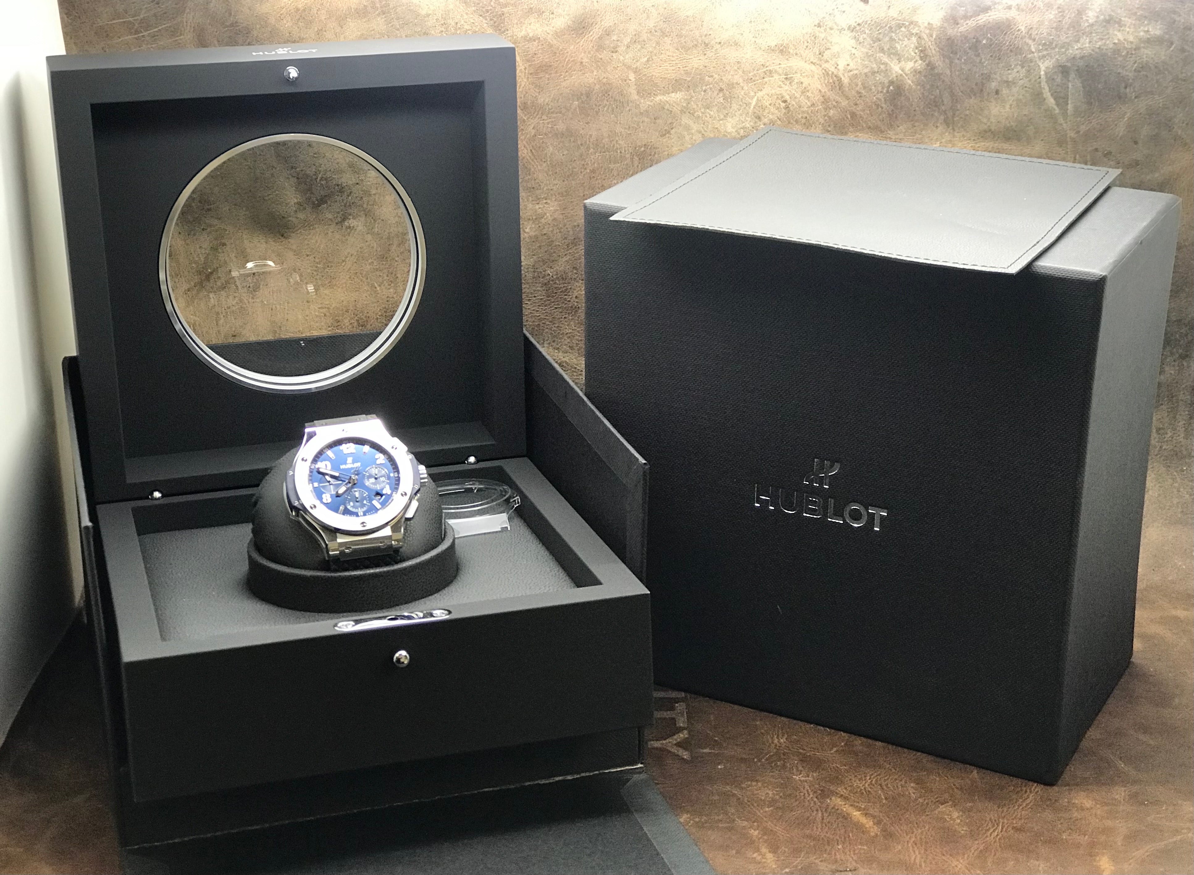Stainless steel case with a rubber strap. Fixed stainless steel bezel. Blue dial with luminous silver-tone skeleton hands and index & Arabic numerals hour markers. Dial type: analog. Hublot calibre hub4100 automatic movement with about 42 of power reserve. Scratch resistant sapphire crystal. Pull/push crown. Transparent case back. Case size: 44 mm. Case thickness: 14.5 mm. Round case shape. Band width: mm. Fold over with push button release clasp. Water resistant at 100 meters / 330 feet. Functions: chronograph, date, hour, minute, second. Hublot Big Bang 44mm Chronograph 301.SX.710.RX Blue Dial Automatic Men's Watch.