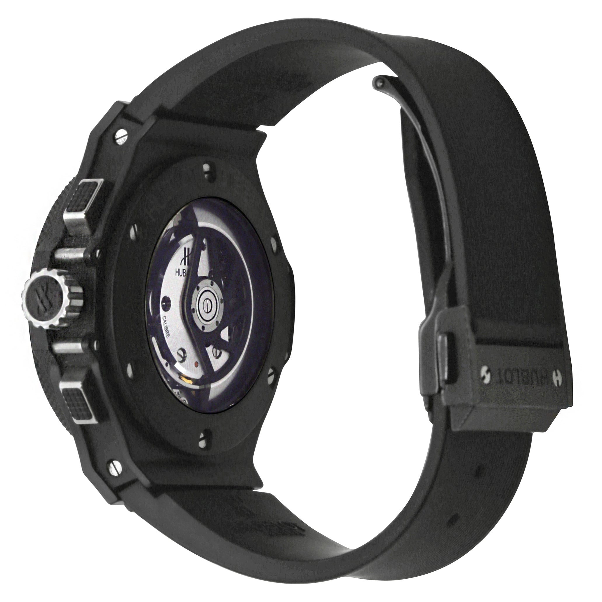 Ceramic case with a rubber strap. Fixed ceramic bezel. Carbon fiber dial with luminous hands and index hour markers. Dial type: analog. Luminescent hands and markers. Hub4100 automatic movement with about 42 hours of power reserve. Sapphire crystal. Fluted stainless steel crown. See through case back. Case size: 44.5 mm. Case thickness: 14.5 mm. Round case shape. Band width: 23 mm. Deploment clasp. Functions: chronograph, date, hour, minute, second. Hublot Big Bang Ceramic Black Magic Chrono 301.CI.1770.RX Carbon Fiber Dial Automatic Men's Watch.
