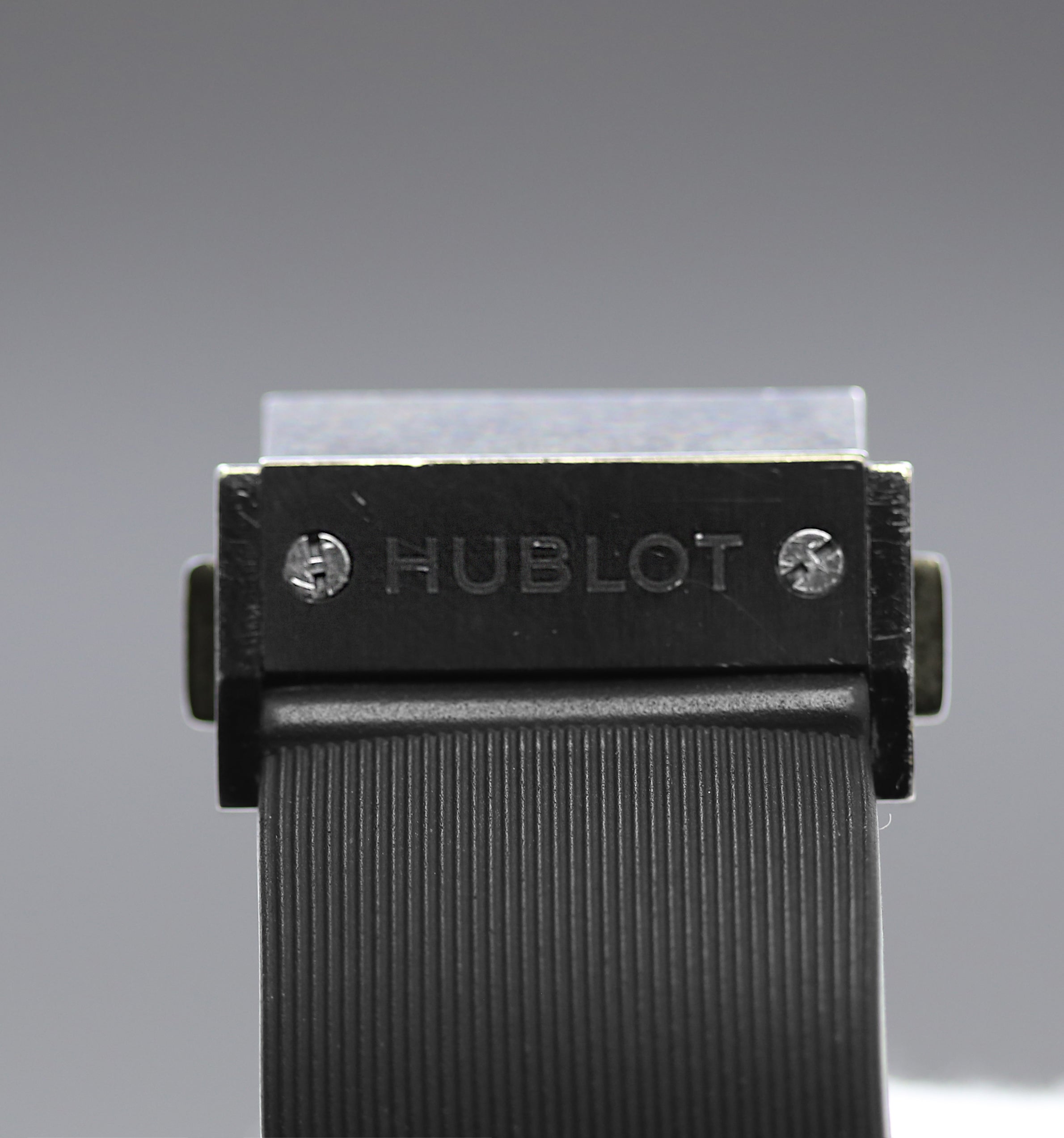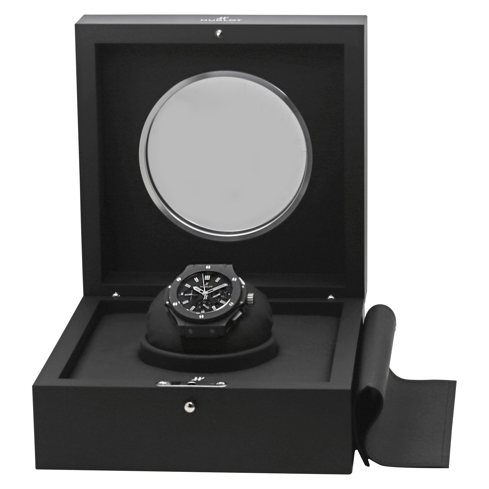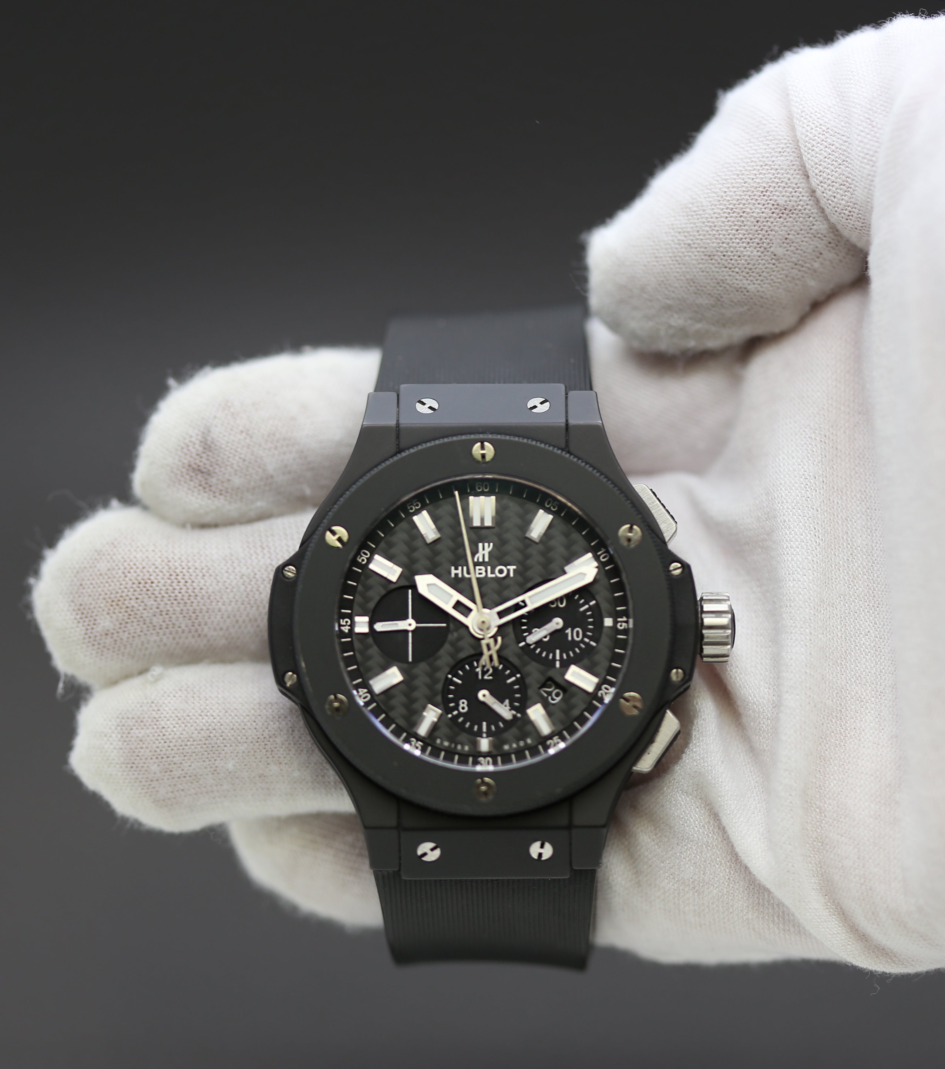 This pre-owned Hublot Big Bang Ceramic Black Magic Chrono 301.CI.1770.RX is in excellent condition and comes with: Box only. Minor hairlines on crystal, thin rash on ovd coating on bezel near the edge between 8-9 oclock.