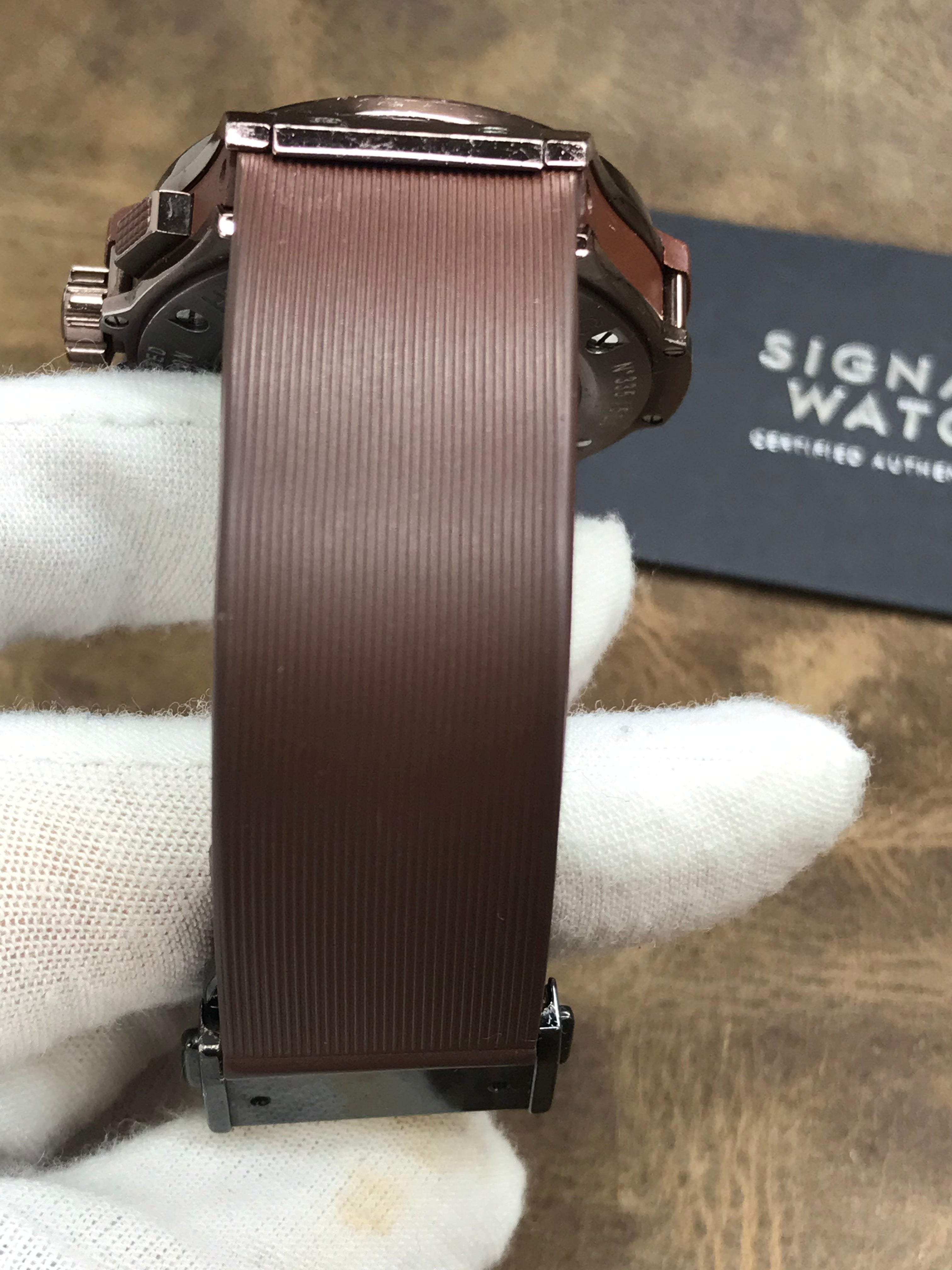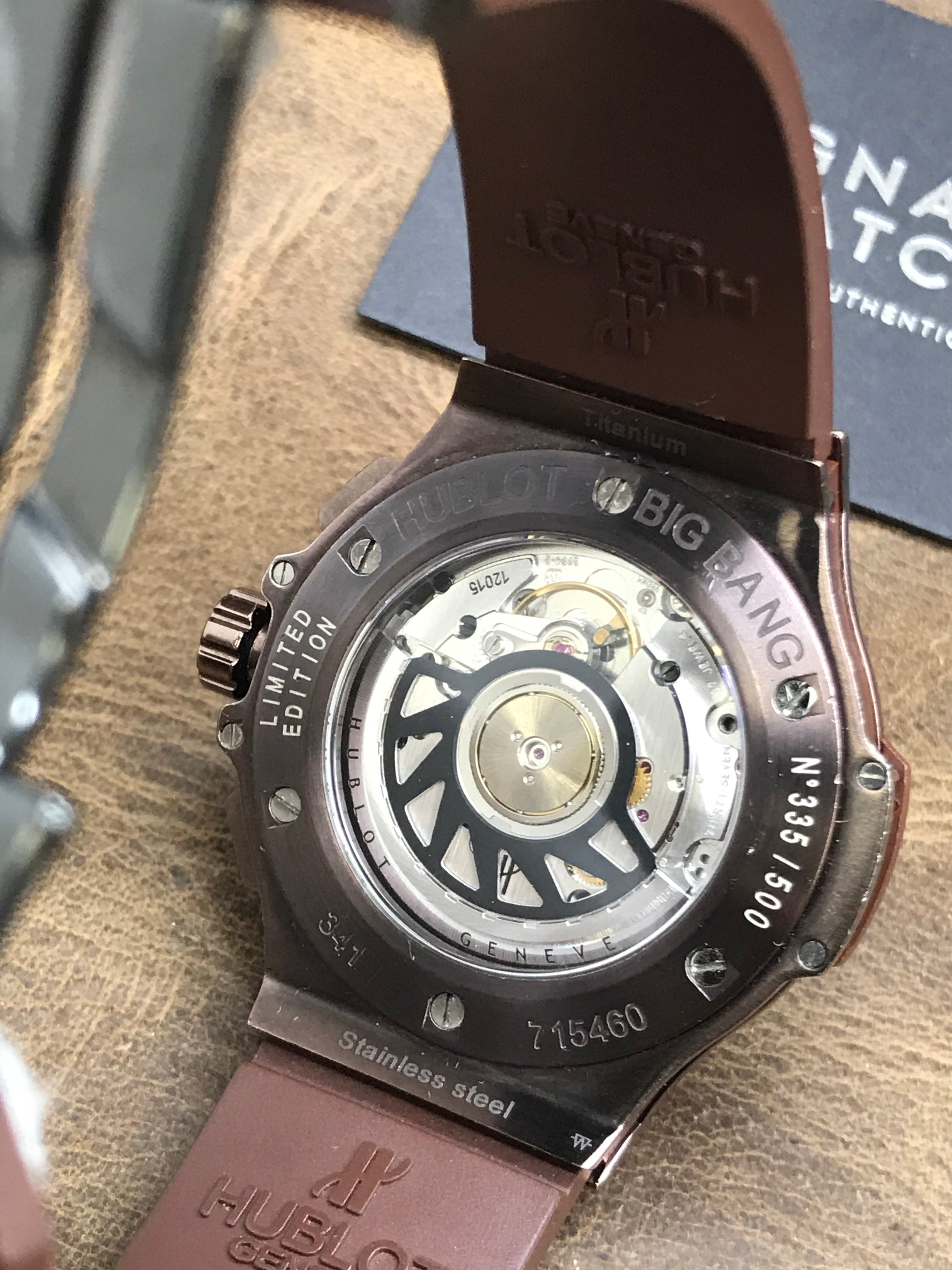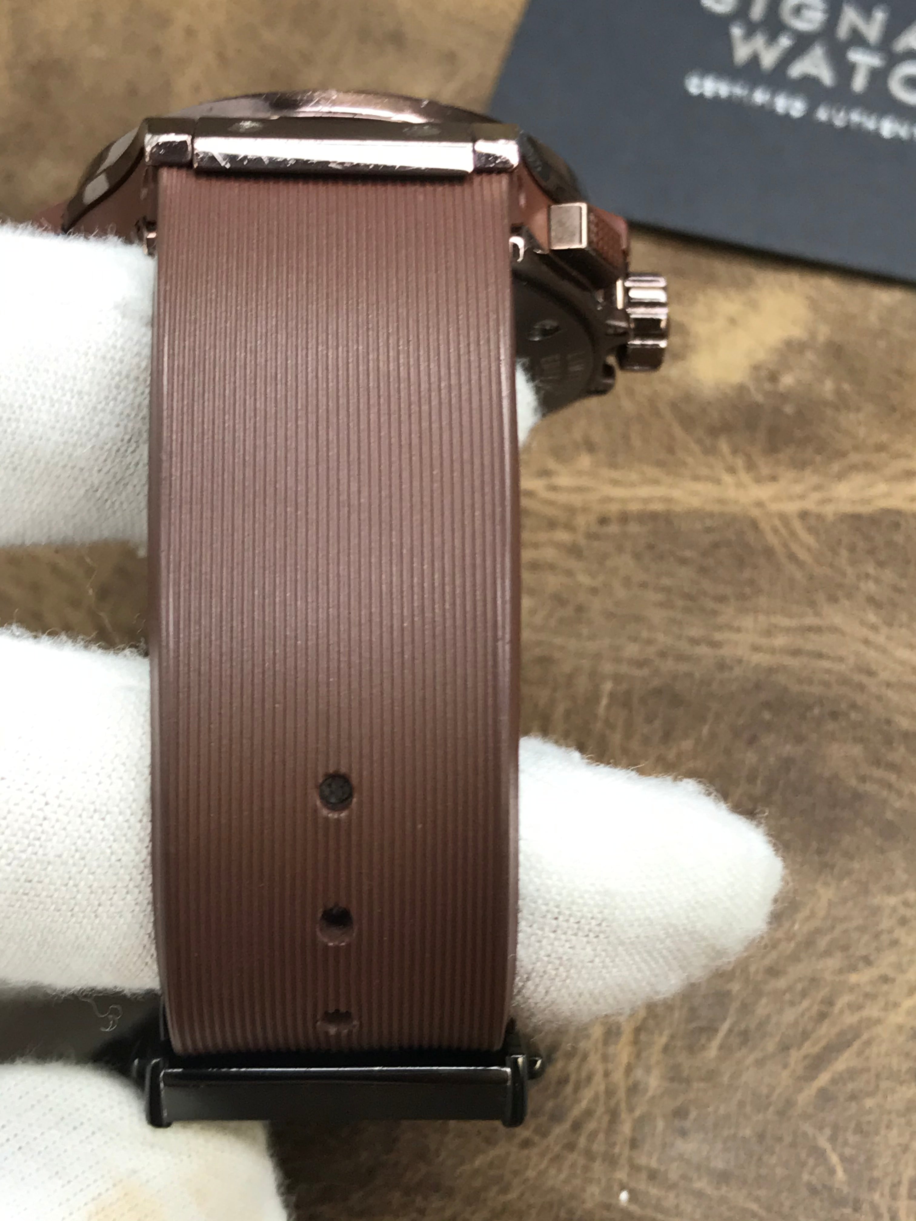 Chocolate pvd stainless steel case with a rubber strap. Fixed stainless steel bezel. Chocolate dial with silver tone hands and Arabic numeral and index hour markers. Dial type: analog. Automatic movement with about of power reserve. Sapphire crystal. Crown. See through case back. Case size: 41 mm. Case thickness: 14.5 mm. Round case shape. Band width: mm. Deployment clasp. Water resistant at 100 meters / 330 feet. Functions: chronograph, date, hour, minute, second. Hublot Big Bang Limited 341.SL.1008.RX Chocolate Dial Automatic Men's Watch.
