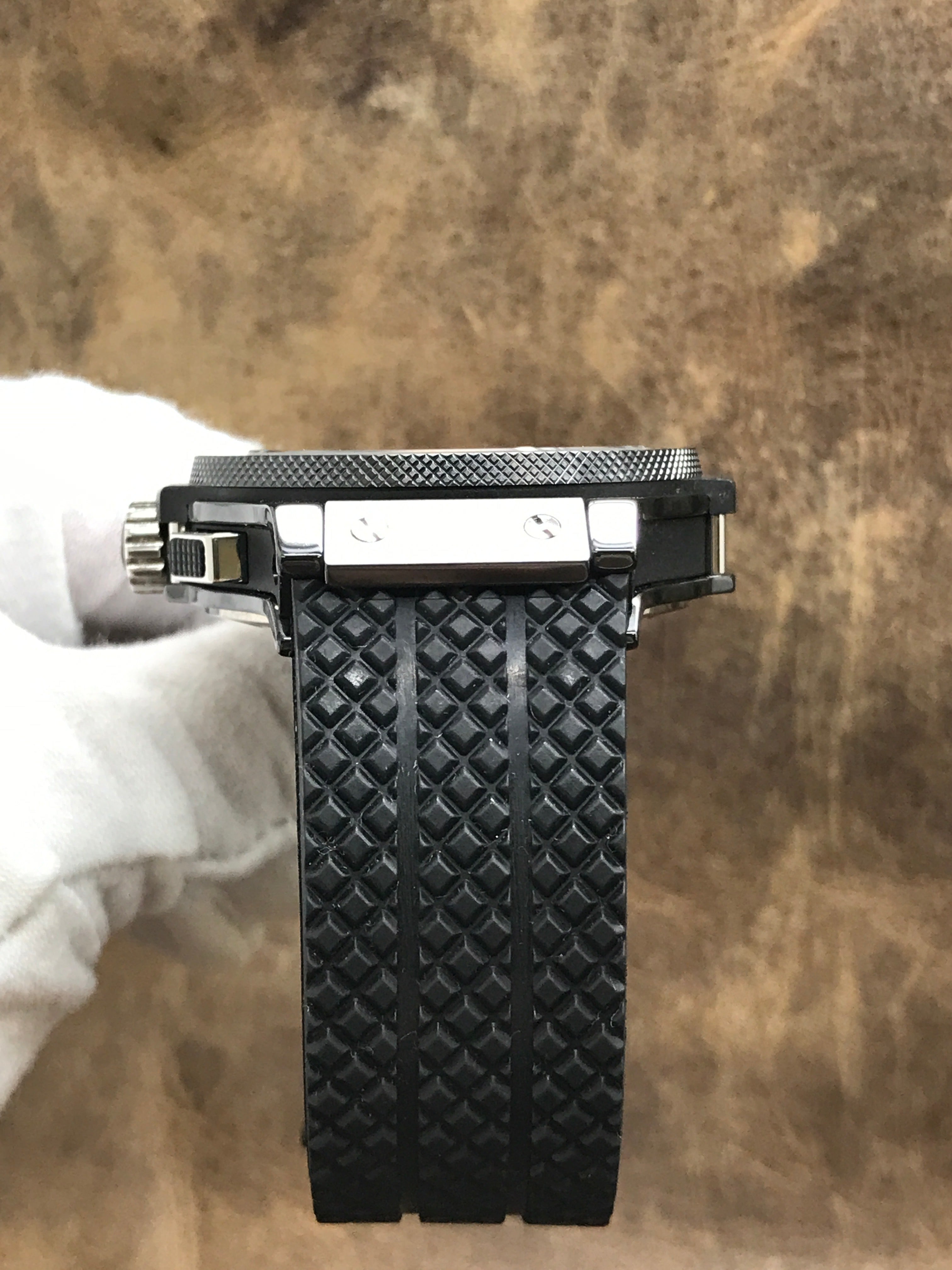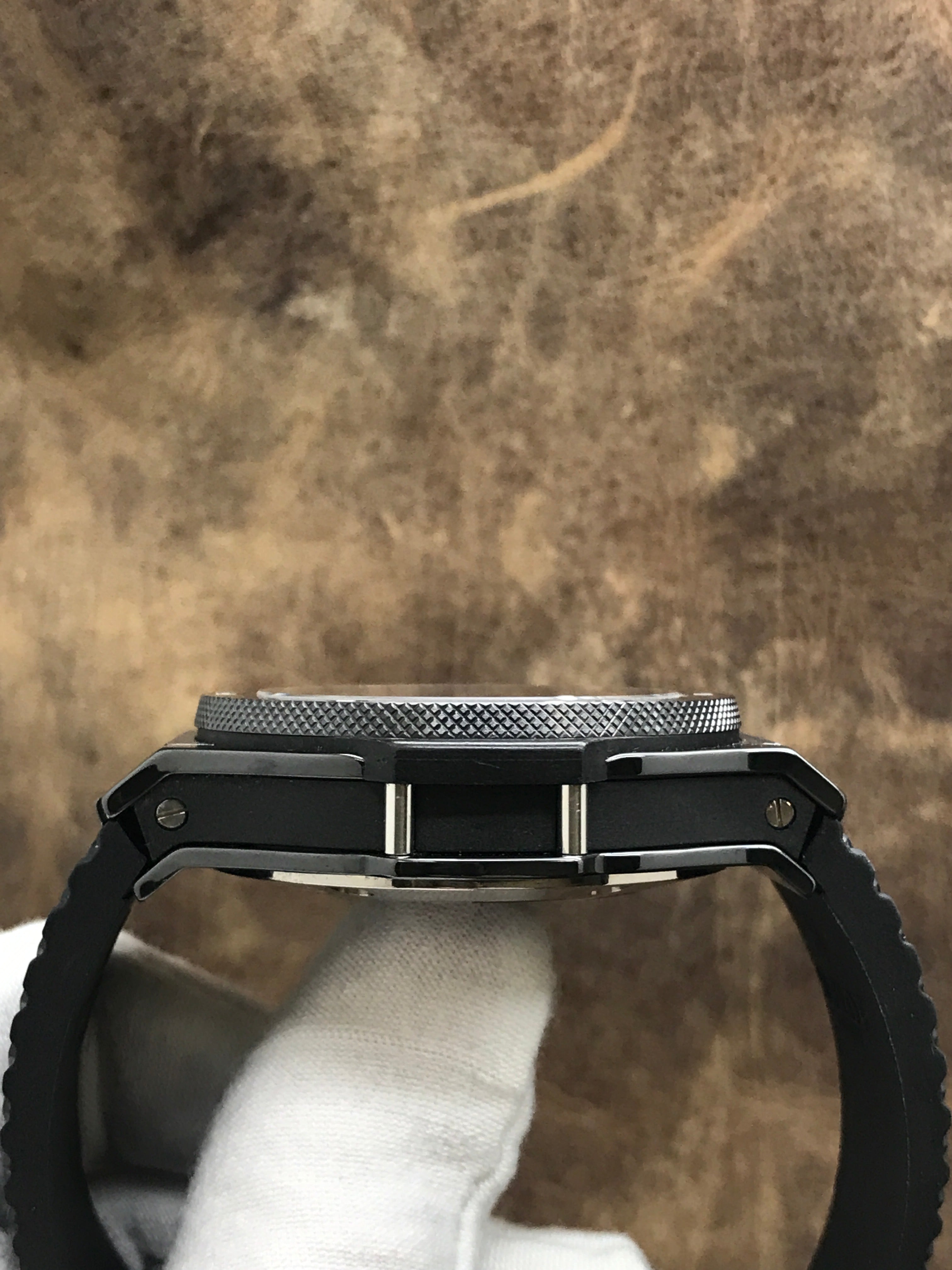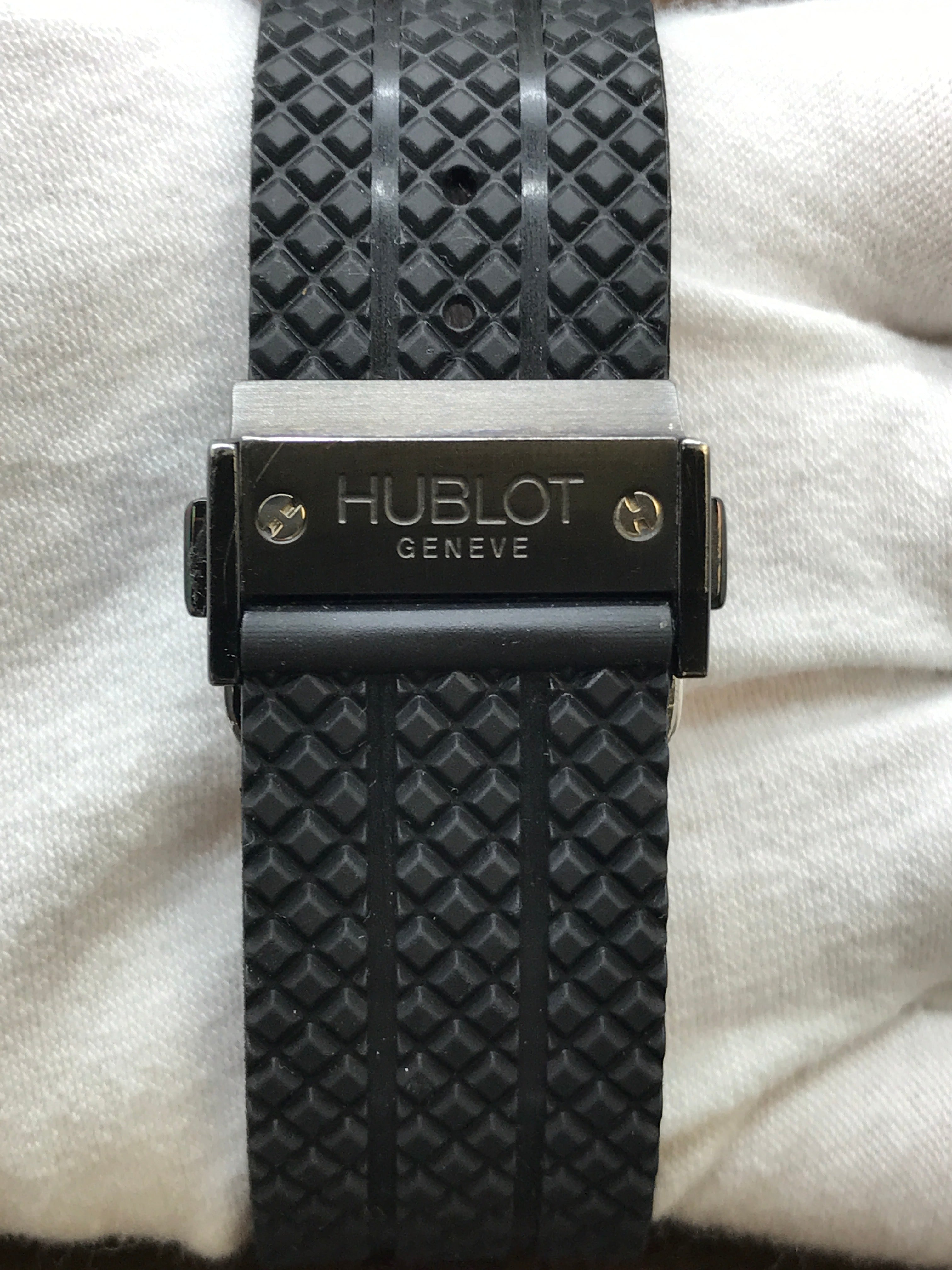 This pre-owned Hublot Big Bang Black Magic 301.CM.130.RX is in very good condition and comes with: NO box or papers. The bezel has some marks mainly between 10-2 o'clock and near 6. The screws and the buckle are scratched and the buckle has also some parts that the coating is worn out. The strap is a custom replacement. Max wrist size: 8 in.