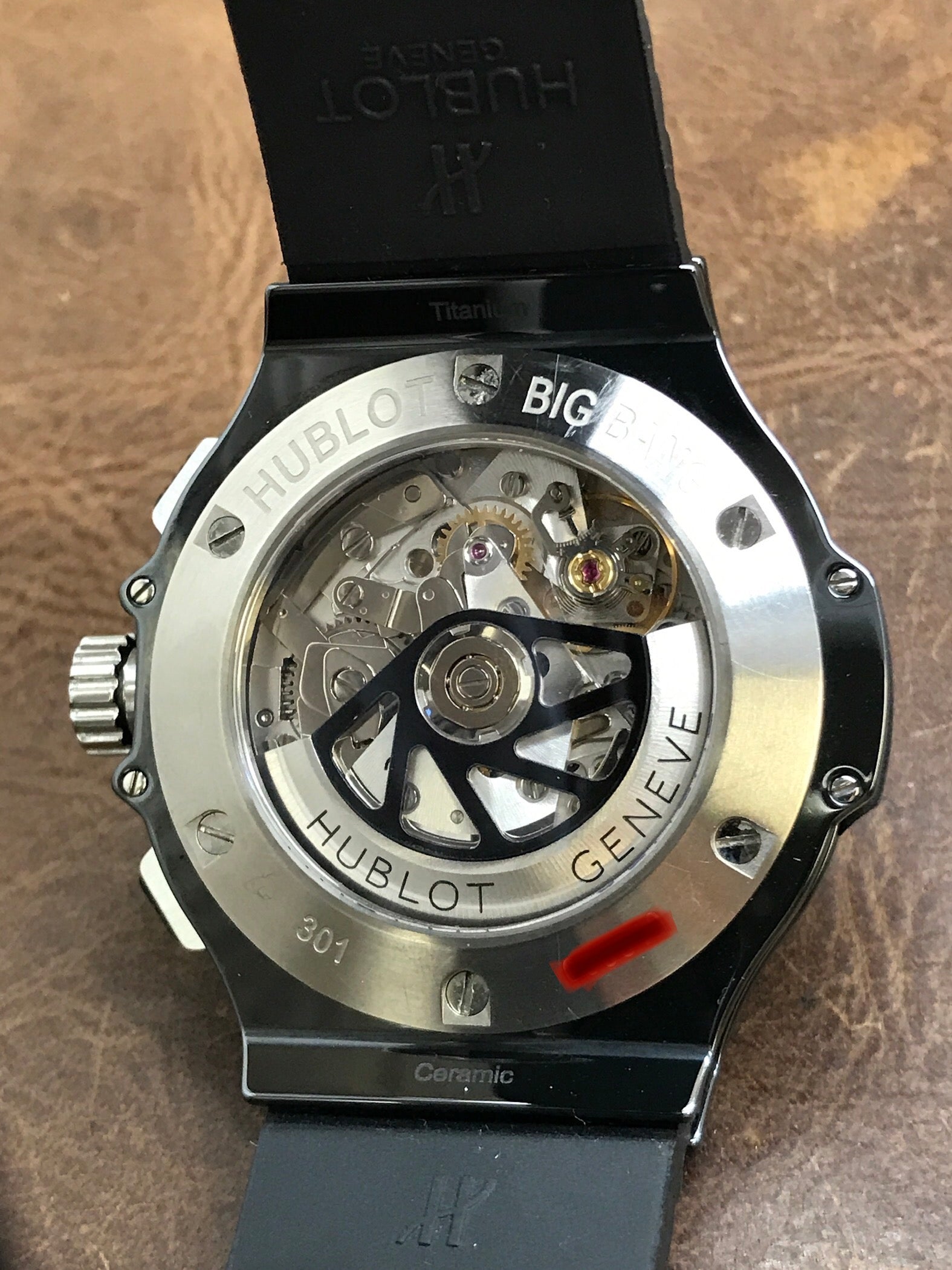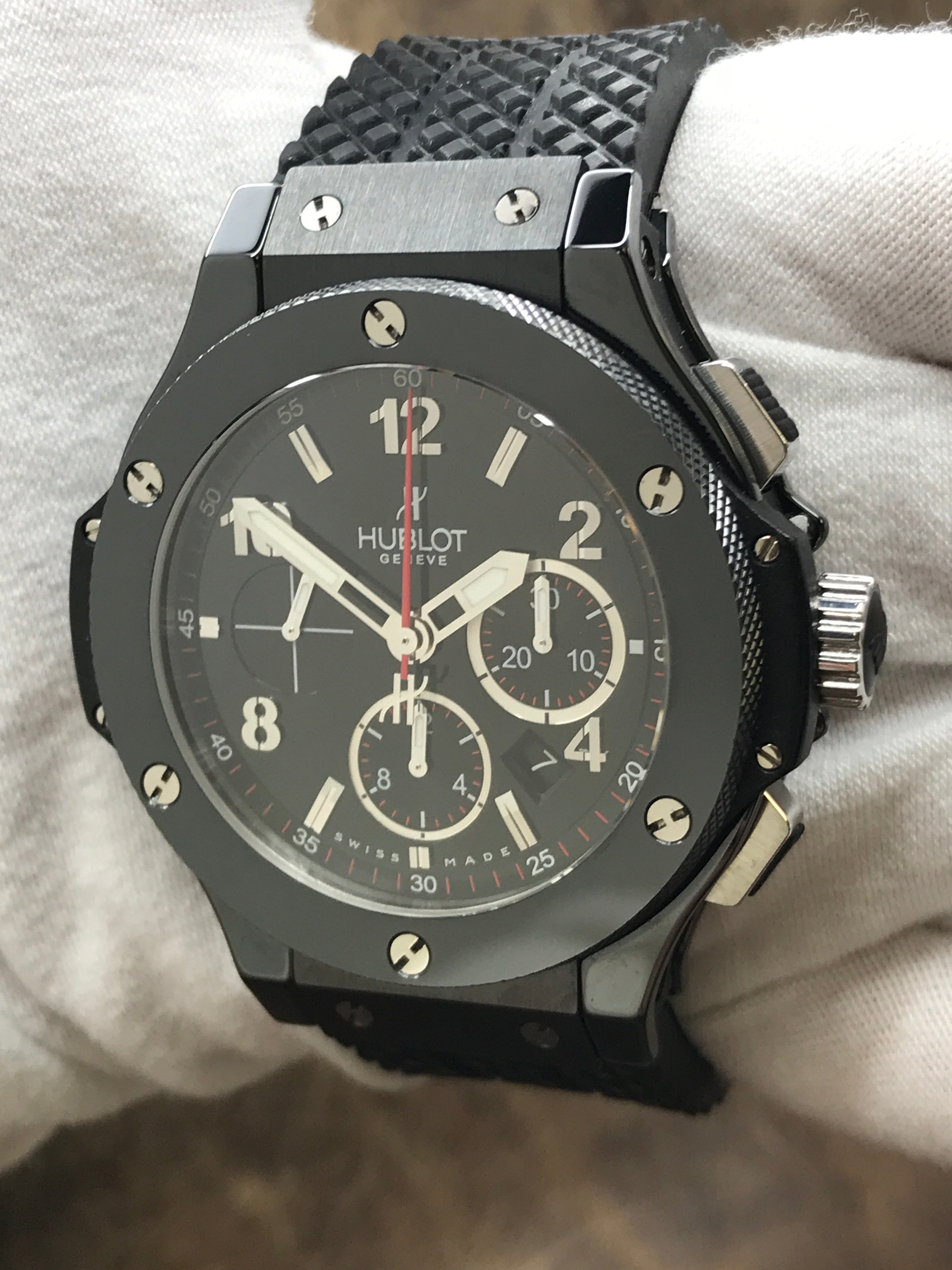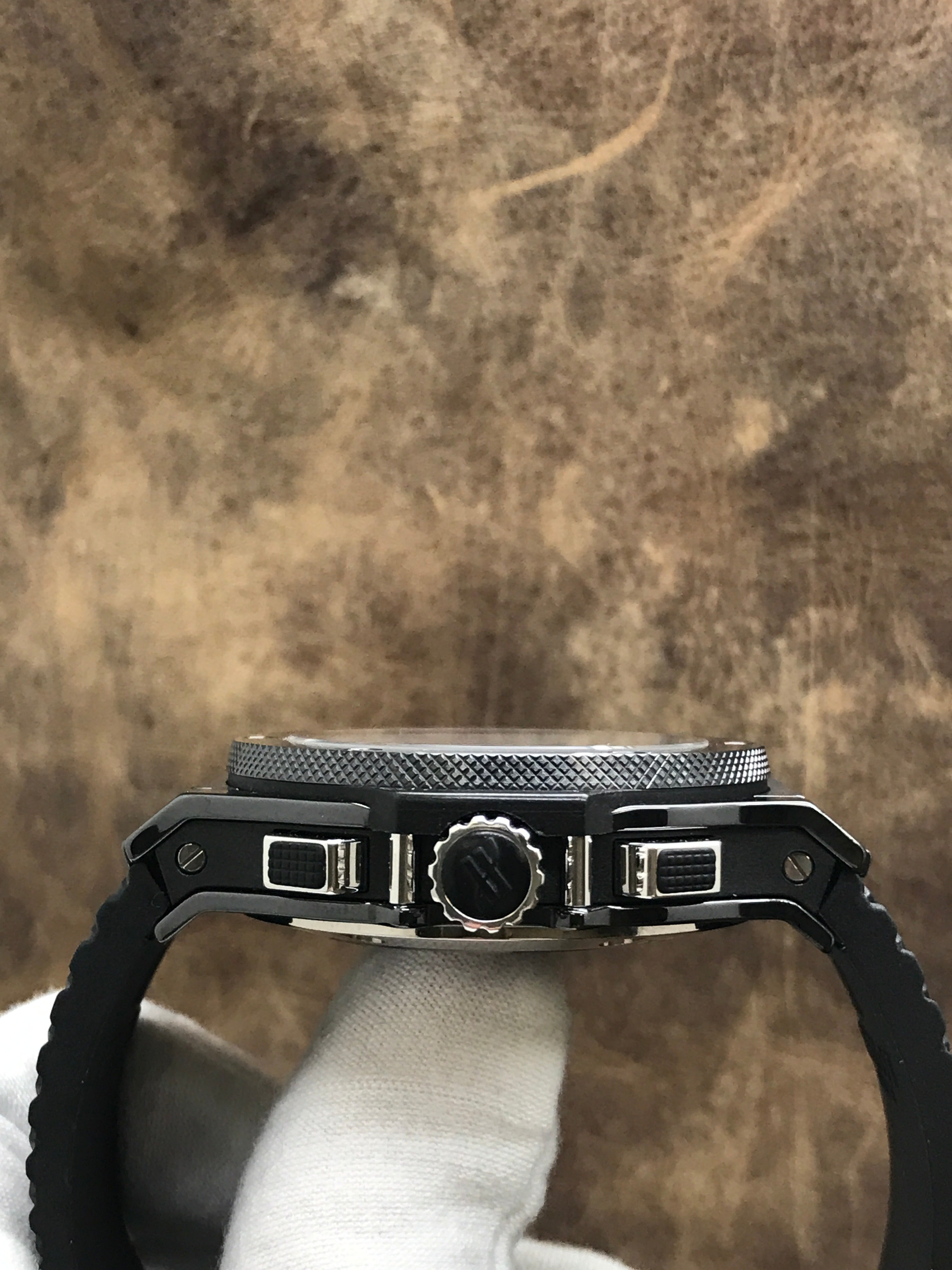 This pre-owned Hublot Big Bang Black Magic 301.CM.130.RX is in very good condition and comes with: NO box or papers. The bezel has some marks mainly between 10-2 o'clock and near 6. The screws and the buckle are scratched and the buckle has also some parts that the coating is worn out. The strap is a custom replacement. Max wrist size: 8 in.