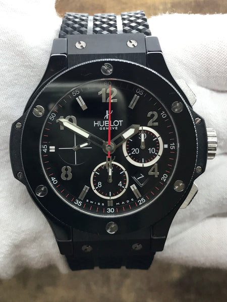 Ceramic case with a custom rubber strap custom rubber strap. Fixed ceramic bezel. Black dial with luminous silver-tone hands and alternating Arabic numeral and index hour markers. Dial type: analog. Hublot calibre hub4100 automatic movement with about 42 of power reserve. Scratch resistant sapphire crystal. Pull/push crown. Transparent case back. Case size: 44 mm. Case thickness: 14.5 mm. Round case shape. Band width: mm. Deployment w/ push button release clasp. Water resistant at 100 meters / 330 feet. Functions: chronograph, date, hour, minute, second. Hublot Big Bang Black Magic 301.CM.130.RX Black Dial Automatic Men's Watch.