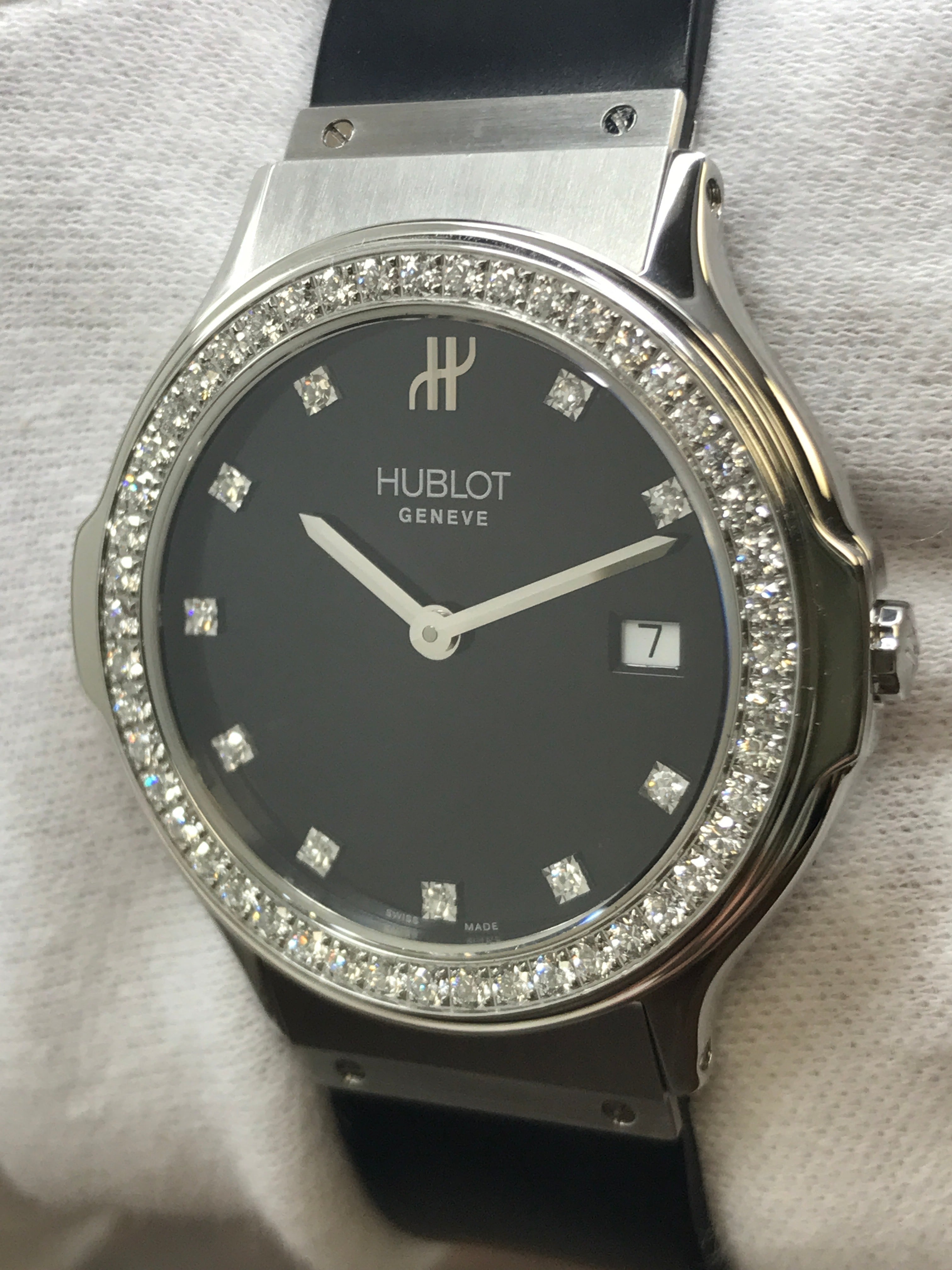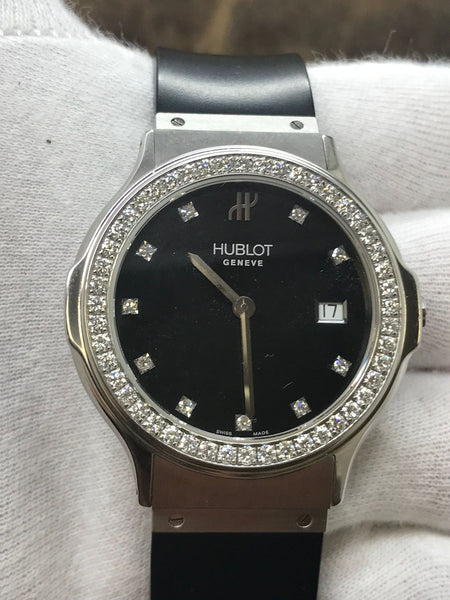 Stainless steel case with a rubber strap. Fixed stainless steel bezel. Black diamond dial with silver-tone hands and diamond hour markers. Dial type: analog. Quartz movement with about of power reserve. Sapphire crystal. Pull/push crown. Solid case back. Case size: 36 mm. Case thickness: 7 mm. Round case shape. Band width: mm. Fold over with push button release clasp. Water resistant at 30 meters / 100 feet. Functions: date, hour, minute. Hublot Classic Fusion B1525.1 Black Diamond Dial Quartz Women's Watch.