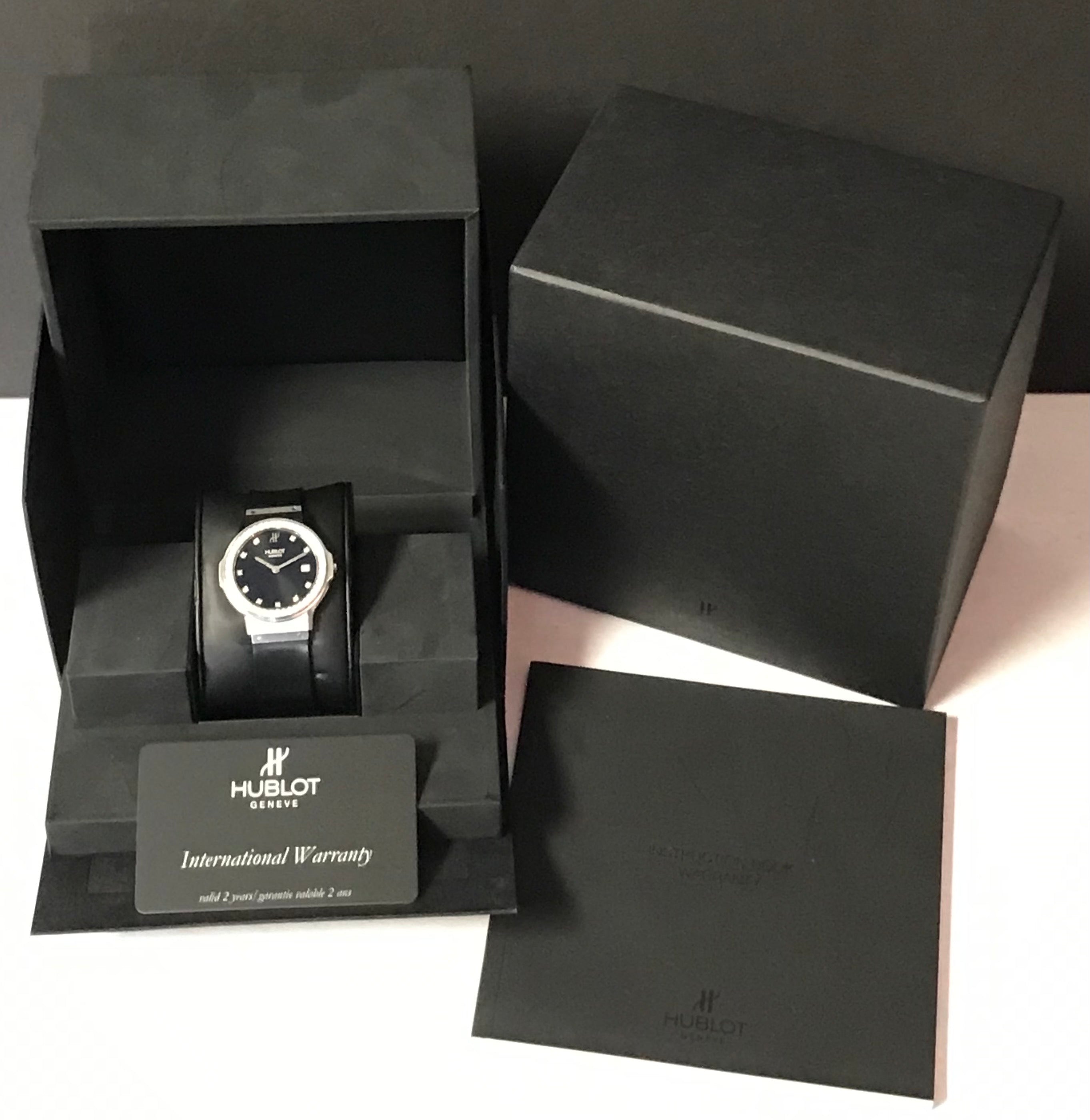 This pre-owned Hublot Classic Fusion B1525.1 is in mint condition and comes with: original Hublot double box and matching warranty card dated 2009. Max wrist size: 7.5 in.