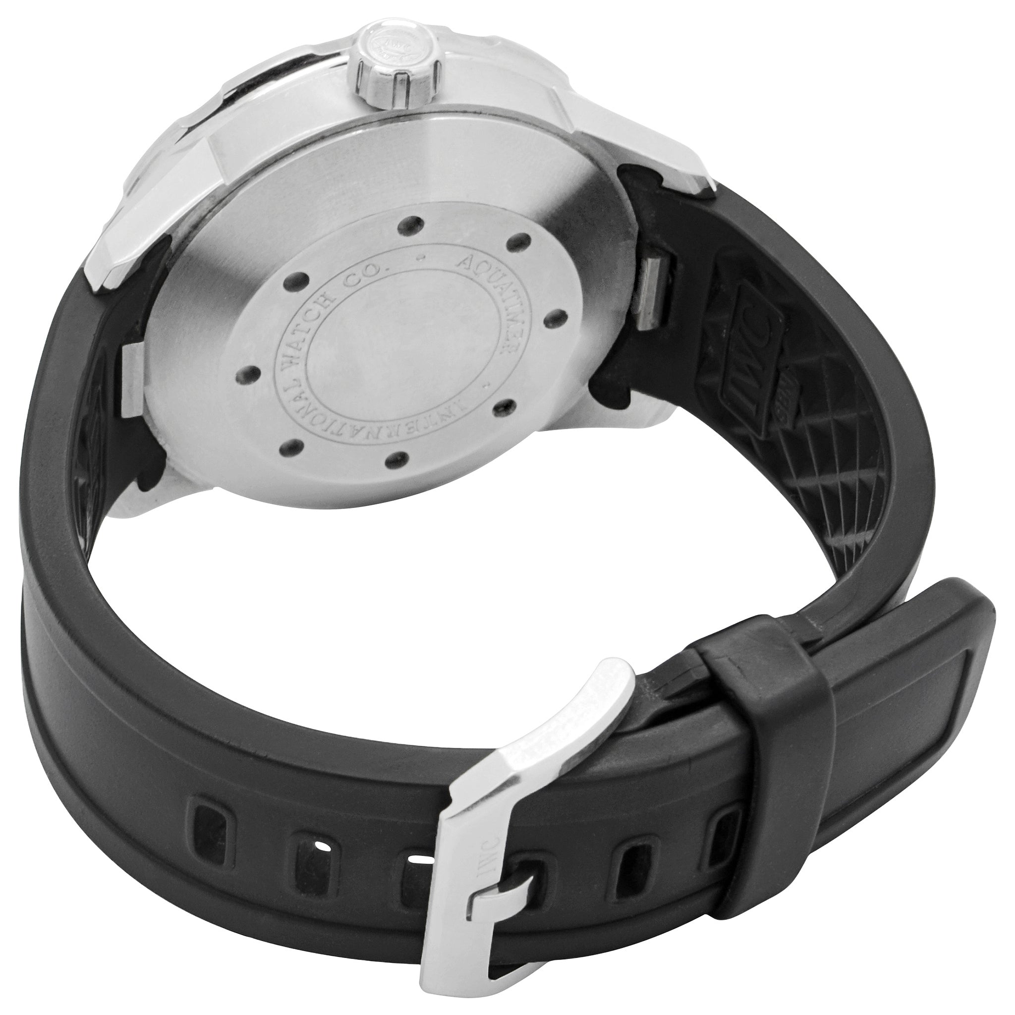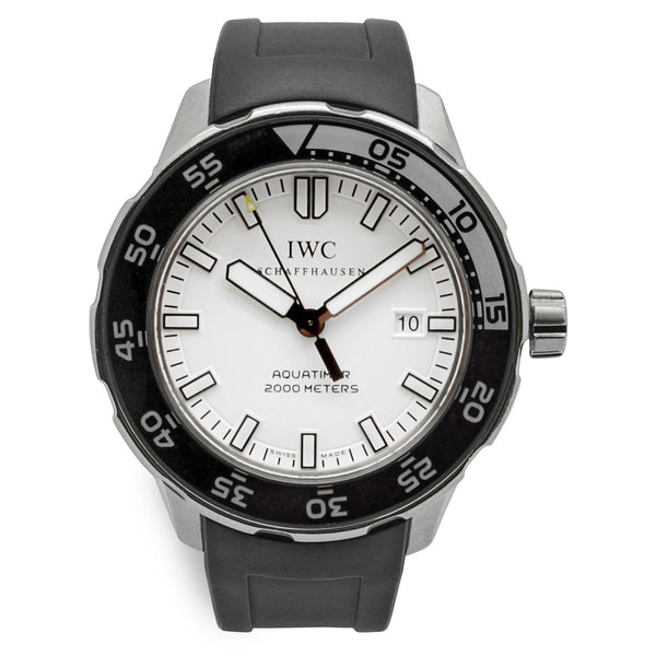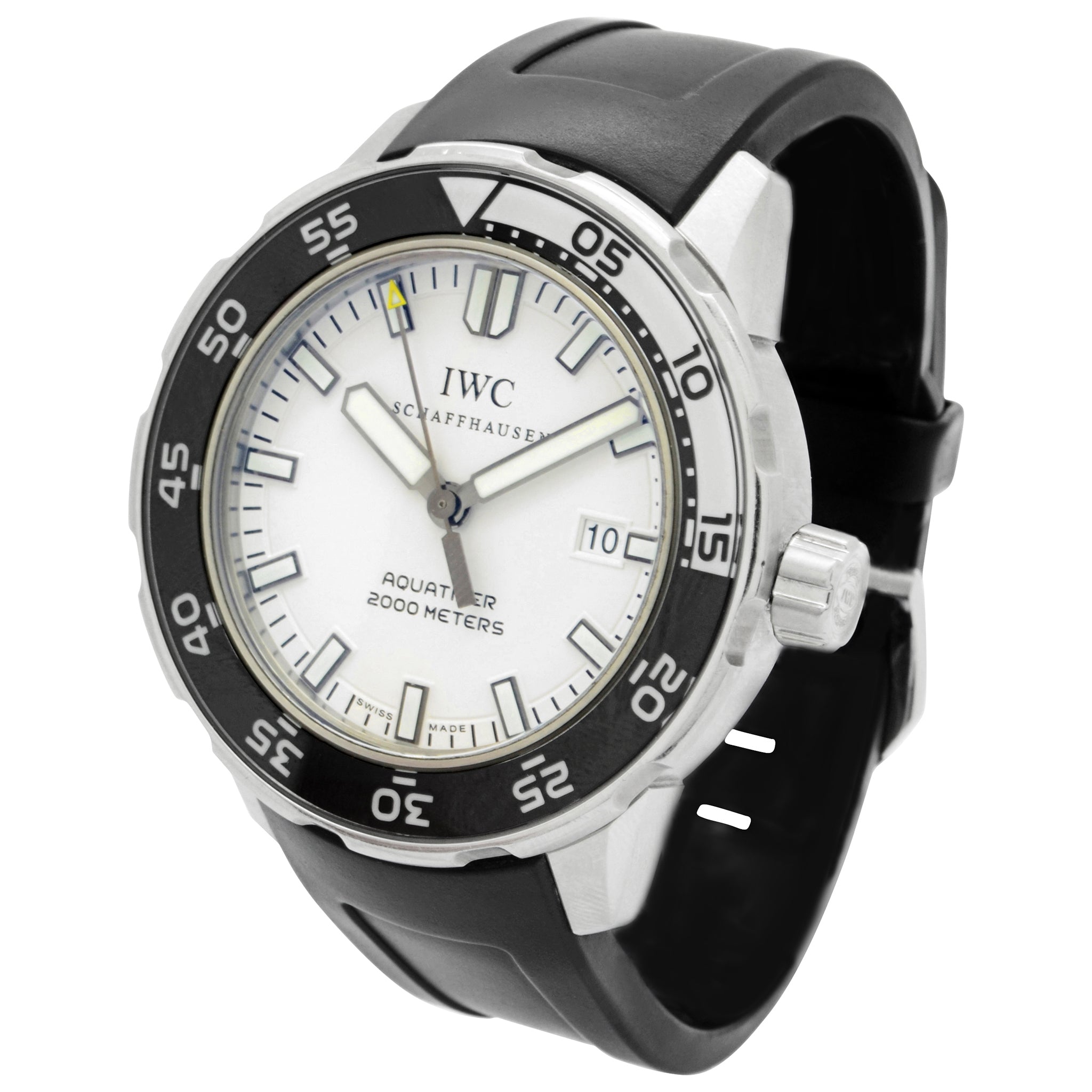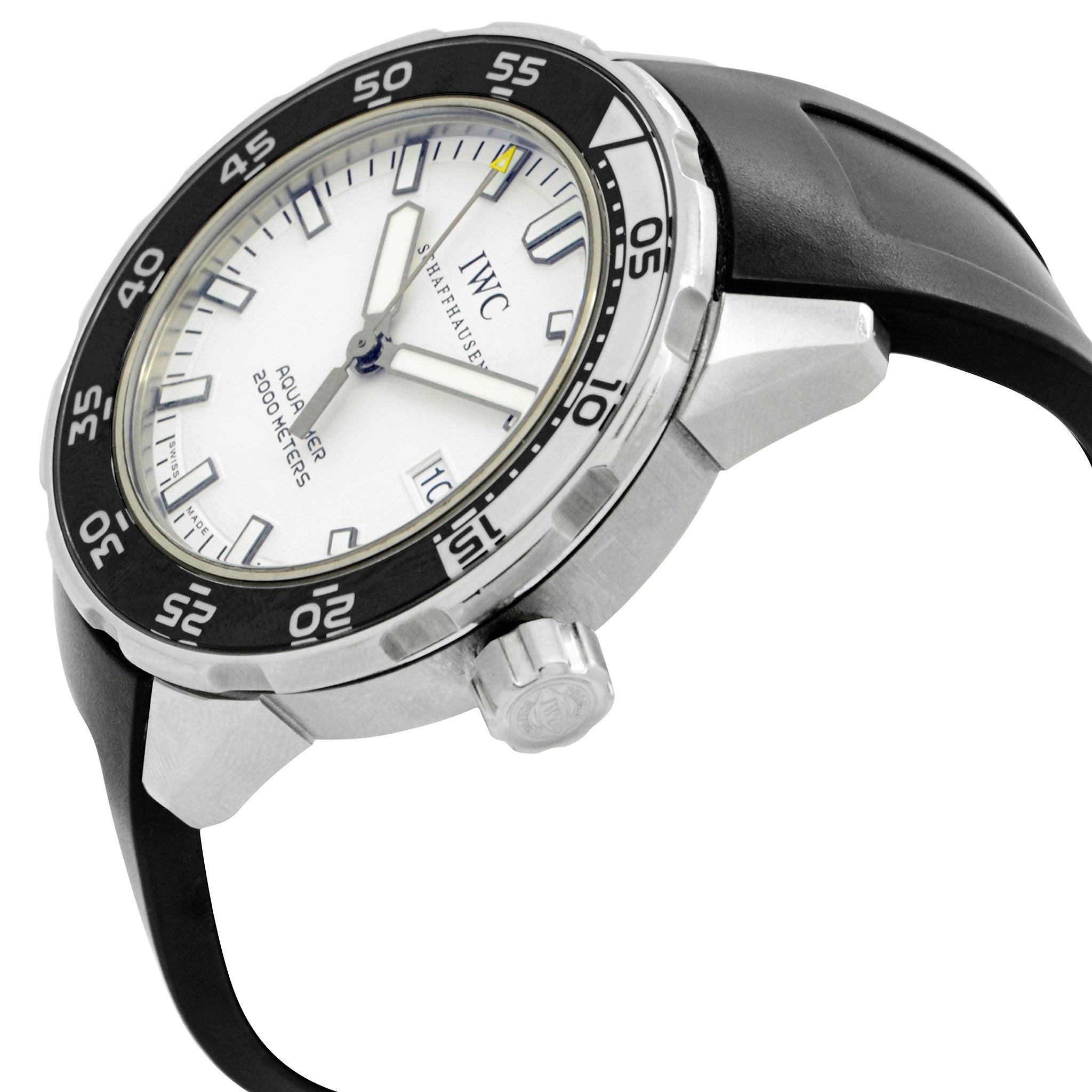 Stainless steel case with a rubber strap. Unidirectional rotating ion-plated bezel. White dial with luminous hands and index hour markers. Dial type: analog. Luminescent hands and markers. IWC calibre 30110 automatic movement with about 42 hours of power reserve. Scratch resistant sapphire crystal. Screw down crown. Solid case back. Case size: 44 mm. Case thickness: 14 mm. Round case shape. Band width: 22 mm. Tang clasp. Water resistant at 2000 meters / 6600 feet. Functions: date, hour, minute, second. IWC Aquatimer IW356806 White Dial Automatic Men's Watch.