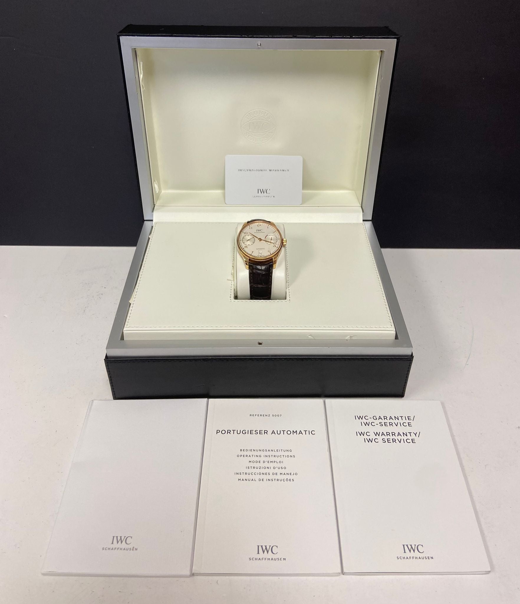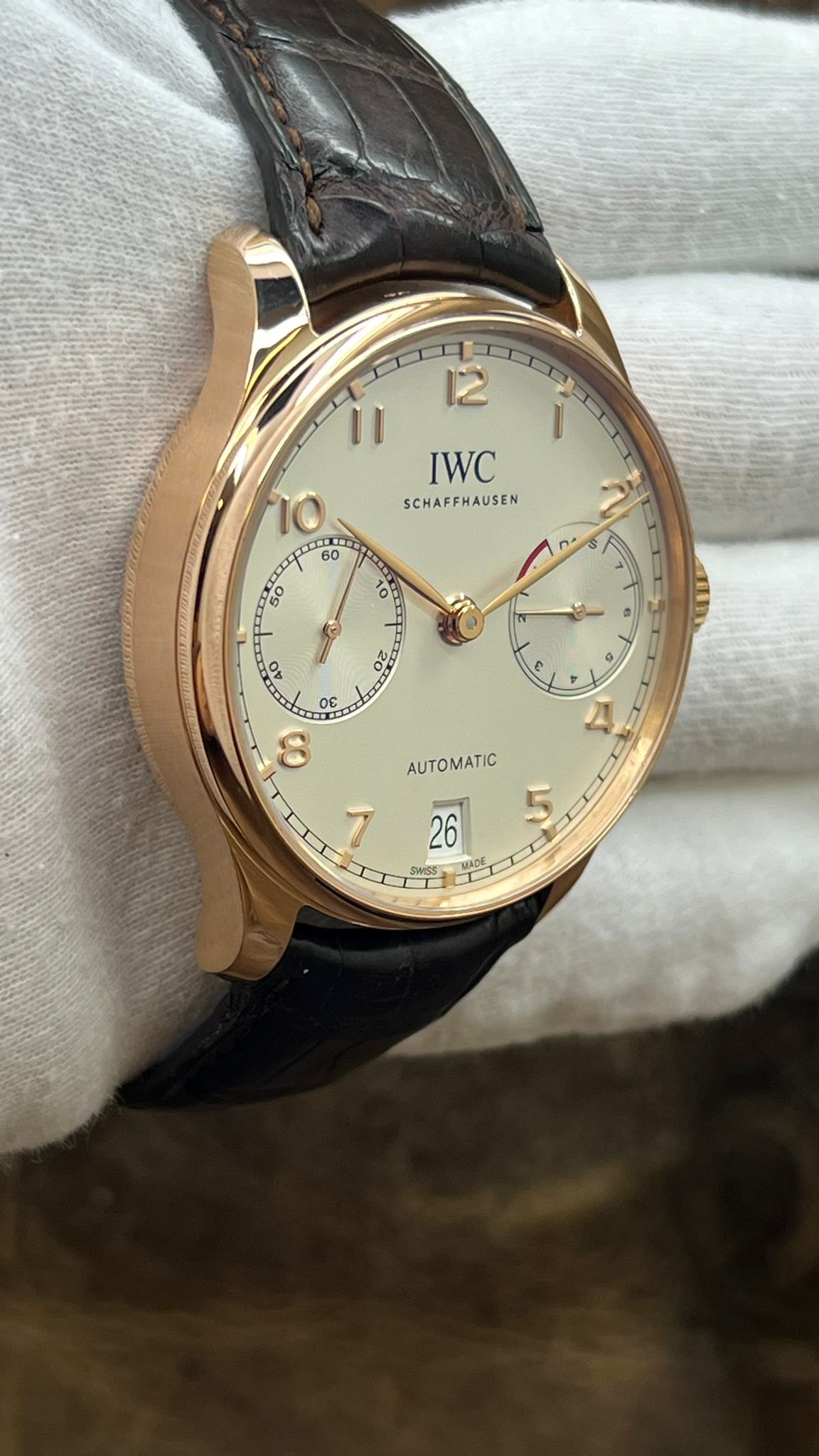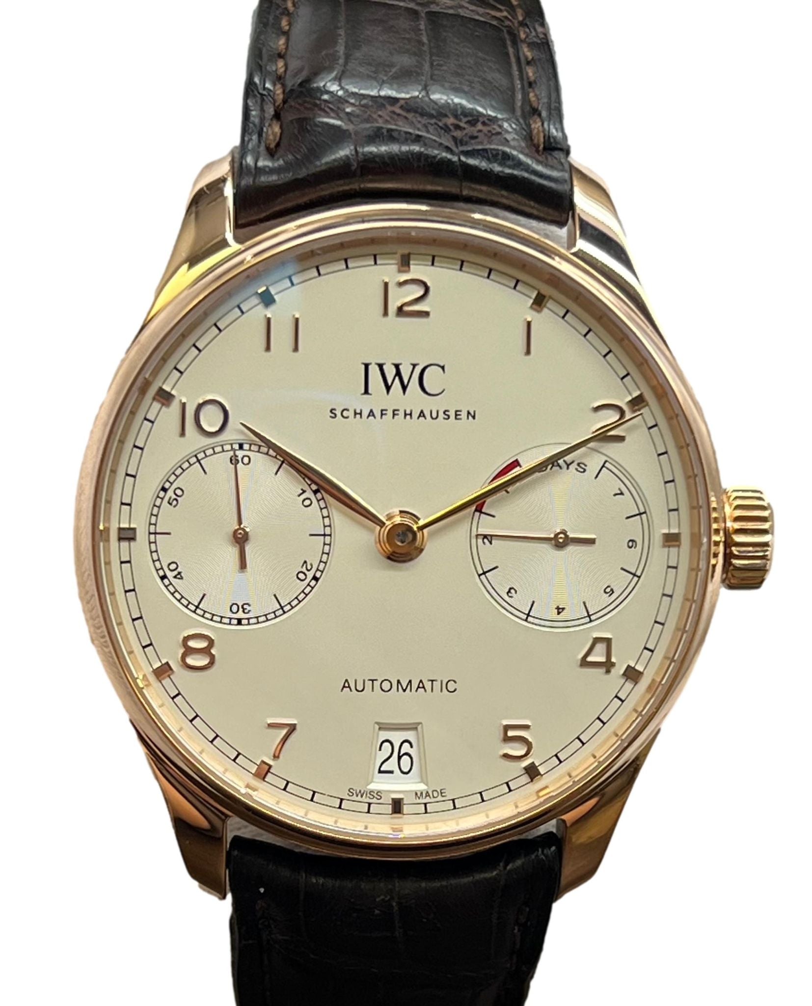 This pre-owned IWC Portuguese 7 days 18K Rose Gold IW500701 is in excellent condition and comes with: original IWC box, booklets and matching warranty card dated 2016. Max wrist size: 7.25 in.