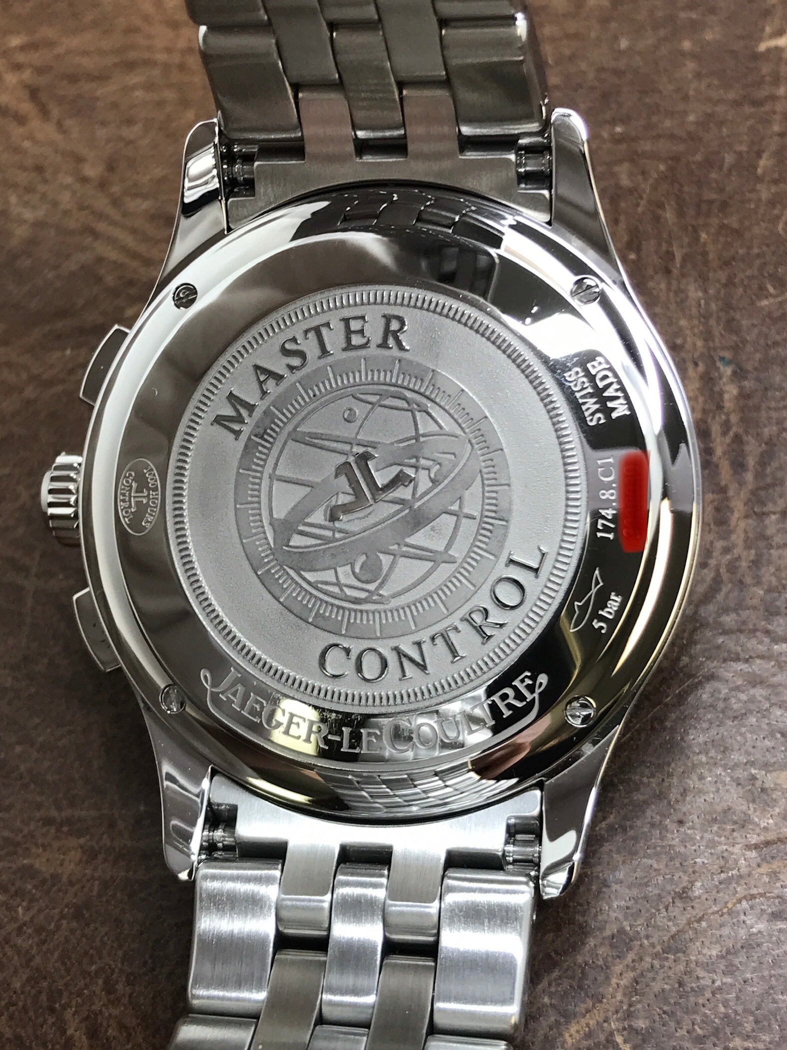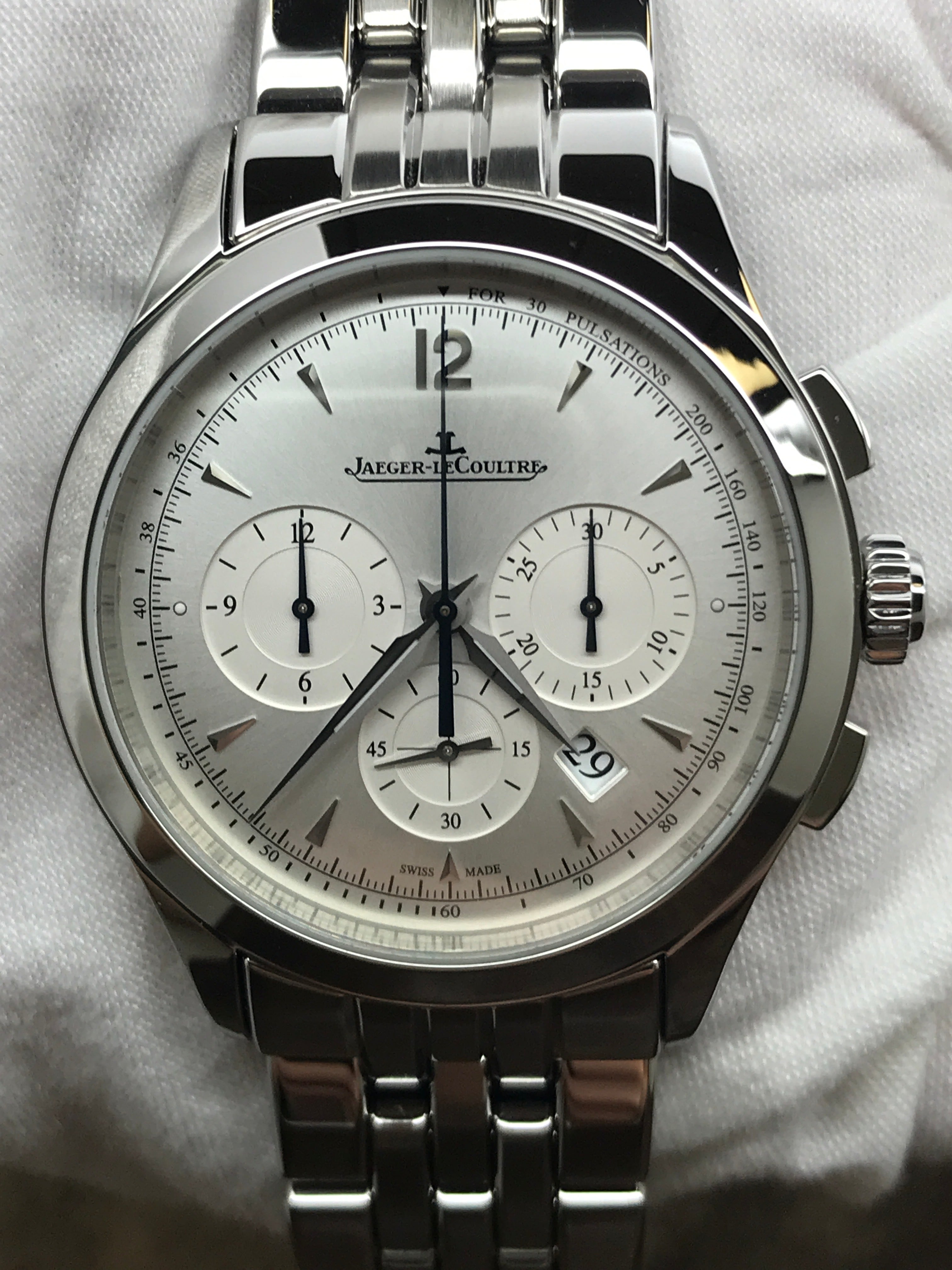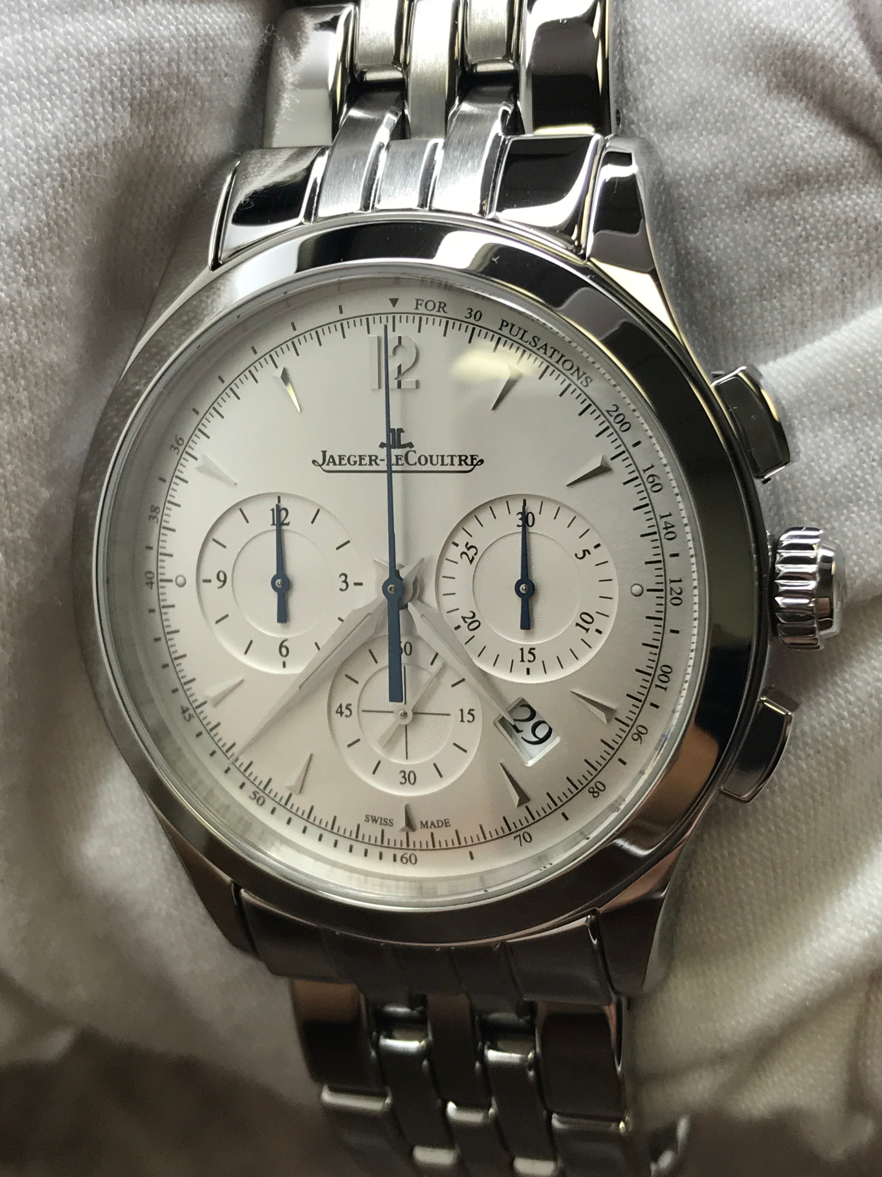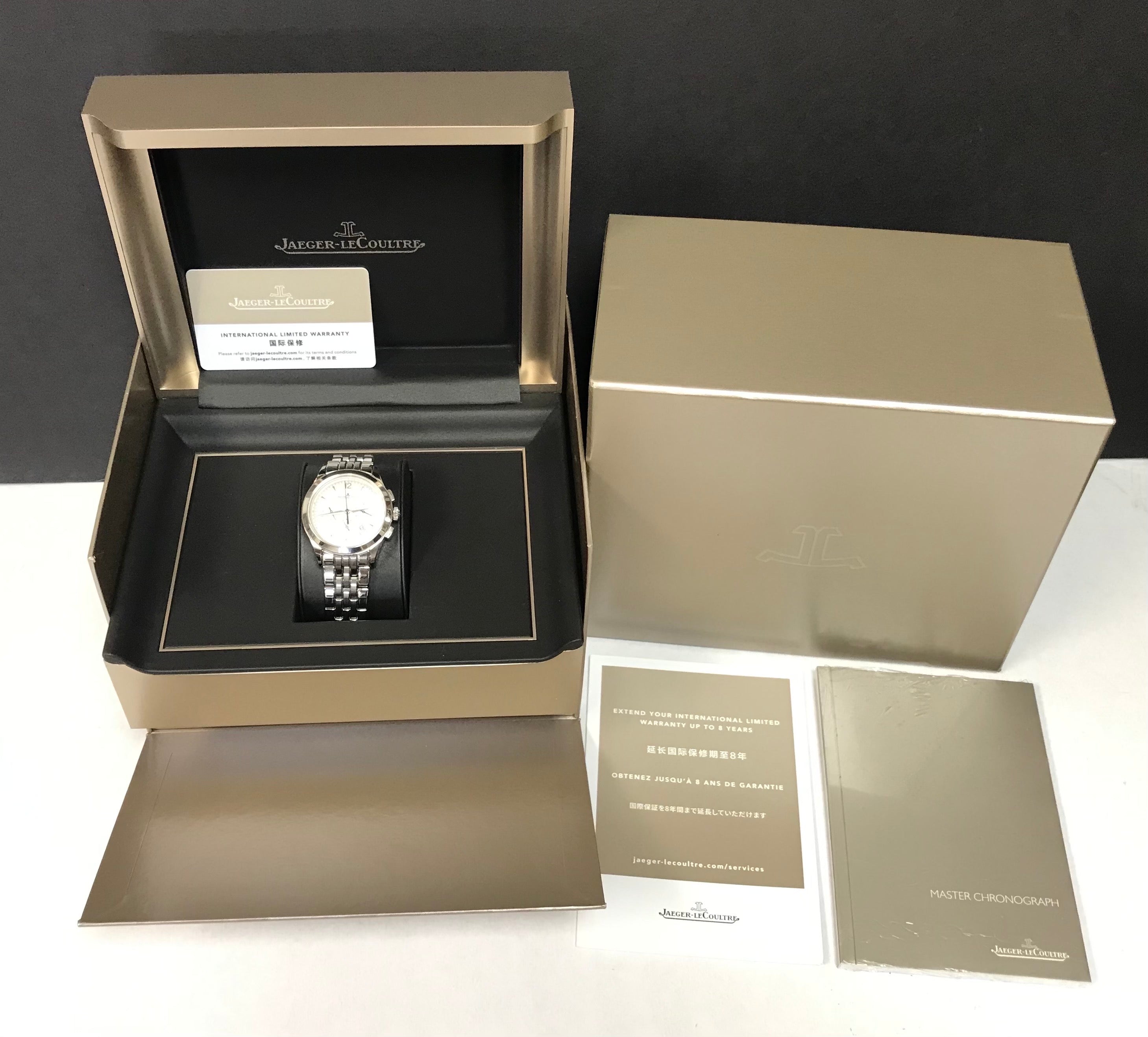 This pre-owned Jaeger-Lecoultre Master Chronograph Q1538120 is in mint condition and comes with: original Jaeger LeCoultre double box, booklets and matching warranty card. Max wrist size: 7.75 in.