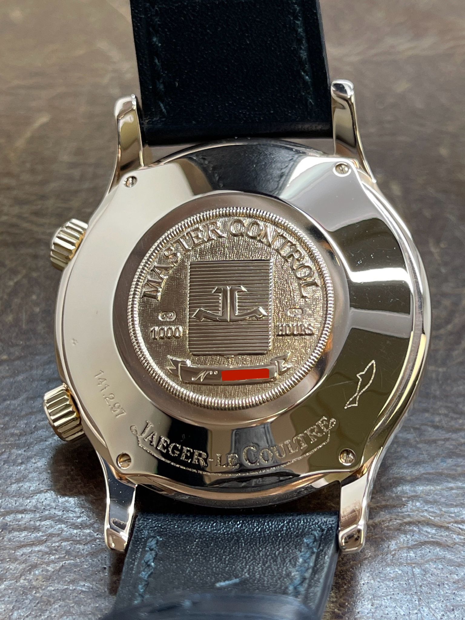 This pre-owned Jaeger-Lecoultre Master Control Reveil Alarm 141.2.97 is in very good condition and comes with: original Jaeger LeCoultre double box, booklets, tag and matching warranty papers dated 2000. The dial has a thin black line right on the edge between 11-12 o'clock. Max wrist size: 7.5 in.
