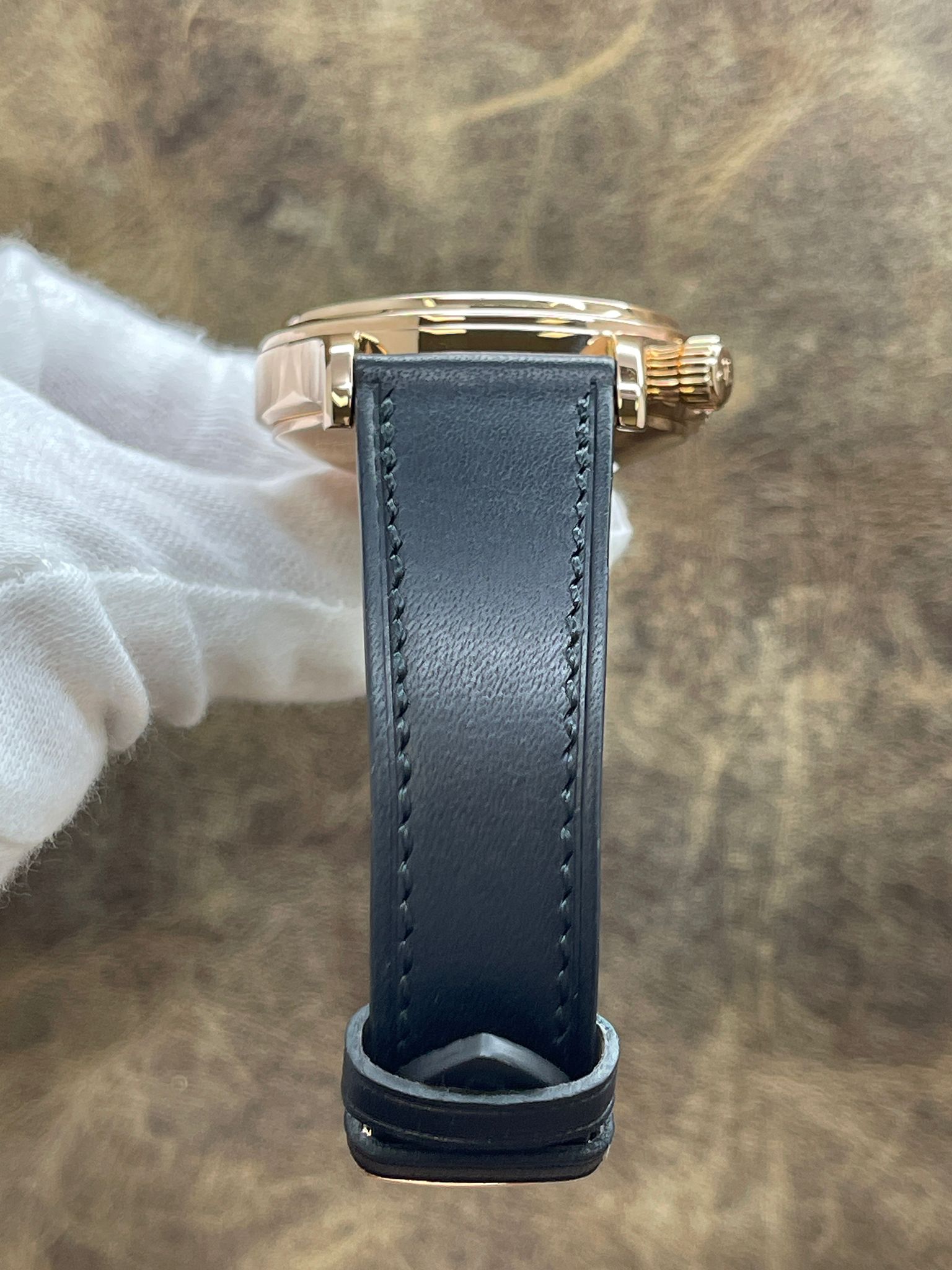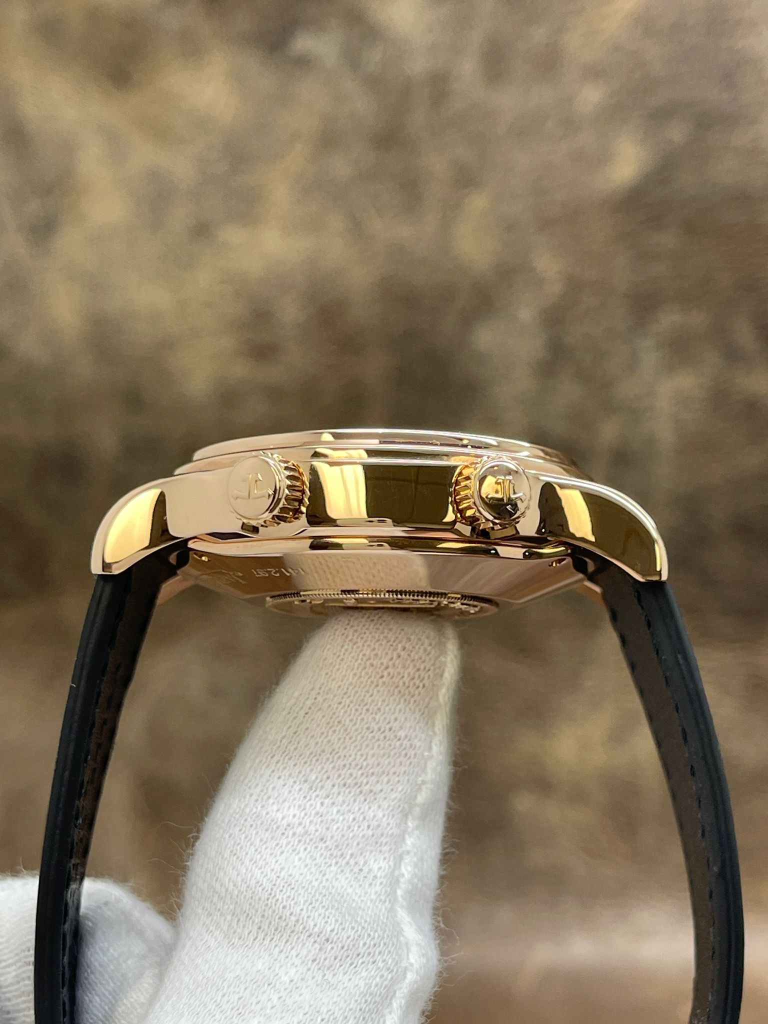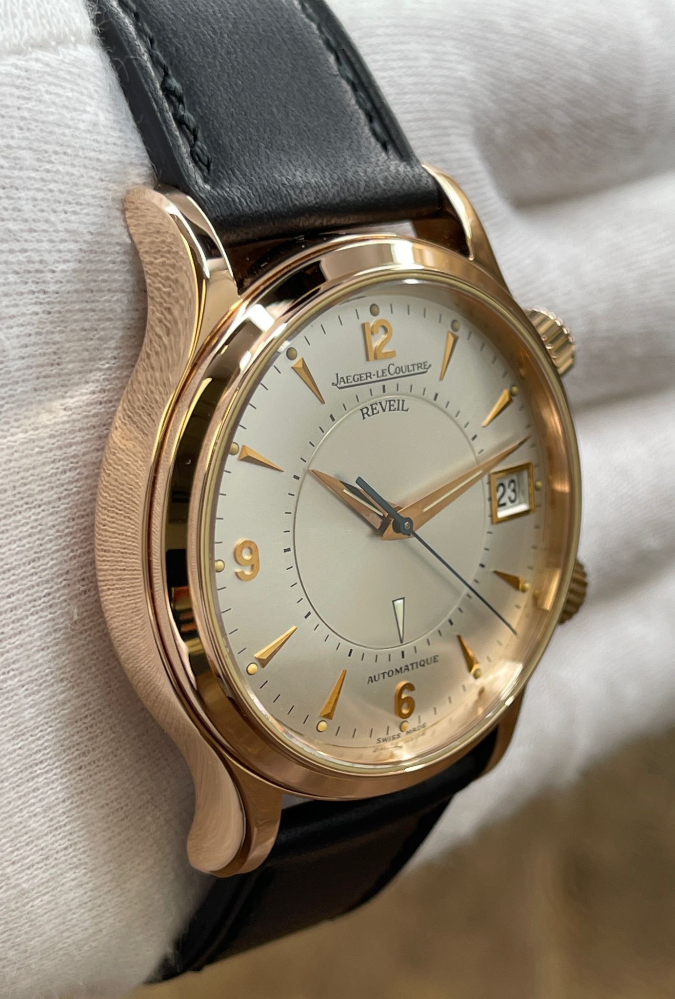 18k rose gold case with a custom leather strap custom leather. Smooth - fixed 18k rose gold bezel. Silver dial with luminous gold-tone hands and index & 6, 9, 12 Arabic hour markers. Dial type: analog. Calibre 916 automatic movement with about of power reserve. Sapphire crystal. Crown. Solid case back. Case size: 39 mm. Case thickness: mm. Round case shape. Band width: mm. 18k rose gold deployment clasp. Water resistant at 100 meters / 300 feet. Functions: date, hour, minute, seconds, alarm. Jaeger-Lecoultre Master Control Reveil Alarm 141.2.97 Silver Dial Automatic Men's Watch.