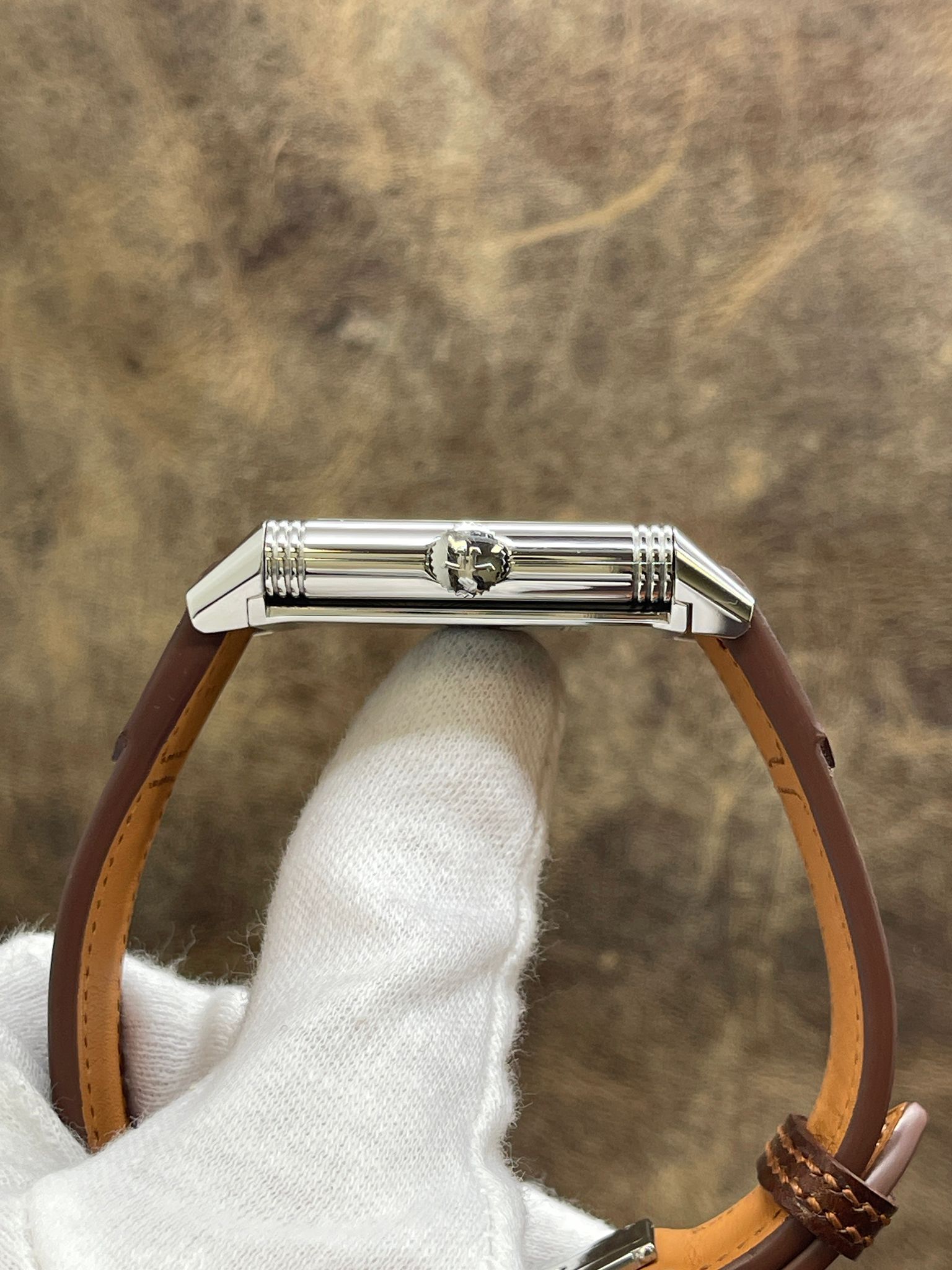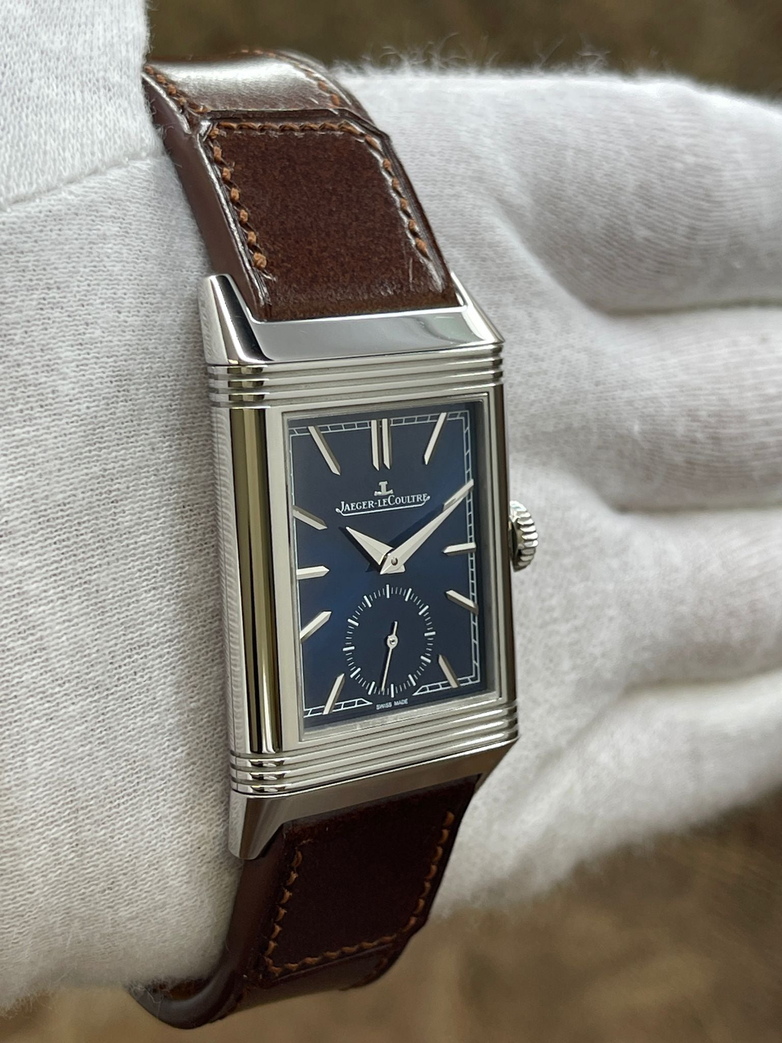 This pre-owned Jaeger-Lecoultre Reverso Tribute Q3978480 is in excellent condition and comes with: NO box or papers. The watch is NOT waterproof and comes on a custom unsigned leather strap. Max wrist size: 8 in.