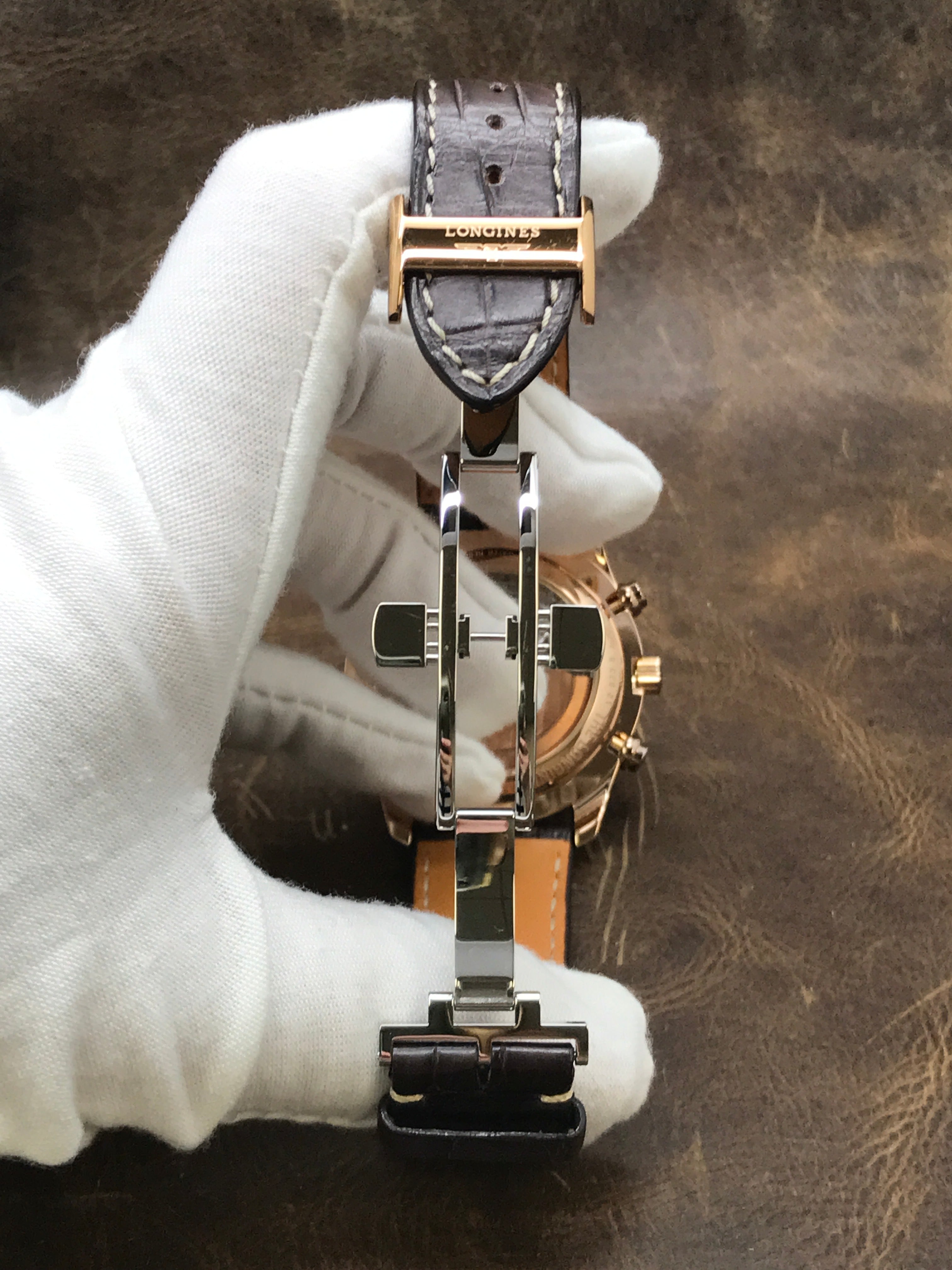 Stainless steel & 18k rose gold case with a crocodile leather strap. Fixed 18k rose gold bezel. White dial with blue leaf-style shape hands and Arabic numeral hour markers. Dial type: analog. Longines calibre l678 automatic movement with about 48 of power reserve. Scratch resistant sapphire crystal. Pull/push crown. Transparent case back. Case size: 40 mm. Case thickness: 14 mm. Round case shape. Band width: mm. Double folded deployment clasp. Water resistant at 30 meters / 100 feet. Functions: chronograph, month, date, day, moonphase, hours, minutes, seconds, 24 hours. Longines Master Collection 18K Rose Gold L2.673.8.78.5 White Dial Automatic Men's Watch.