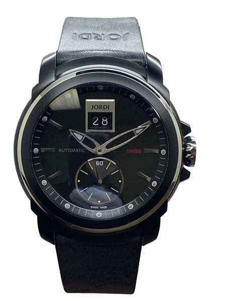 Pvd-coated stainless steel case with a leather strap. Fixed pvd or dlc coated bezel. Black dial with silver-tone skeleton hands and luminous dots hour markers. Dial type: black . Miyota automatic movement with about of power reserve. Scratch resistant sapphire crystal. Push/pull crown. Display case back. Case size: 44 mm. Case thickness: 16 mm. Round case shape. Band width: 21 mm. Deployment clasp. Water resistant at 50m. Functions: hours, minutes, seconds, date. Michel Jordi Paradelplatz 200.07.002.01 Black Dial Automatic Men's Watch.
