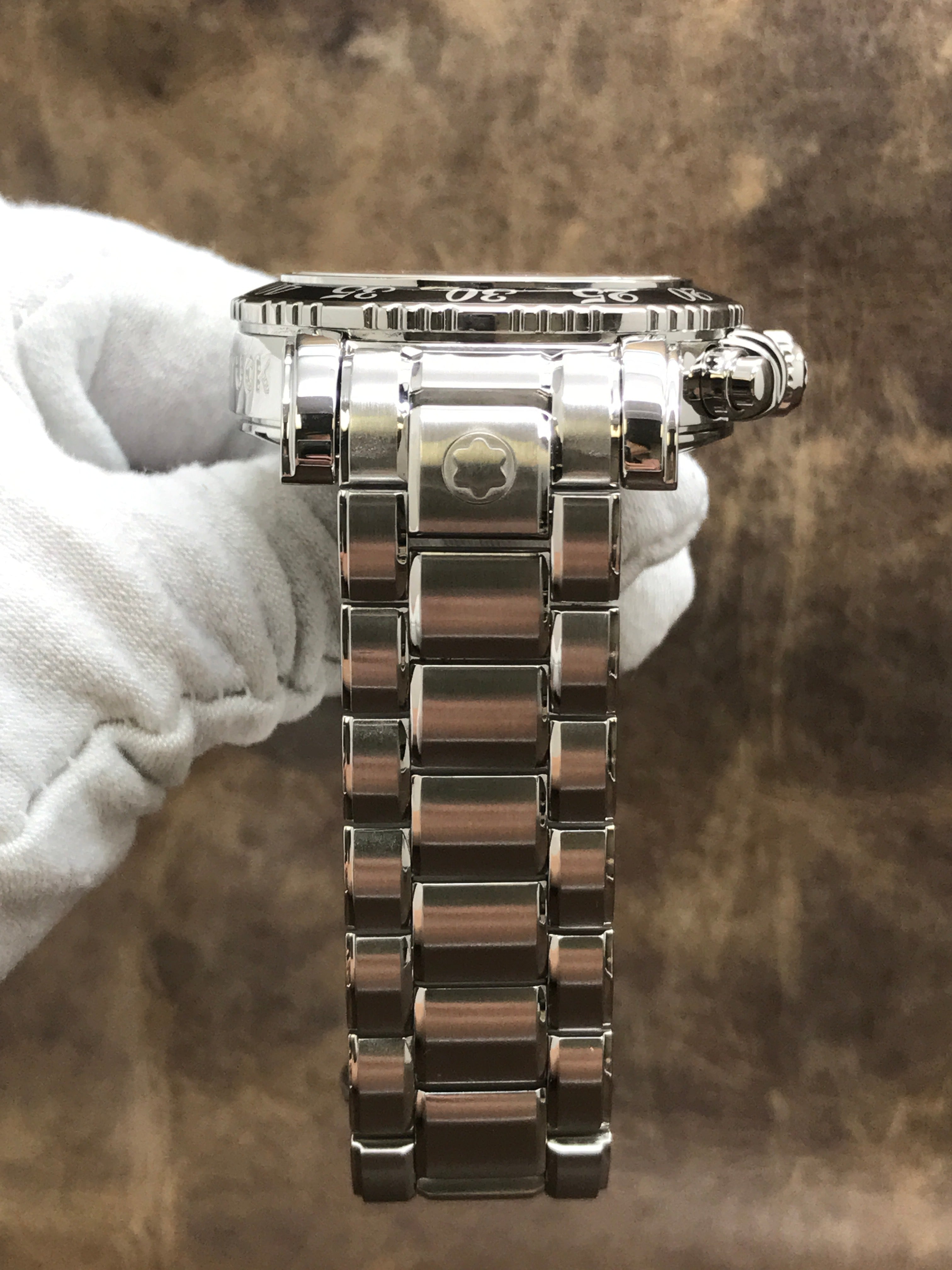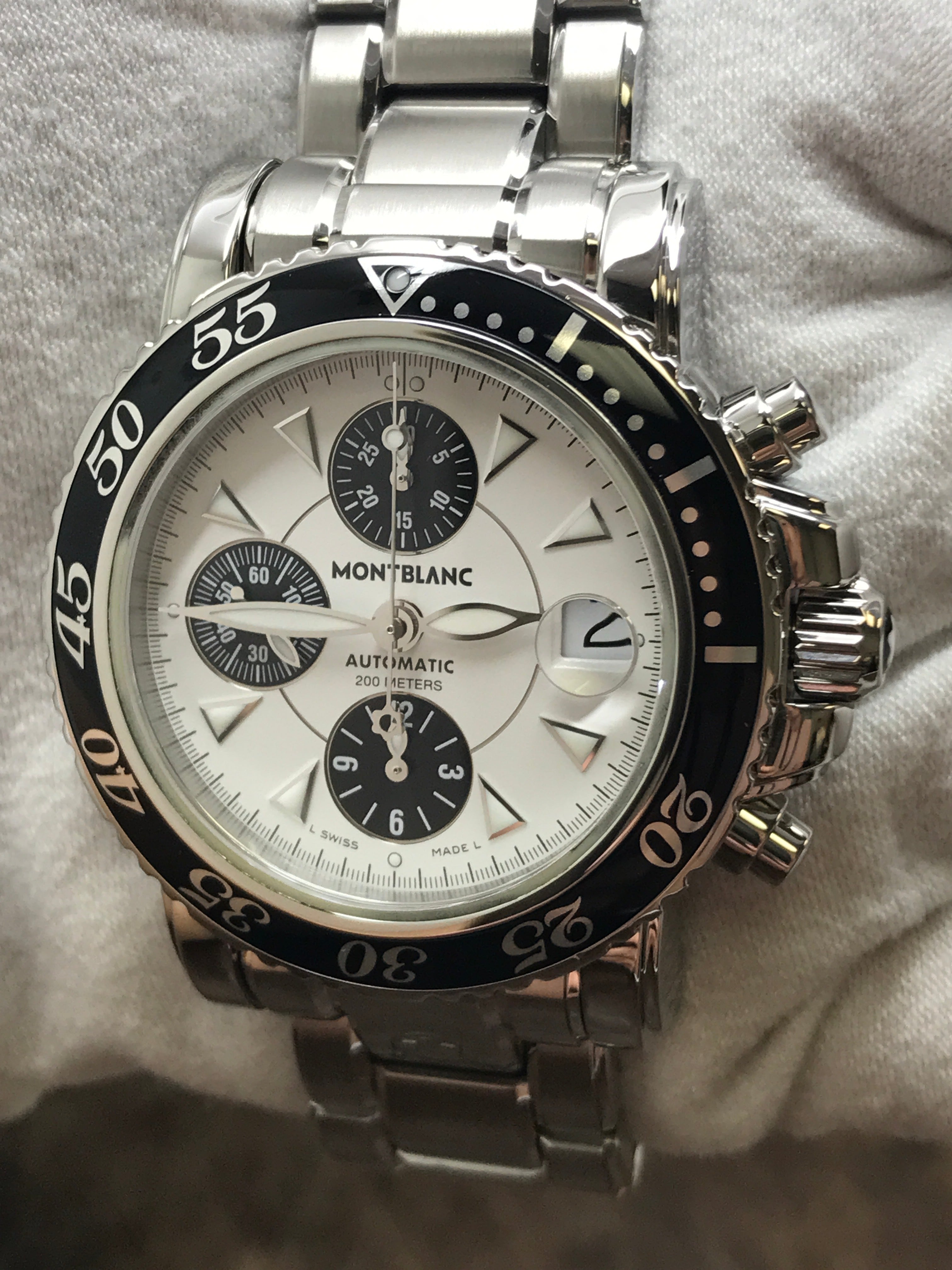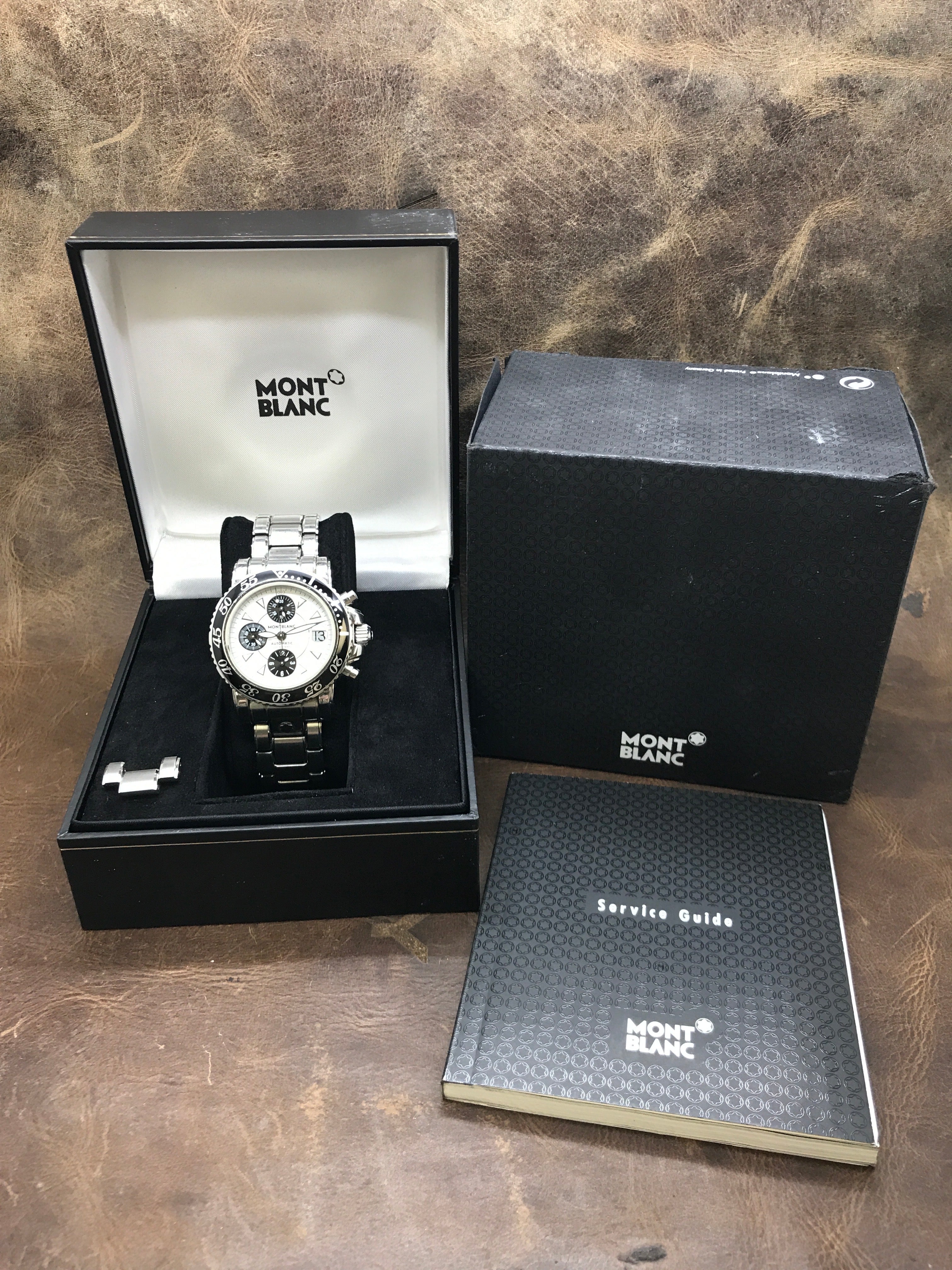 This pre-owned Montblanc Meisterstuck 7034 is in excellent condition and comes with: original Montblanc double box & matching warranty papers dated 2006. The black insert has a few marks between 3-4 o'clock and near 11 as well. Max wrist size: 7.75 in.