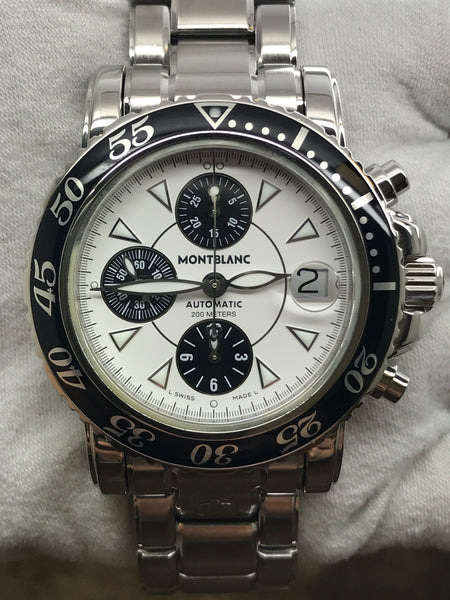 Stainless steel case with a stainless steel bracelet. Uni-directional rotating stainless steel bezel. White dial with white with luminous hands and index hour markers. Dial type: analog. 4810 501 automatic movement with about 48 of power reserve. Scratch resistant sapphire crystal. Screw-down crown. Solid case back. Case size: 41 mm. Case thickness: 14.8 mm. Round case shape. Band width: mm. Double folded deployment clasp. Water resistant at 200m/660ft. Functions: hours, minutes, seconds, chronograph, date. Montblanc Meisterstuck 7034 White Dial Automatic Men's Watch.