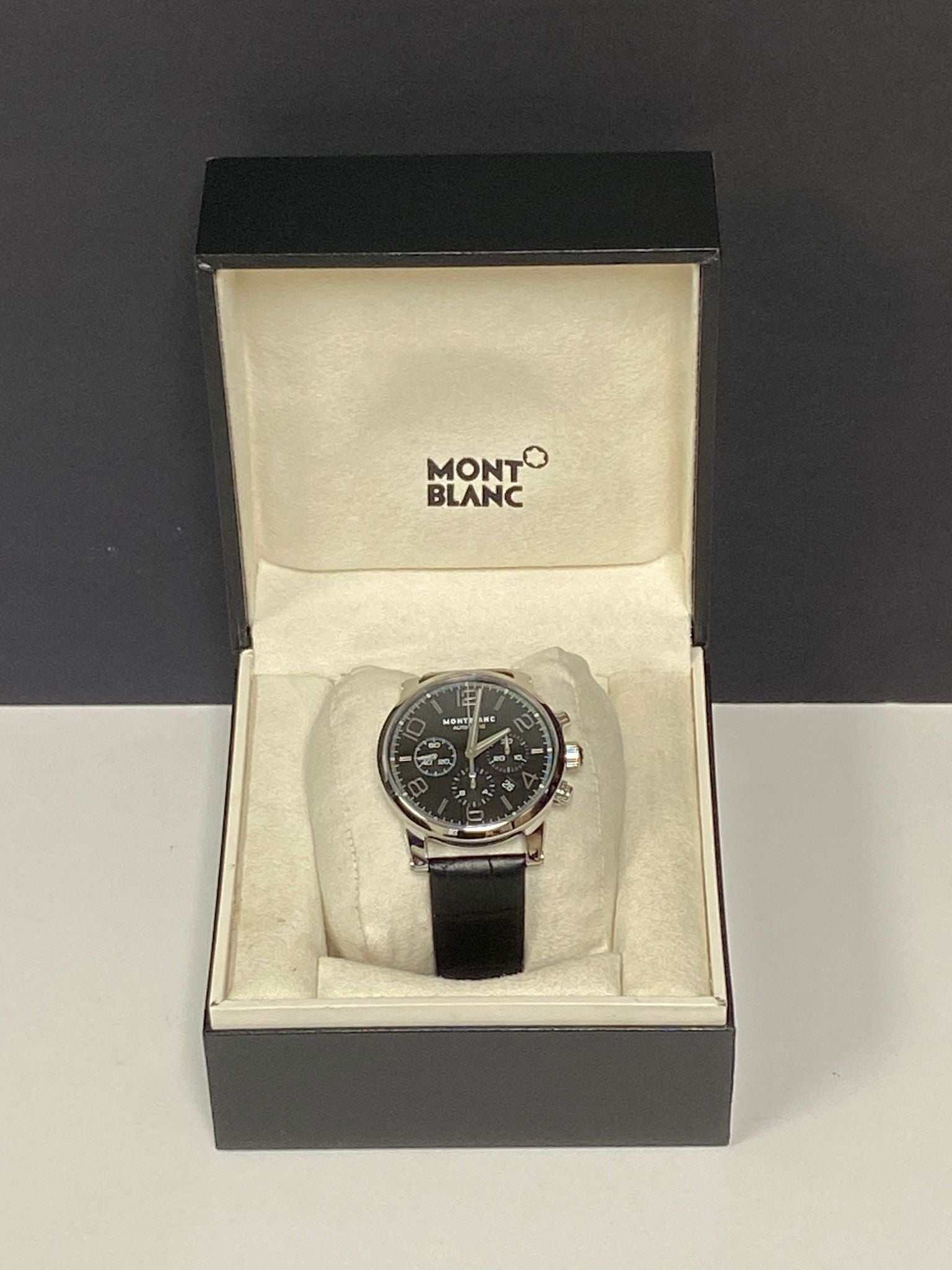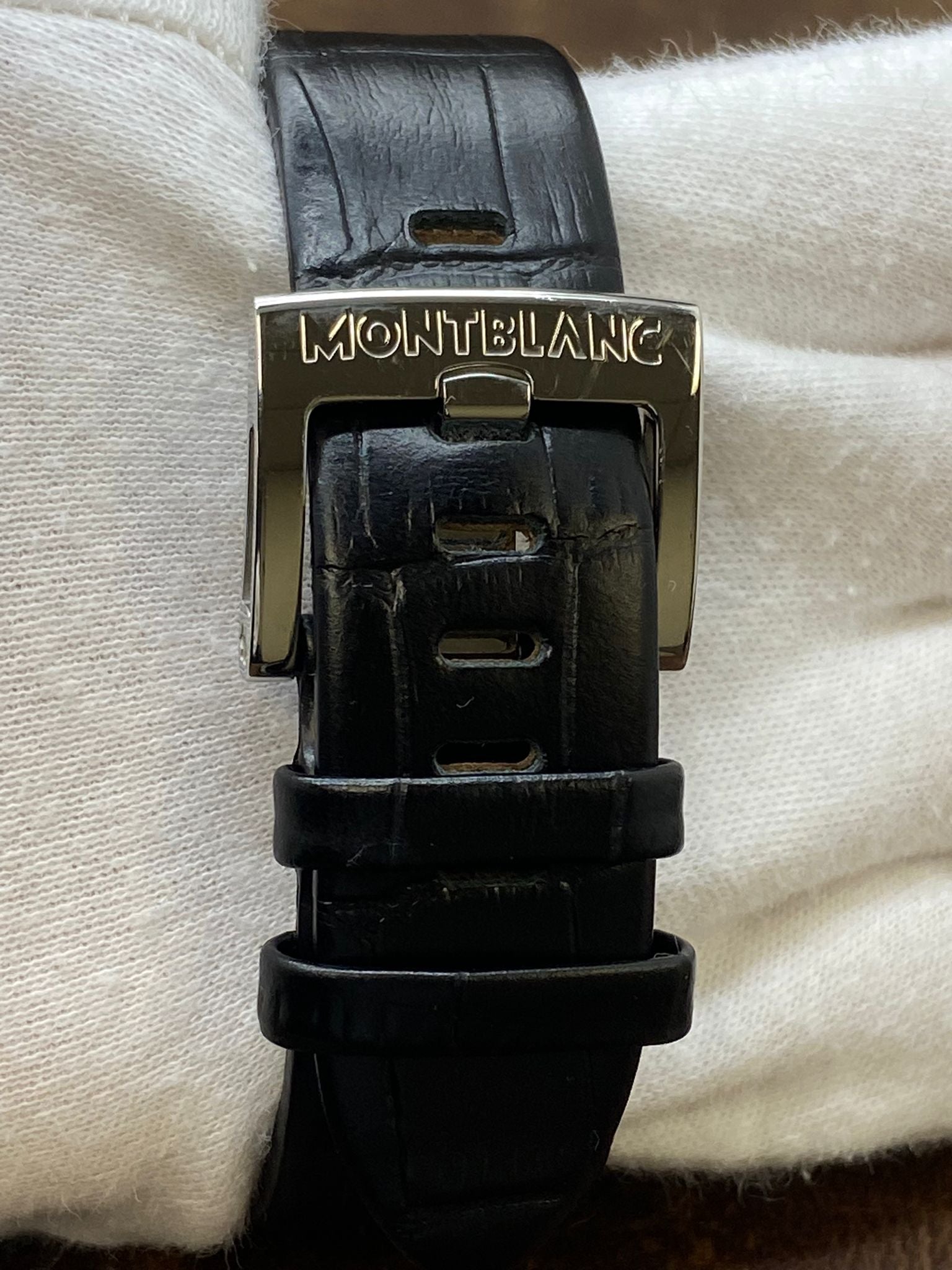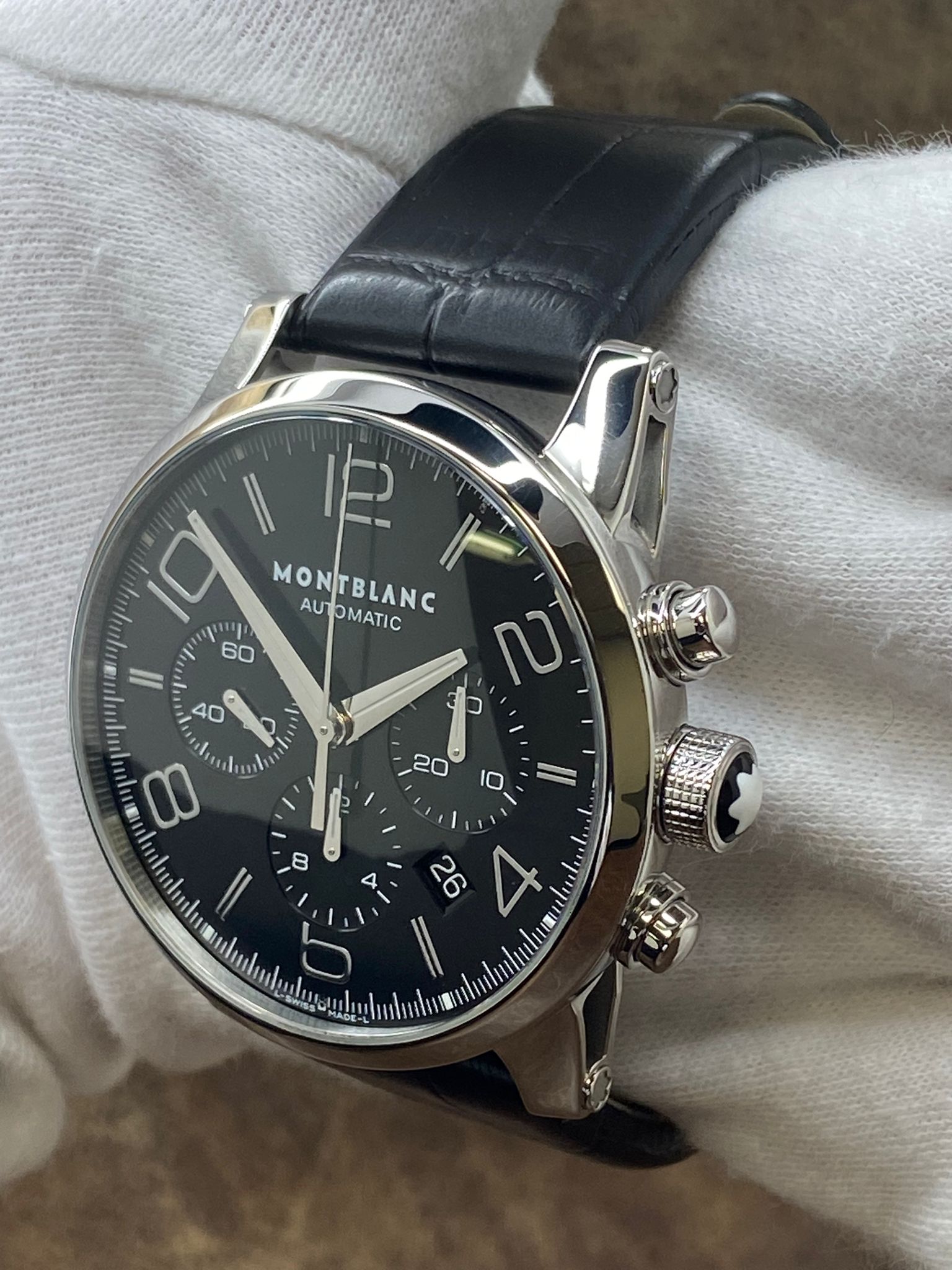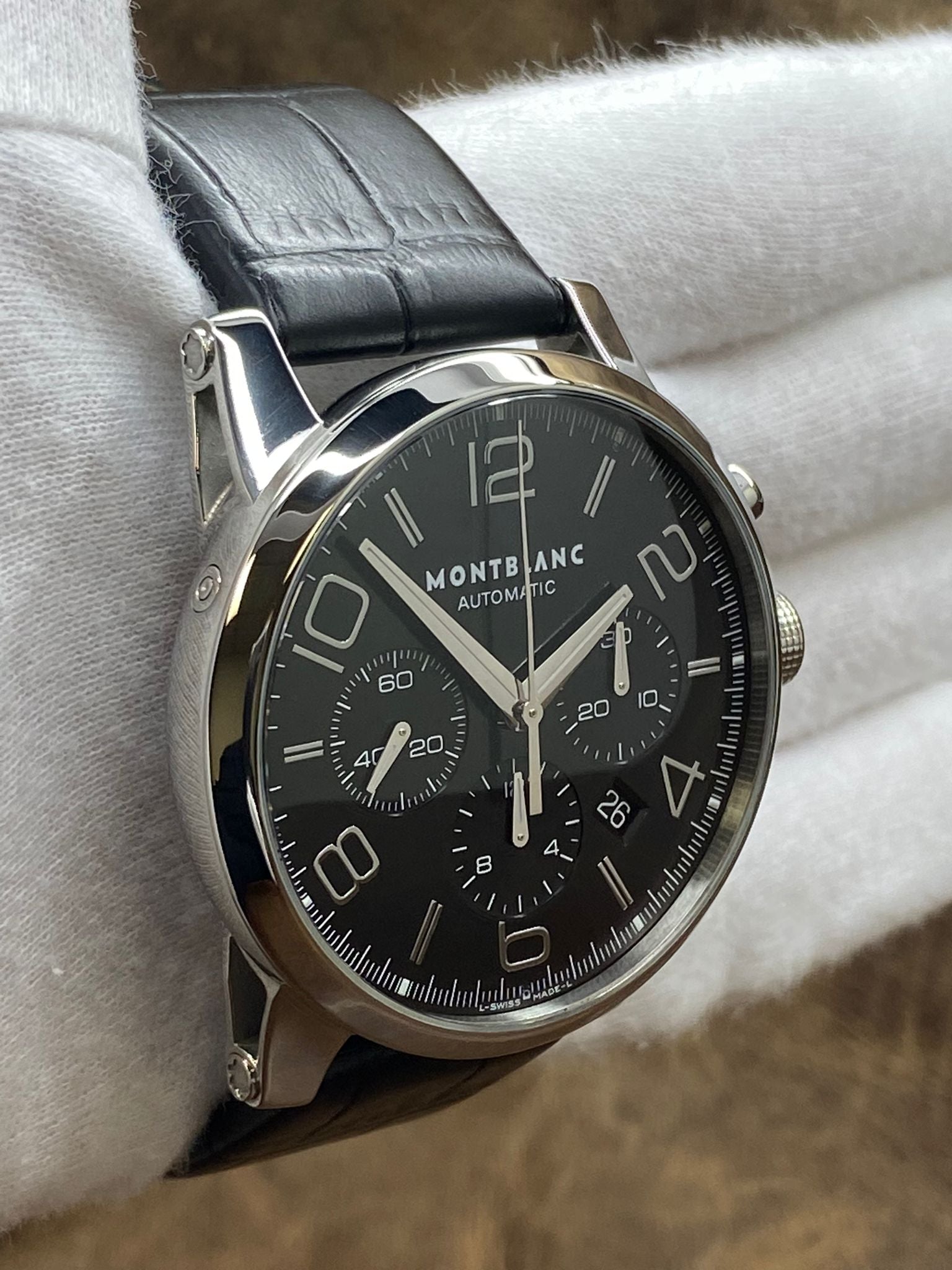 This pre-owned Montblanc Timewalker Chronograoh 7141 is in excellent condition and comes with: original Montblanc box only. The watch comes with a custom black leather strap with original steel tang buckle. Max wrist size: 7.5 in.