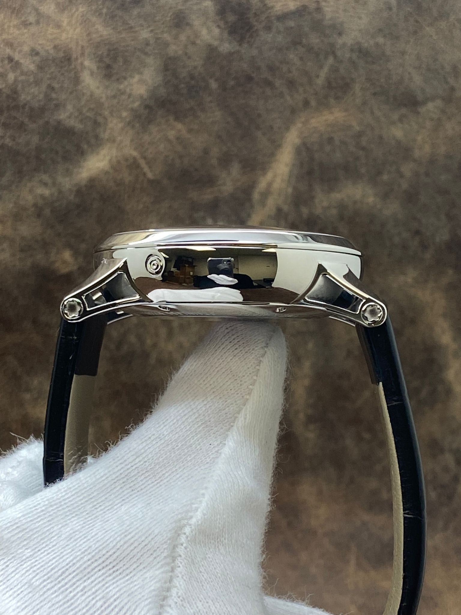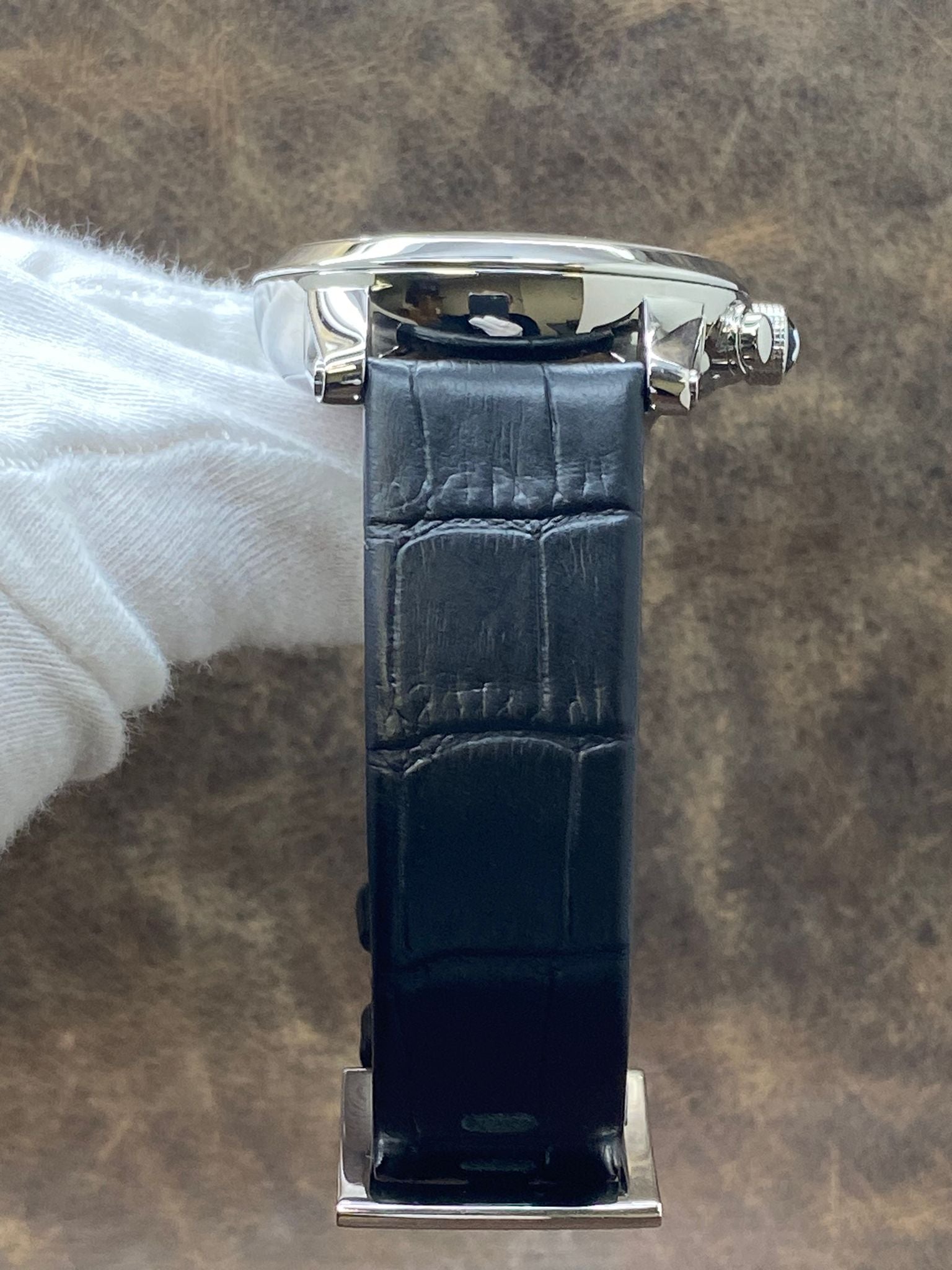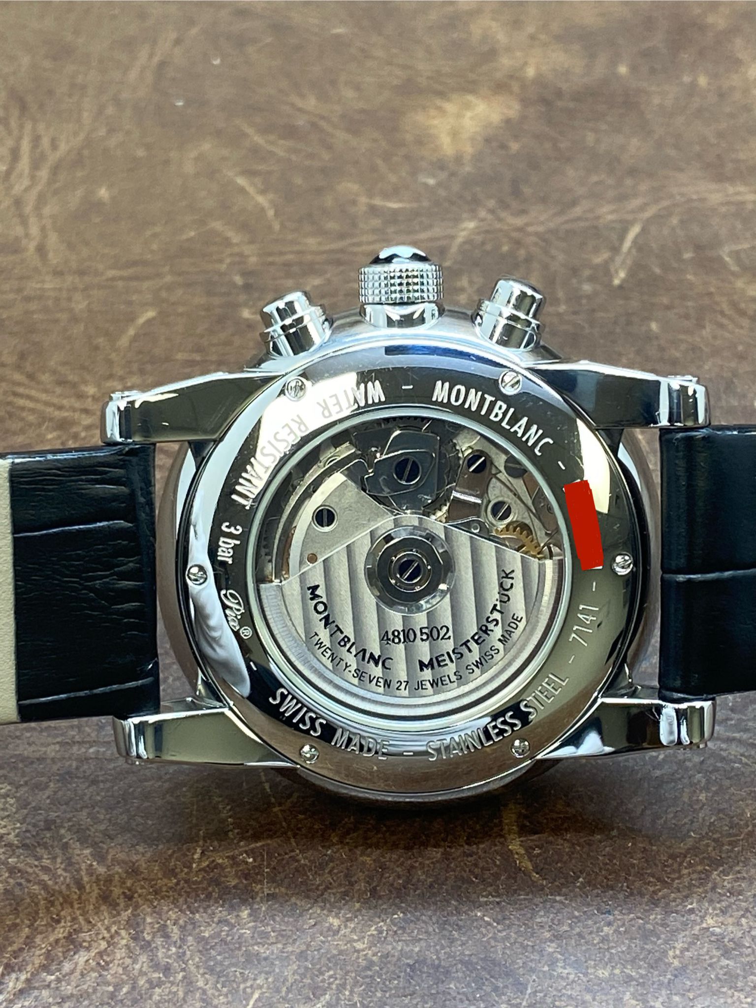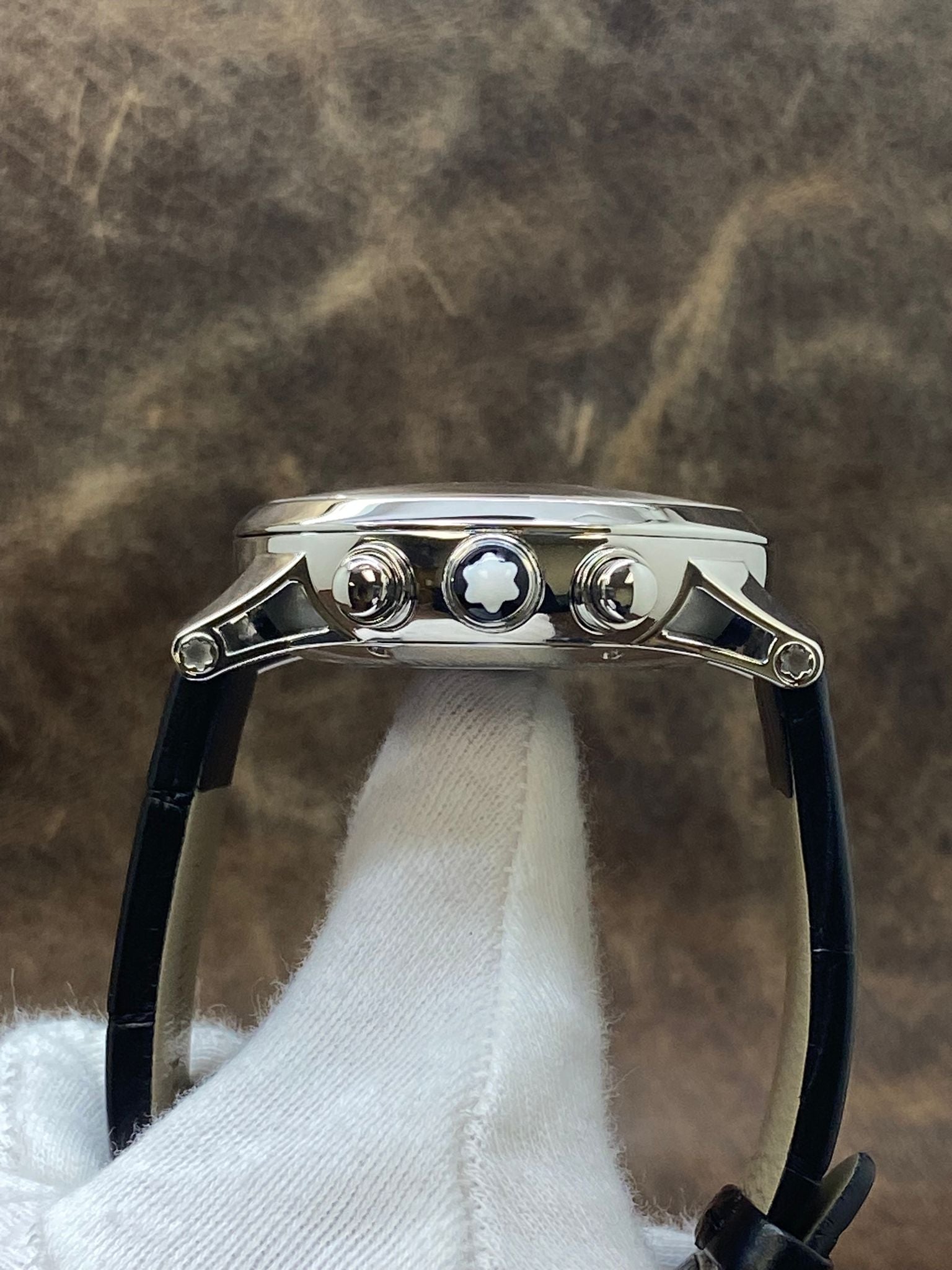 This pre-owned Montblanc Timewalker Chronograoh 7141 is in excellent condition and comes with: original Montblanc box only. The watch comes with a custom black leather strap with original steel tang buckle. Max wrist size: 7.5 in.