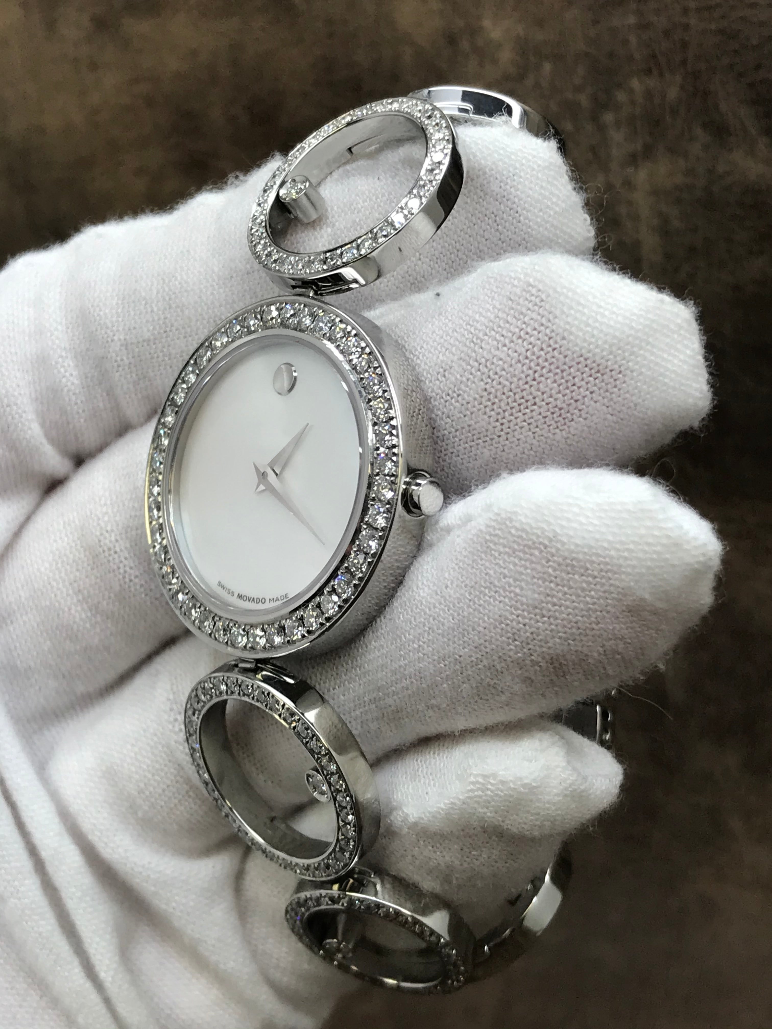 Steel case with a stainless steel bracelet. Fixed bezel set with diamonds diamond set bezel. Mother of pearl dial with silver tone hands and none hour markers. Dial type: analog. Quartz movement with about of power reserve. Scratch resistant sapphire crystal. Push/pull crown. Solid case back. Case size: 30 mm. Case thickness: 5.6 mm. Round case shape. Band width: integrated mm. Fold over clasp. Water resistant at none. Functions: hours, minutes. Movado Ono 84 E4 1856 Mother of Pearl Dial Quartz Women's Watch.