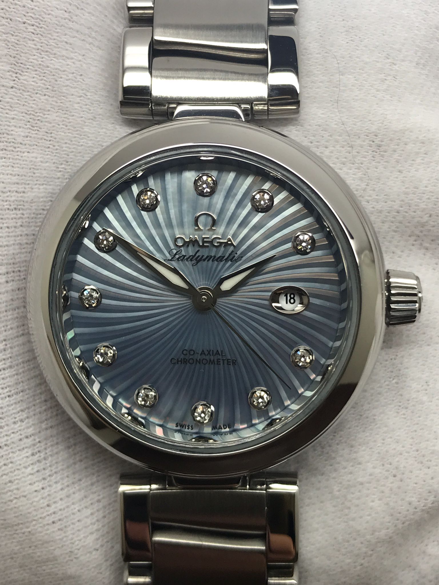 Stainless steel case with a stainless steel bracelet. Fixed stainless steel bezel. Blue wave diamond dial with luminous silver-tone hands and diamond hour markers. Dial type: analog. Omega 8520 automatic movement with about 50 of power reserve. Domed scratch‑resistant sapphire crystal with anti‑reflective treatment on both sides crystal. Screw down crown. Transparent case back. Case size: 34 mm. Case thickness: 12 mm. Round case shape. Band width: mm. Butterfly clasp. Water resistant at 100 meters / 300 feet. Functions: date, hour, minute, seconds, chronometer. Omega De Ville Ladymatic 425.30.34.20.57.002 Blue Wave Diamond Dial Automatic Women's Watch.