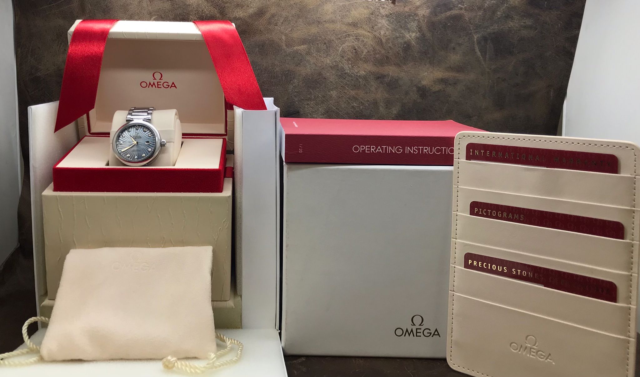 - original Omega double box, pictogram, precious stones & warranty card dated 2017