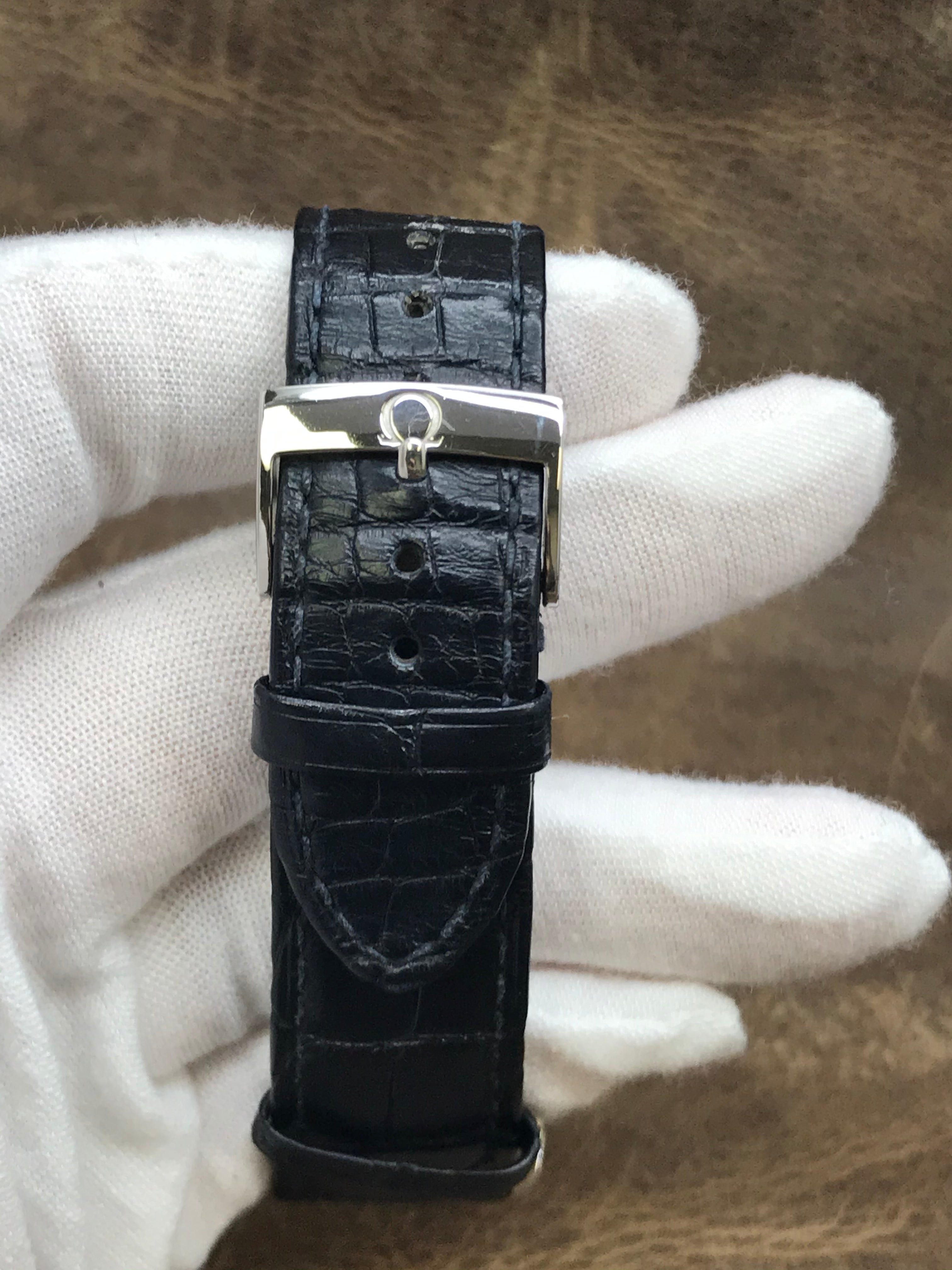 Stainless steel case with a leather strap. Fixed stainless steel bezel. Blue dial with silver tone hands and Roman and index hour markers. Dial type: lacquered blue. Omega calibre 2500 automatic movement with about 48 of power reserve. Scratch resistant sapphire crystal. Pull/push crown. Solid case back. Case size: 39.5 mm. Case thickness: 10.35 mm. Round case shape. Band width: 20 mm. Buckle clasp. Water resistant at 30m/100ft. Functions: hours, minutes, seconds, date. Omega De Ville Prestige Prestige Orbis 424.13.40.20.03.003 Blue Dial Automatic Men's Watch.