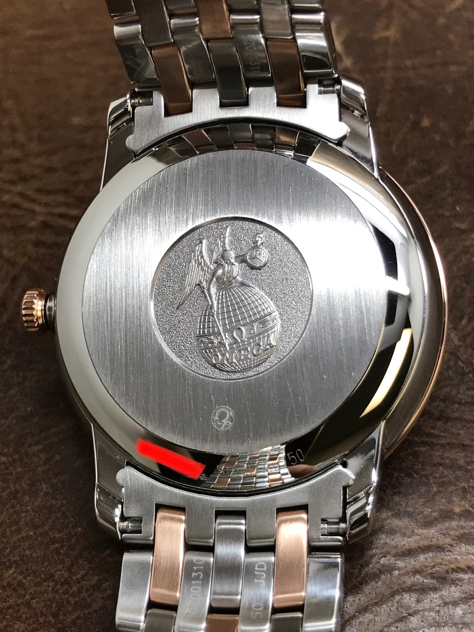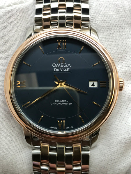 Stainless steel case with a stainless steel & red gold bracelet. Fixed 18k red gold bezel. Blue dial with gold-tone hands and index & Roman numeral hour markers. Dial type: analog. Co-axial calibre 2500. Automatic movement with about 48 of power reserve. Domed, scratch‑resistant sapphire crystal with anti‑reflective treatment inside crystal. Pull/push crown. Solid case back. Case size: 37 mm. Case thickness: 9.9 mm. Round case shape. Band width: mm. Sliding clasp clasp. Water resistant at 30 meters / 100 feet. Functions: date, hour, minute, seconds, chronometer. Omega De Ville Prestige 424.20.37.20.03.002 Blue Dial Automatic Men's Watch.