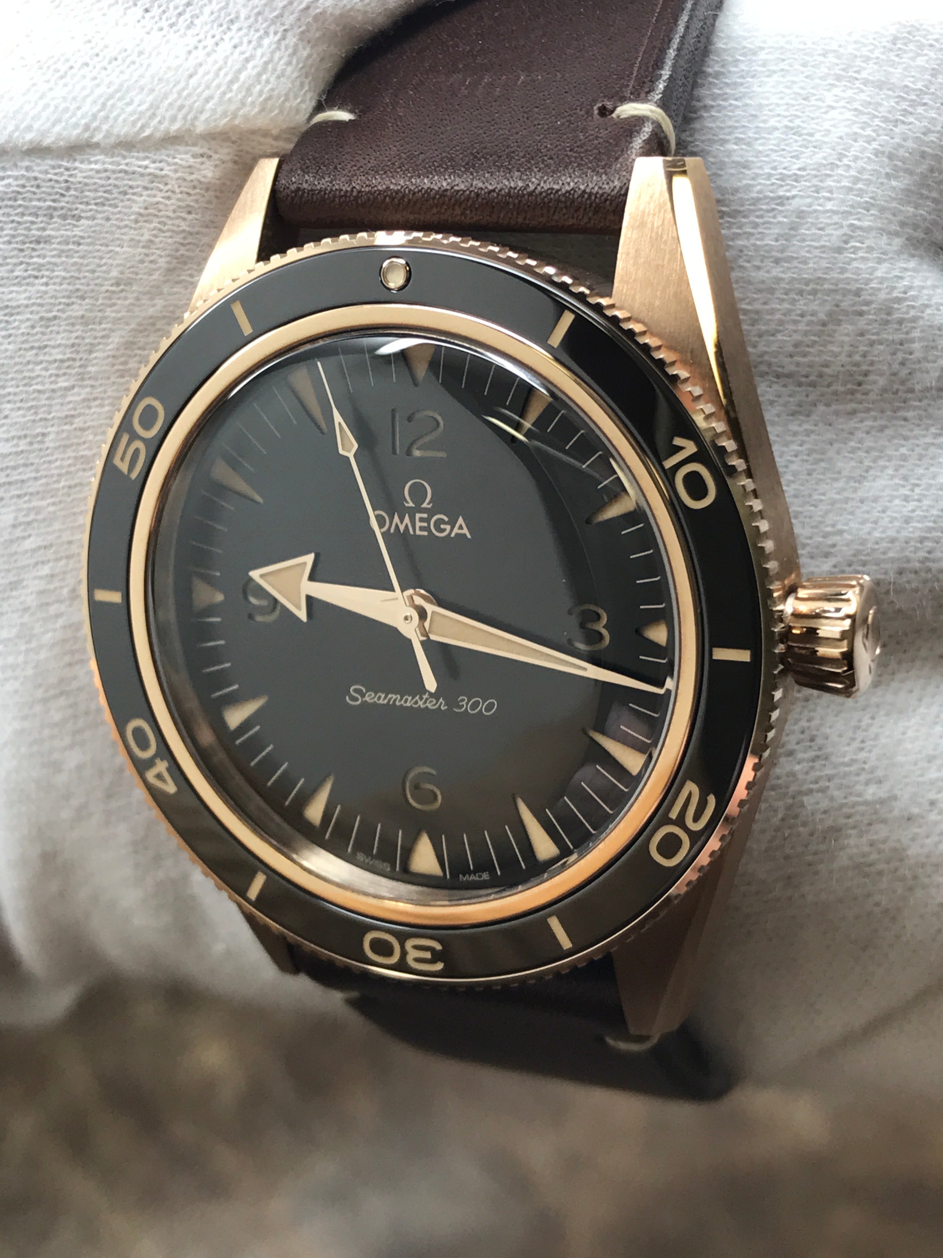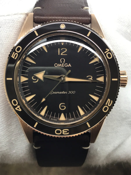 9k bronze gold case with a leather strap. Uni-directional rotating 9k bronze gold with black ceramic top ring bezel. Black dial with luminous gold-tone hands and index & 3,6,9,12 Arabic numeral hour markers. Dial type: analog. Omega co-axial master chronometer calibre 8912 automatic movement with about 60 of power reserve. Domed, scratch‑resistant sapphire crystal with anti‑reflective treatment inside crystal. Screw down crown. Transparent case back. Case size: 41 mm. Case thickness: 14.4 mm. Round case shape. Band width: mm. Tang buckle clasp. Water resistant at 300 meters / 1000 feet. Functions: hour, minute, second, co-axial escapement, chronometer. Omega Seamaster 300 234.92.41.21.10.001 Black Dial Automatic Men's Watch.