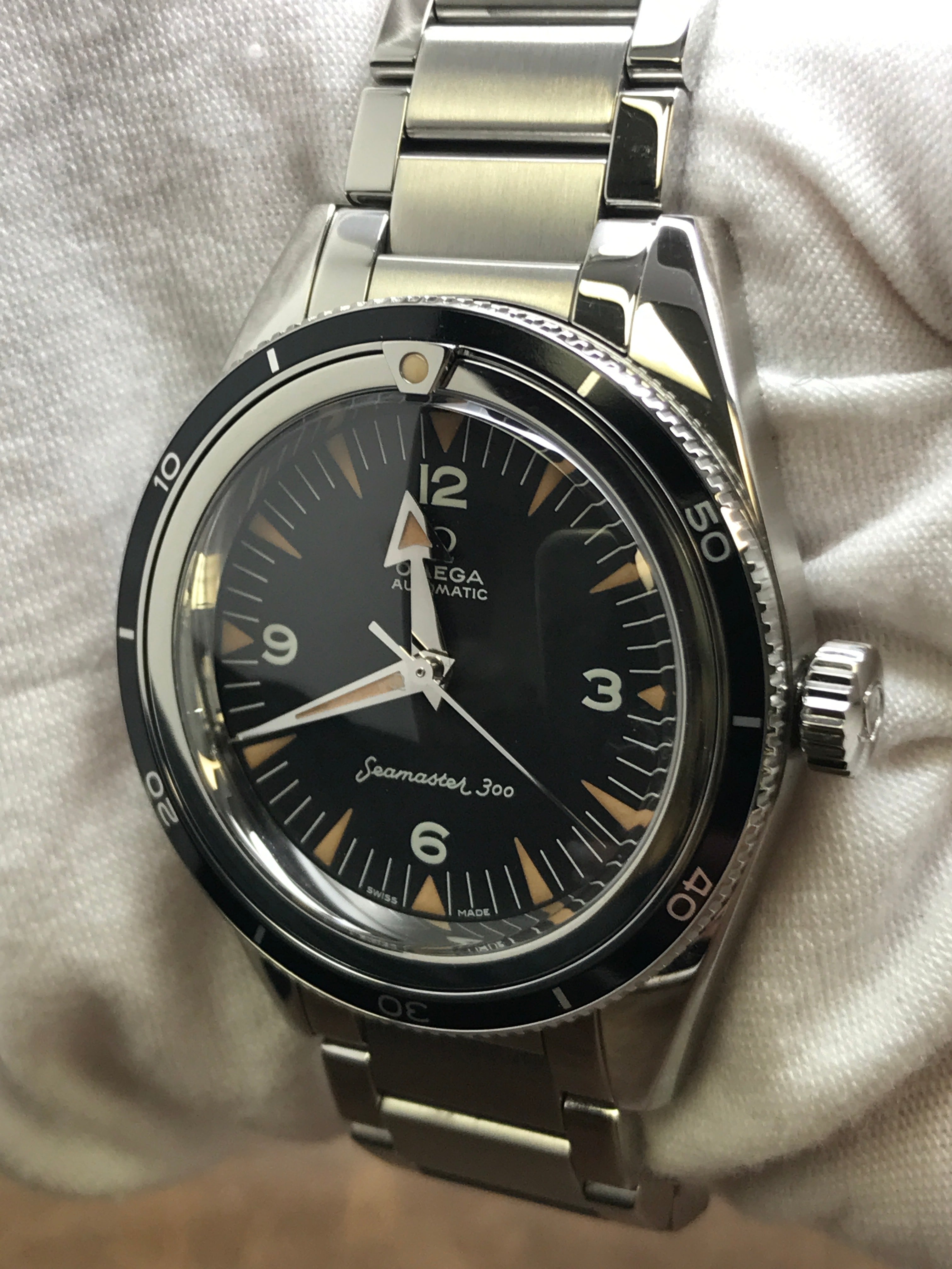 Stainless steel case with a stainless steel bracelet. Bi-directional rotating stainless steel bezel. Black dial with silver tone luminous arrow-shaped hands and luminous index with Arabic 3, 6, 9, 12 hour markers. Dial type: analog. Calibre Omega 8806 automatic movement with about 55 hours of power reserve. Domed anti‑reflective, scratch‑resistant sapphire crystal crystal. Screw down crown. Solid case back. Case size: 39 mm. Case thickness: 14.1 mm. Round case shape. Band width: mm. Push button deployant clasp. Water resistant at 300 meters / 1000 feet. Functions: hours, minutes, seconds. Omega Seamaster 300m 1957 Trilogy L.E 234.10.39.20.01.001 Black Dial Automatic Men's Watch.