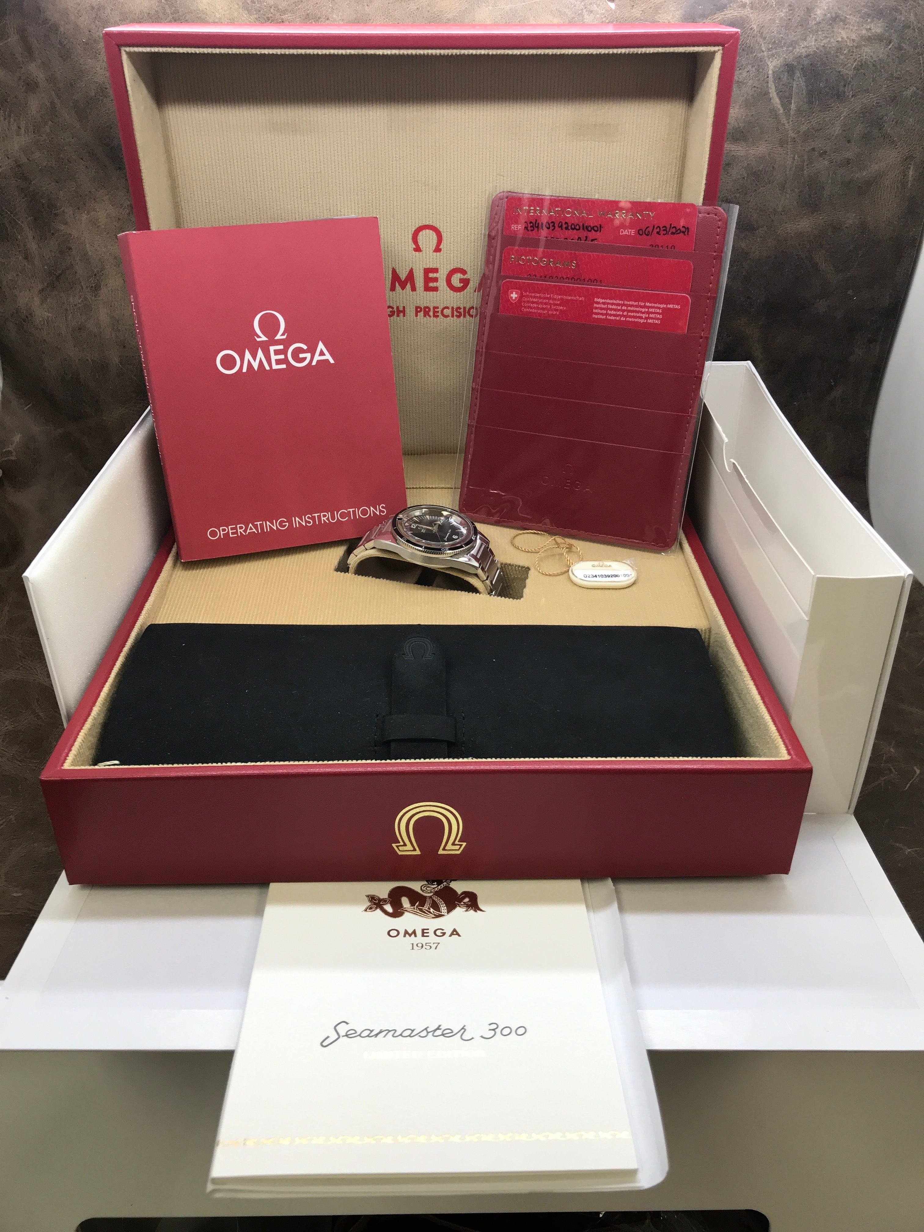 - original Omega double box, tags, booklet, L.E cert, 2 extra straps & tools and 3 matching cards dated June 2021