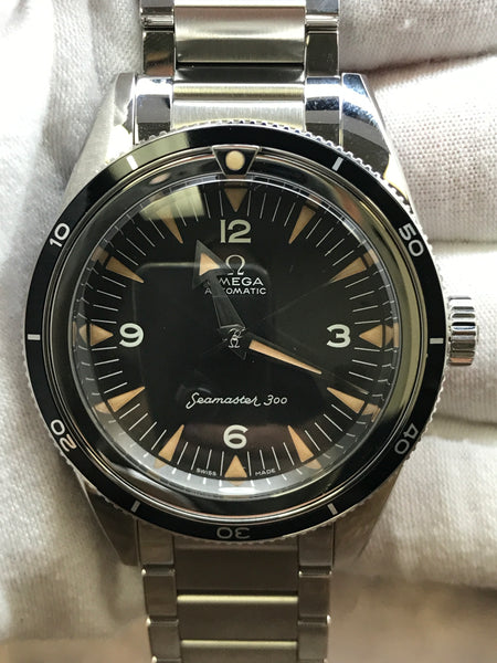 Stainless steel case with a stainless steel bracelet. Bi-directional rotating stainless steel bezel. Black dial with luminous silver-tone arrow-shaped hands and luminescent Arabic numerals and indices hour markers. Dial type: analog. Calibre Omega 8806 automatic movement with about 55 hours of power reserve. Domed anti‑reflective, scratch‑resistant sapphire crystal crystal. Screw down crown. Solid case back. Case size: 39 mm. Case thickness: 14.1 mm. Round case shape. Band width: mm. Push button deployant clasp. Water resistant at 300 meters / 1000 feet. Functions: hours, minutes, seconds. Omega Seamaster 300m 1957 Trilogy 234.10.39.20.01.001 Black Dial Automatic Men's Watch.