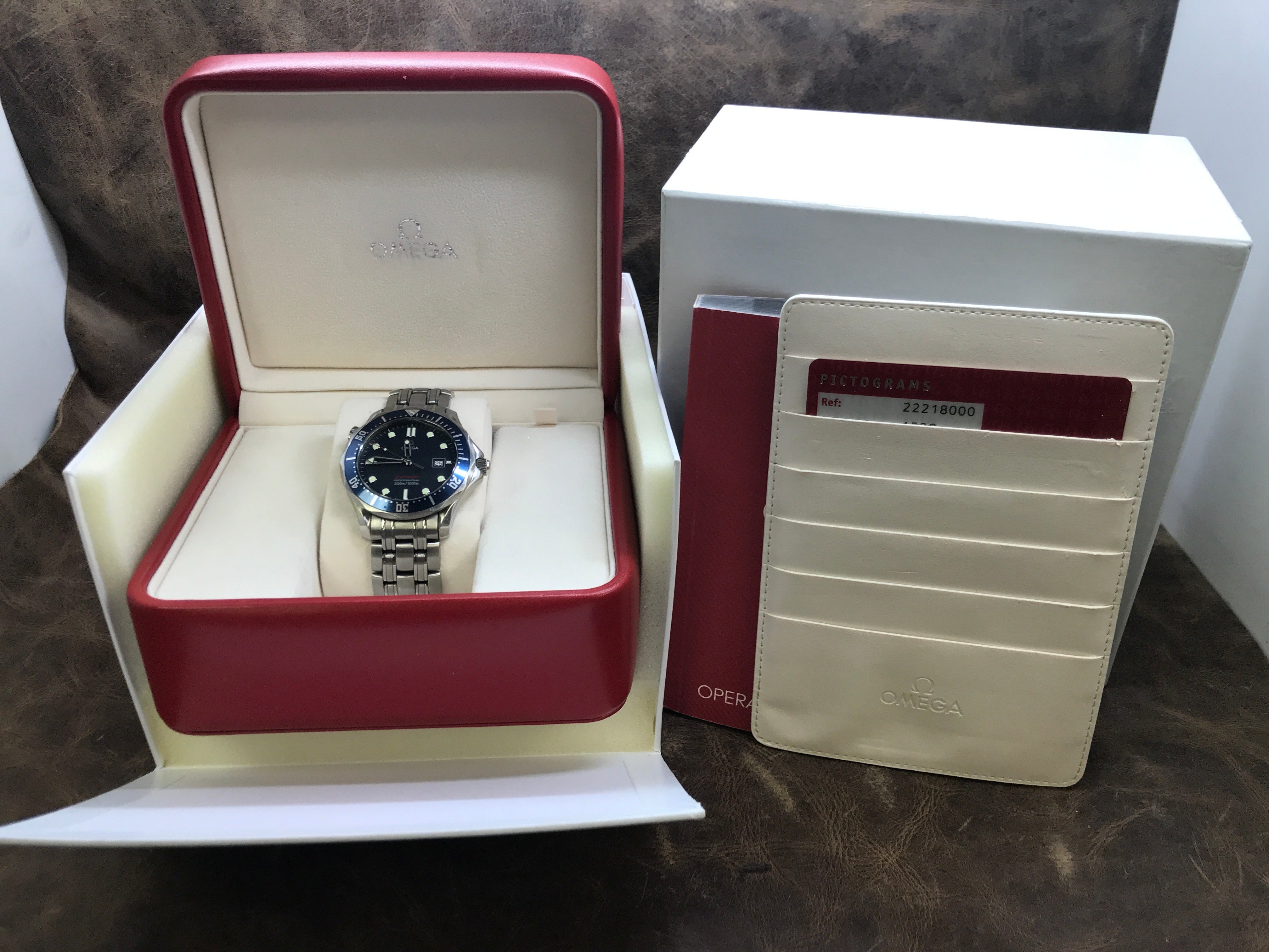 - original Omega double box, booklet & pictograms card