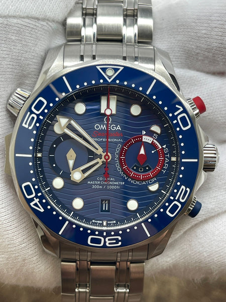 Stainless steel case with a stainless steel bracelet. Uni-directional rotating stainless steel with an inlaid blue ceramic ring bezel. Blue dial with luminous silver-tone hands and dot hour markers. Dial type: analog. Omega calibre 9900 automatic movement with about 60 hours of power reserve. Scratch resistant sapphire crystal. Screw down crown. Transparent case back. Case size: 44 mm. Case thickness: 17.2 mm. Round case shape. Band width: mm. Deployment clasp. Water resistant at 300 meters / 1000 feet. Functions: date, hour, minute, second, chronograph, chronometer, anti-magnetic, helium escape valve, regatta timing. Omega Seamaster Diver 300M America’s Cup 210.30.44.51.03.002 Blue Dial Automatic Men's Watch.