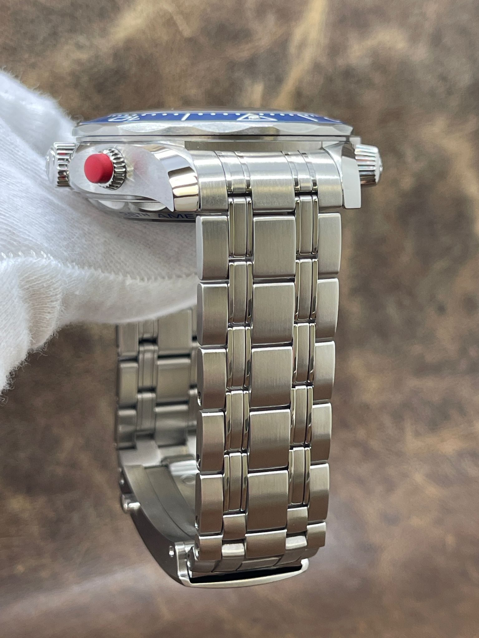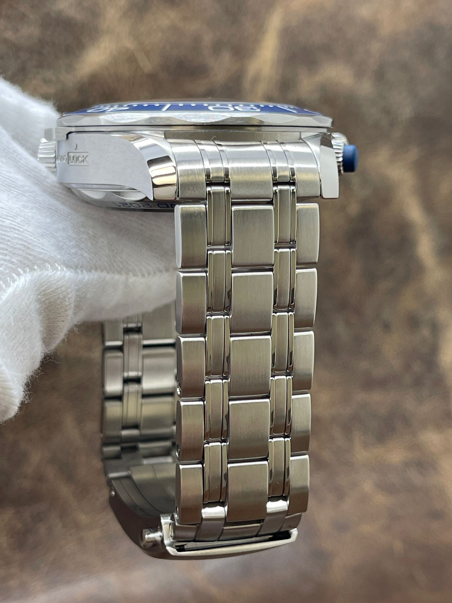 - Bezel Material Stainless Steel with an inlaid Blue Ceramic Ring