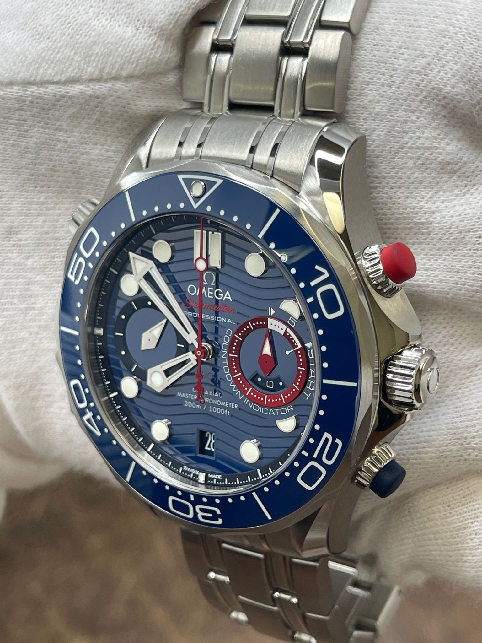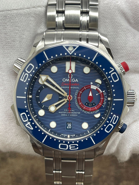 Stainless steel case with a stainless steel bracelet. Uni-directional rotating stainless steel with a blue ceramic top ring bezel. Blue dial with luminous silver-tone skeleton hands and luminous dot & index hour markers. Dial type: analog. Omega calibre 9900 automatic movement with about 60 hours of power reserve. Domed scratch‑resistant sapphire crystal with anti‑reflective treatment on both sides crystal. Screw down crown. Transparent case back. Case size: 44 mm. Case thickness: 17.2 mm. Round case shape. Band width: mm. Fold over with push button release clasp. Water resistant at 300 meters / 1000 feet. Functions: date, hour, minute, second, chronograph, chronometer, anti-magnetic, helium escape valve, regatta timing. Omega Seamaster Diver 300M America’s Cup 210.30.44.51.03.002 Blue Dial Automatic Men's Watch.
