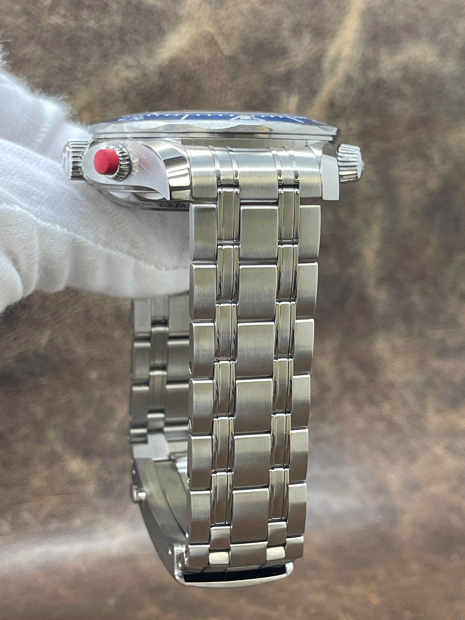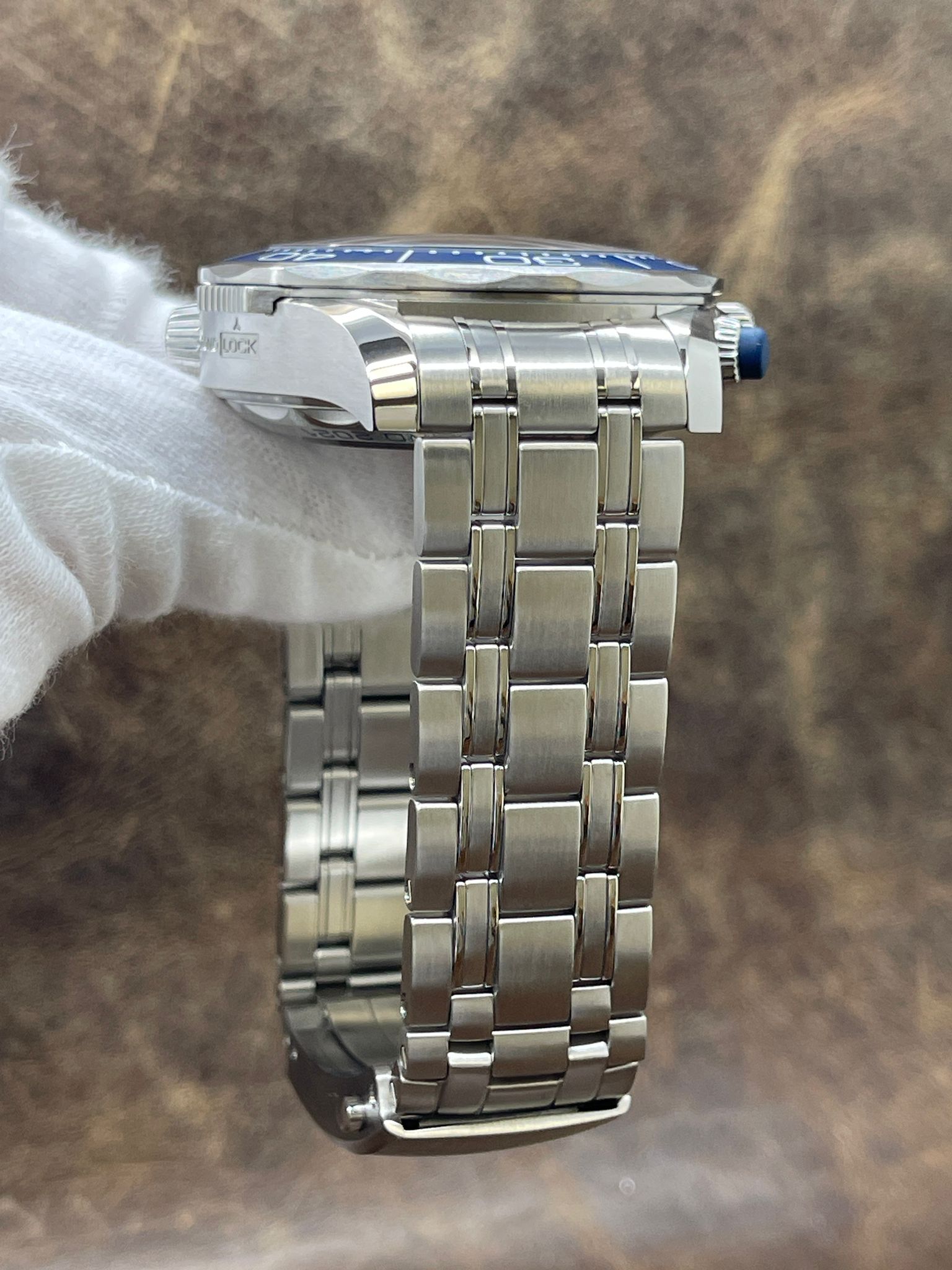 - Bezel Material Stainless Steel with a Blue Ceramic Top Ring
