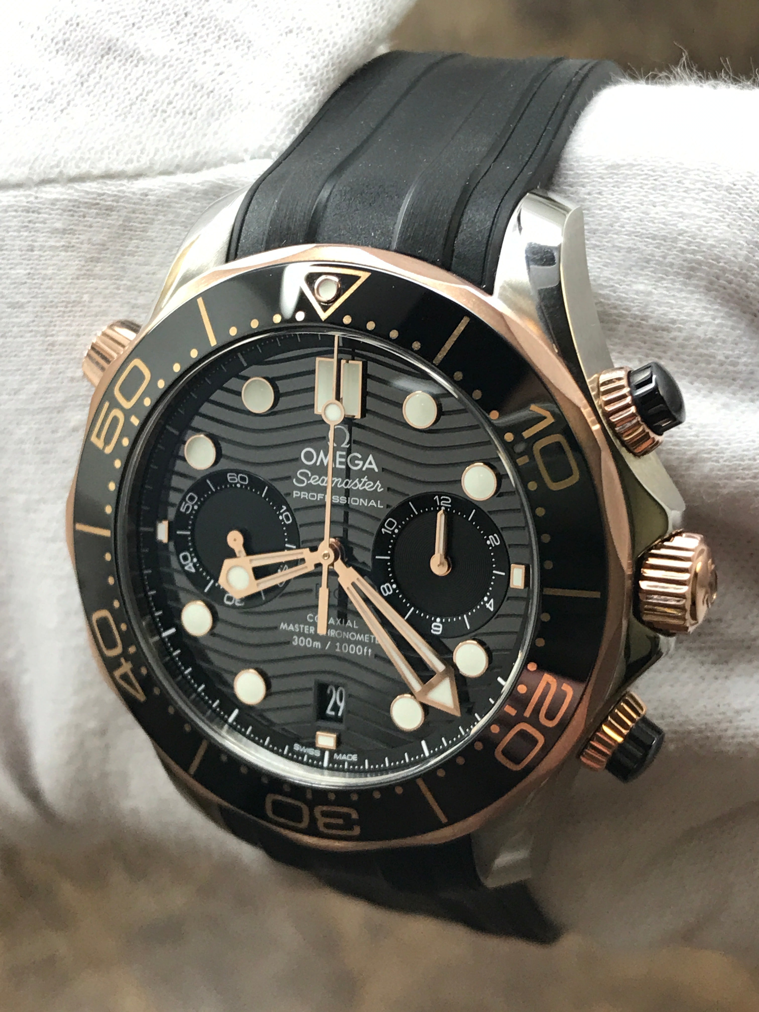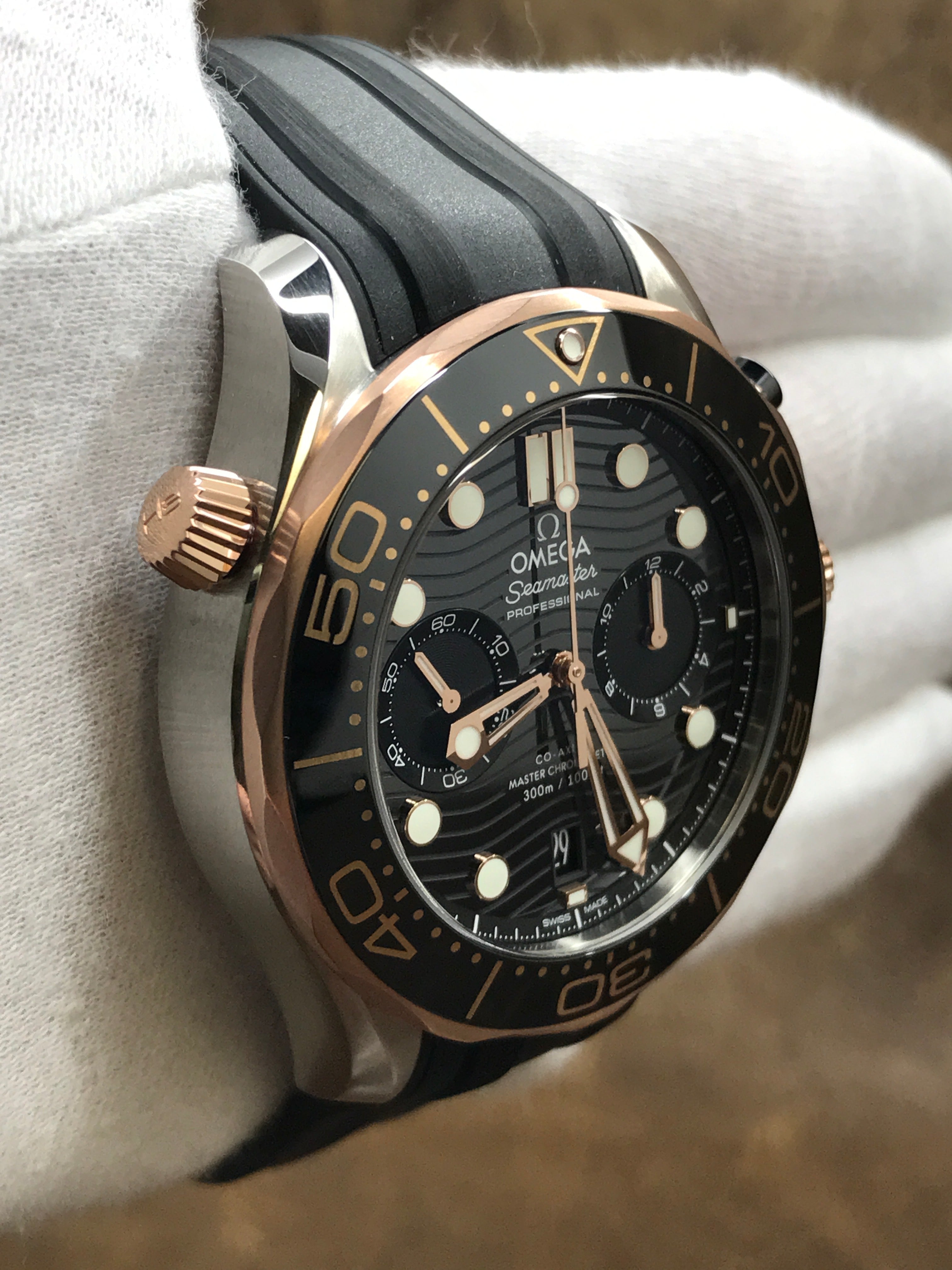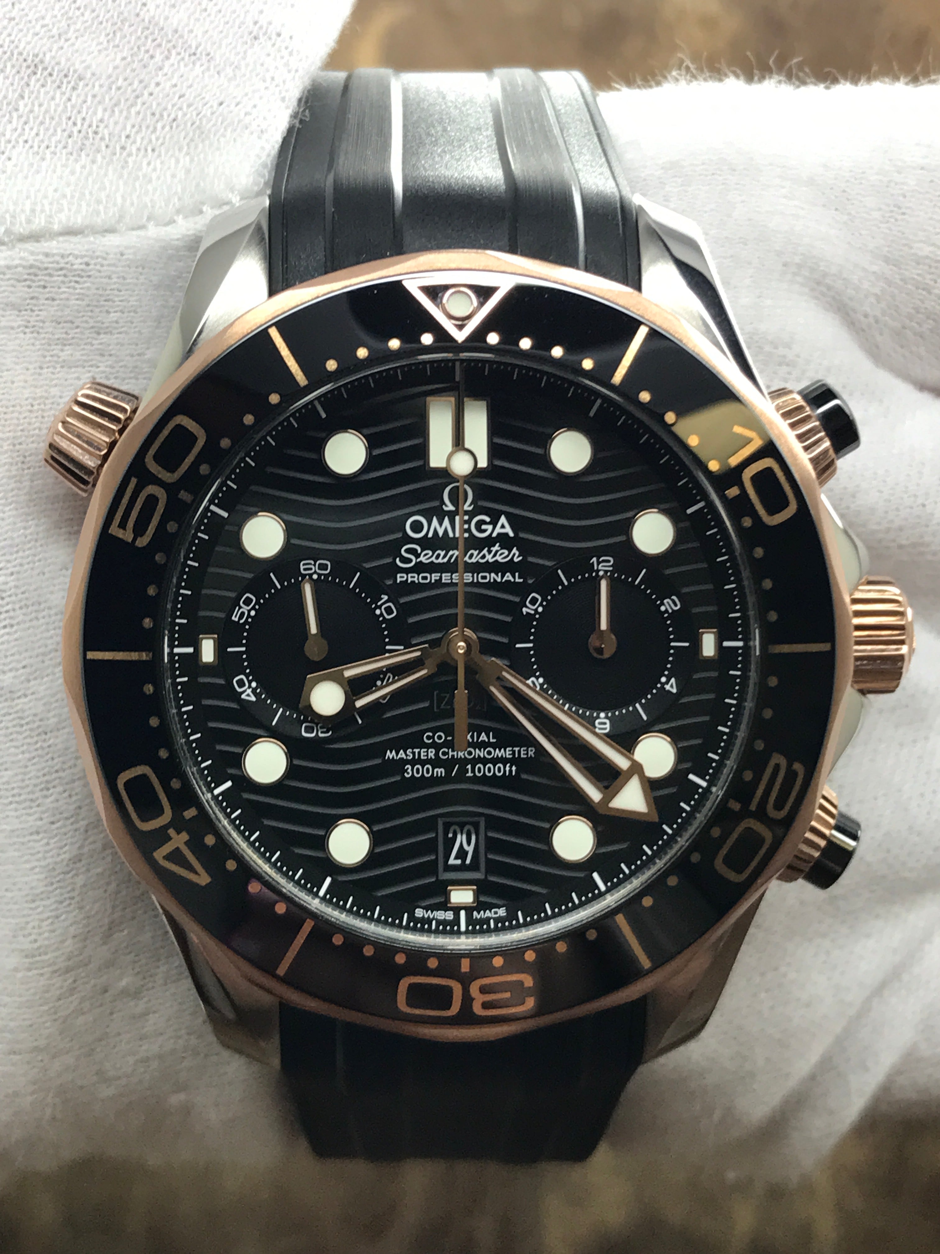 Steel & sedna gold case with a rubber strap. Uni-directional rotating 18kt sedna gold with a black ceramic ring bezel. Black dial with luminous rose gold-tone hands and luminous dot & index hour markers. Dial type: analog. Omega master chronometer calibre 9900 automatic movement with about 60 of power reserve. Domed scratch‑resistant sapphire crystal with anti‑reflective treatment on both sides crystal. Screw down crown. Transparent case back. Case size: 44 mm. Case thickness: 17.2 mm. Round case shape. Band width: mm. Tang buckle clasp. Water resistant at 300 meters / 1000 feet. Functions: date, hour, minute, seconds, chronograph, time zone function. Omega Seamaster Diver 300M 210.22.44.51.01.001 Black Dial Automatic Men's Watch.