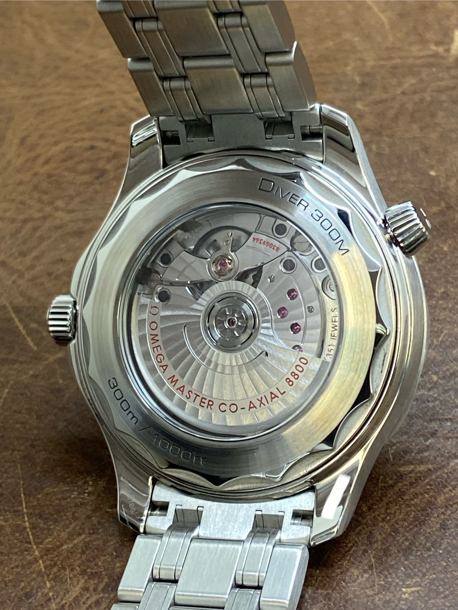 Stainless steel case with a stainless steel bracelet. Uni-directional rotating stainless steel with a black ceramic top ring bezel. White dial with black luminescent sword-shaped hands and round hour markers. Dial type: analog. Omega 8800 automatic movement with about 55 hours of power reserve. Sapphire crystal. Screw down crown. Transparent case back. Case size: 42 mm. Case thickness: 13.6 mm. Round case shape. Band width: mm. Deployment clasp. Water resistant at 300 meters / 1000 feet. Functions: date, hour, minute, seconds, helium escape valve, anti-magnetic, chronometer. Omega Seamaster Diver 300M 210.30.42.20.04.001 White Dial Automatic Men's Watch.