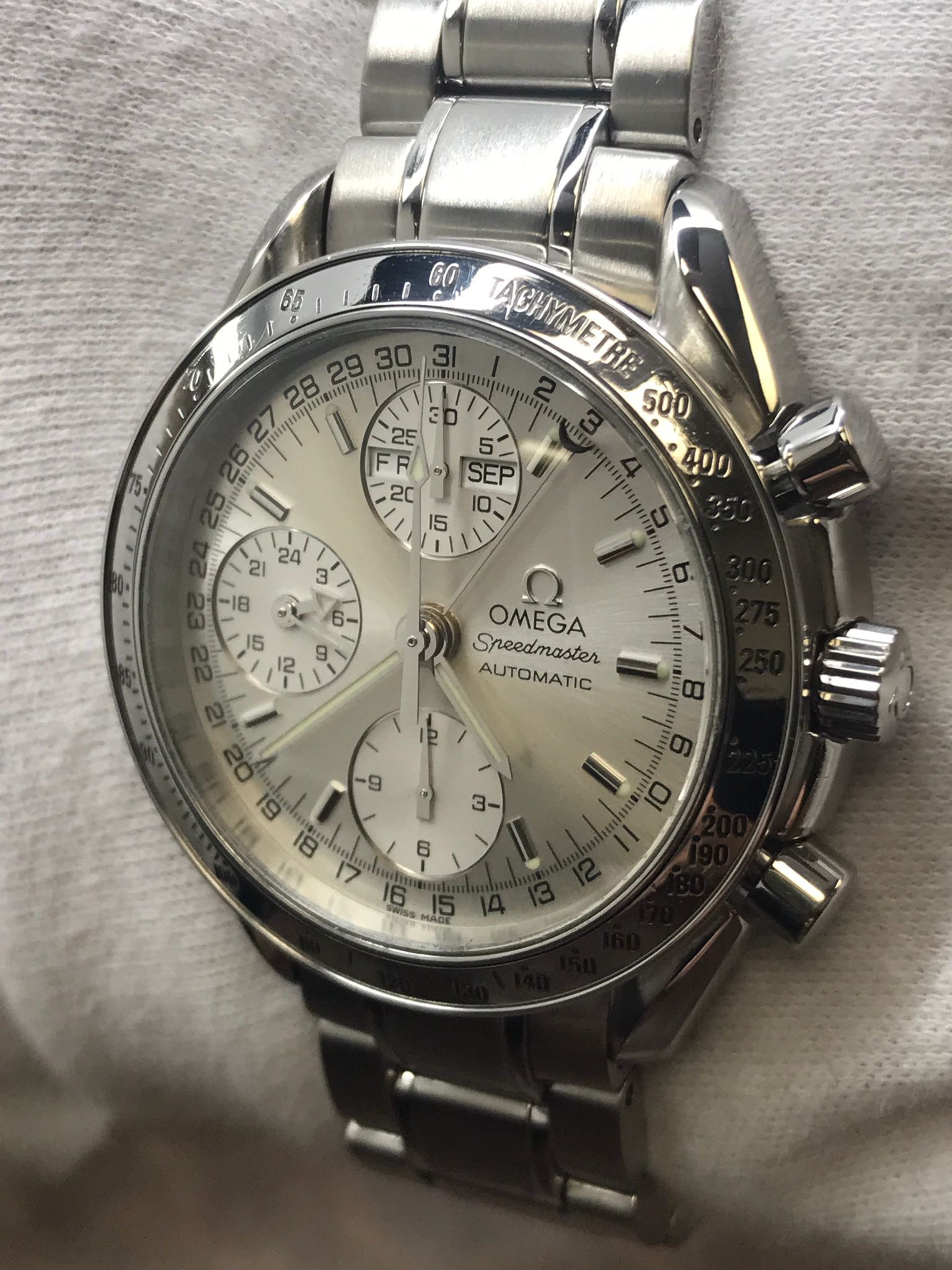 This pre-owned Omega Speedmaster Day-Date 3523.30.00 is in very good condition and comes with: original Omega double box, tag, booklet and warranty card. Max wrist size: 6.5 in.