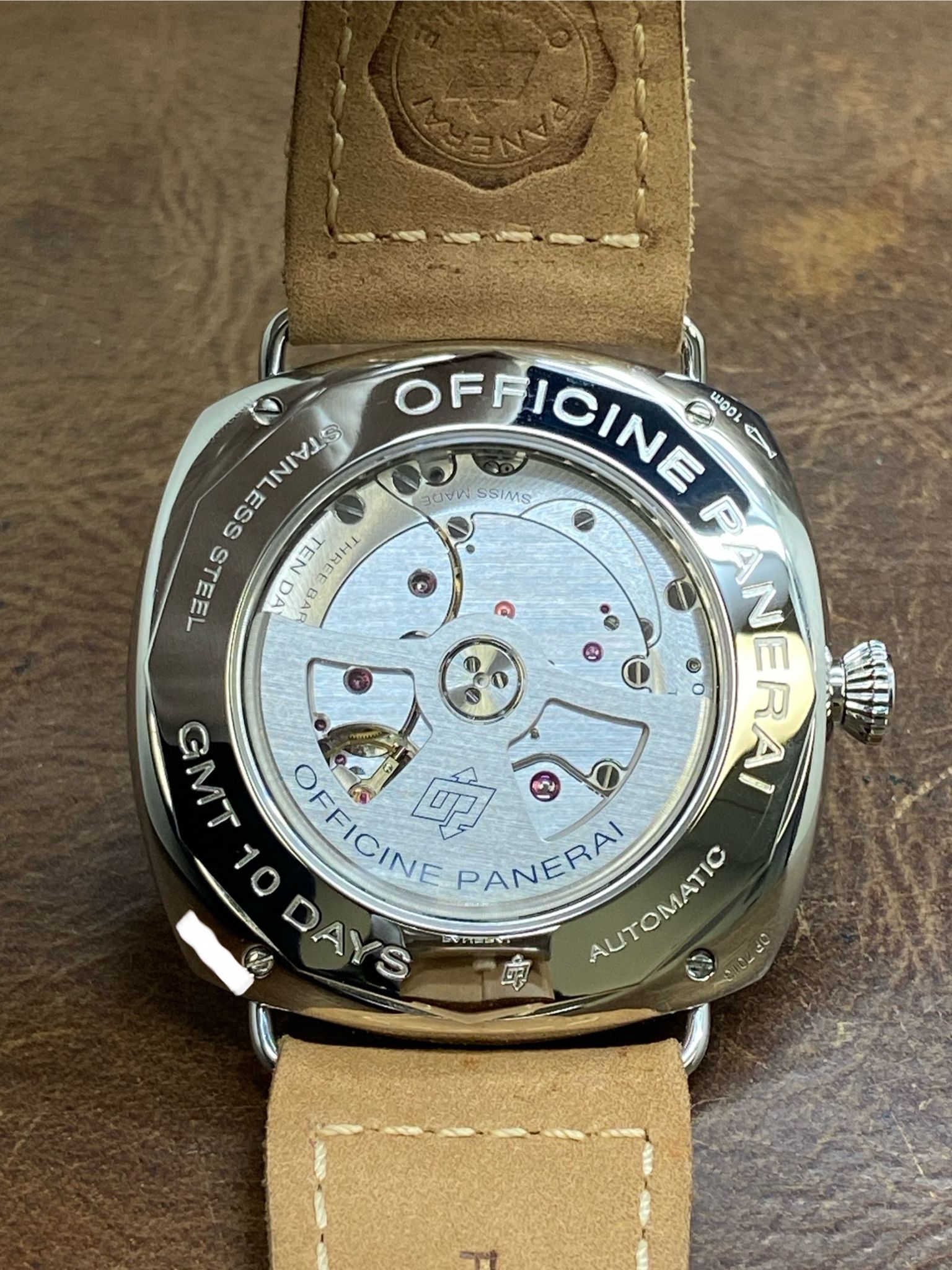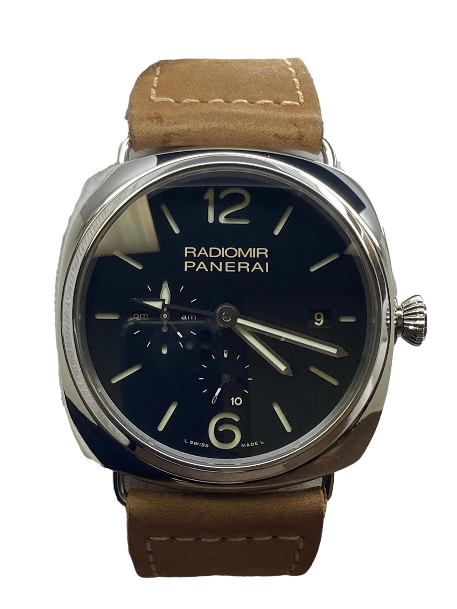 Stainless steel case with a leather strap. Smooth stainless steel bezel. Black dial with luminous silver-tone hands and 6 & 12 Arabic and index hour markers. Dial type: analog. Caliber p.2003/6 automatic movement with about 10 days of power reserve. Scratch resistant sapphire crystal. Screw down crown. Transparent case back. Case size: 47 mm. Case thickness: 17 mm. Cushion case shape. Band width: mm. Tang buckle clasp. Water resistant at 100 meters / 330 feet. Functions: gmt second time zone, date, hour, minute, seconds, power reserve, am/pm indicator. Panerai Radiomir 10 Days GMT PAM00323 Black Dial Automatic Men's Watch.